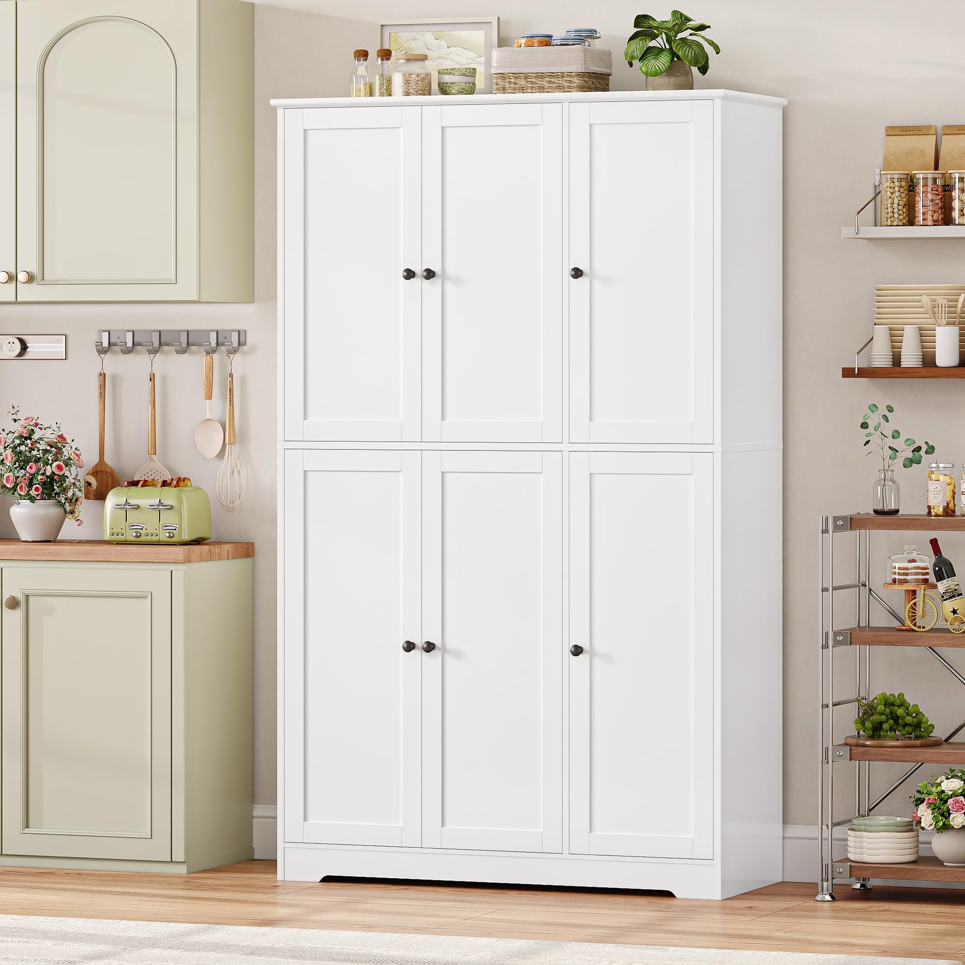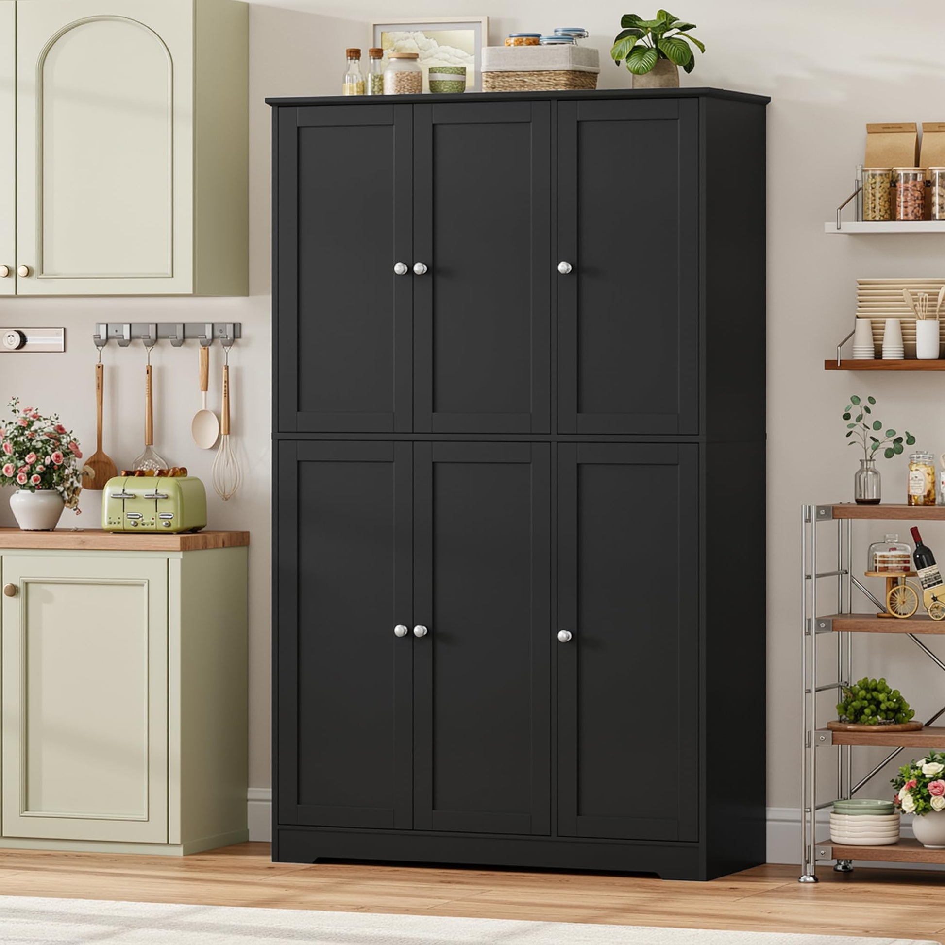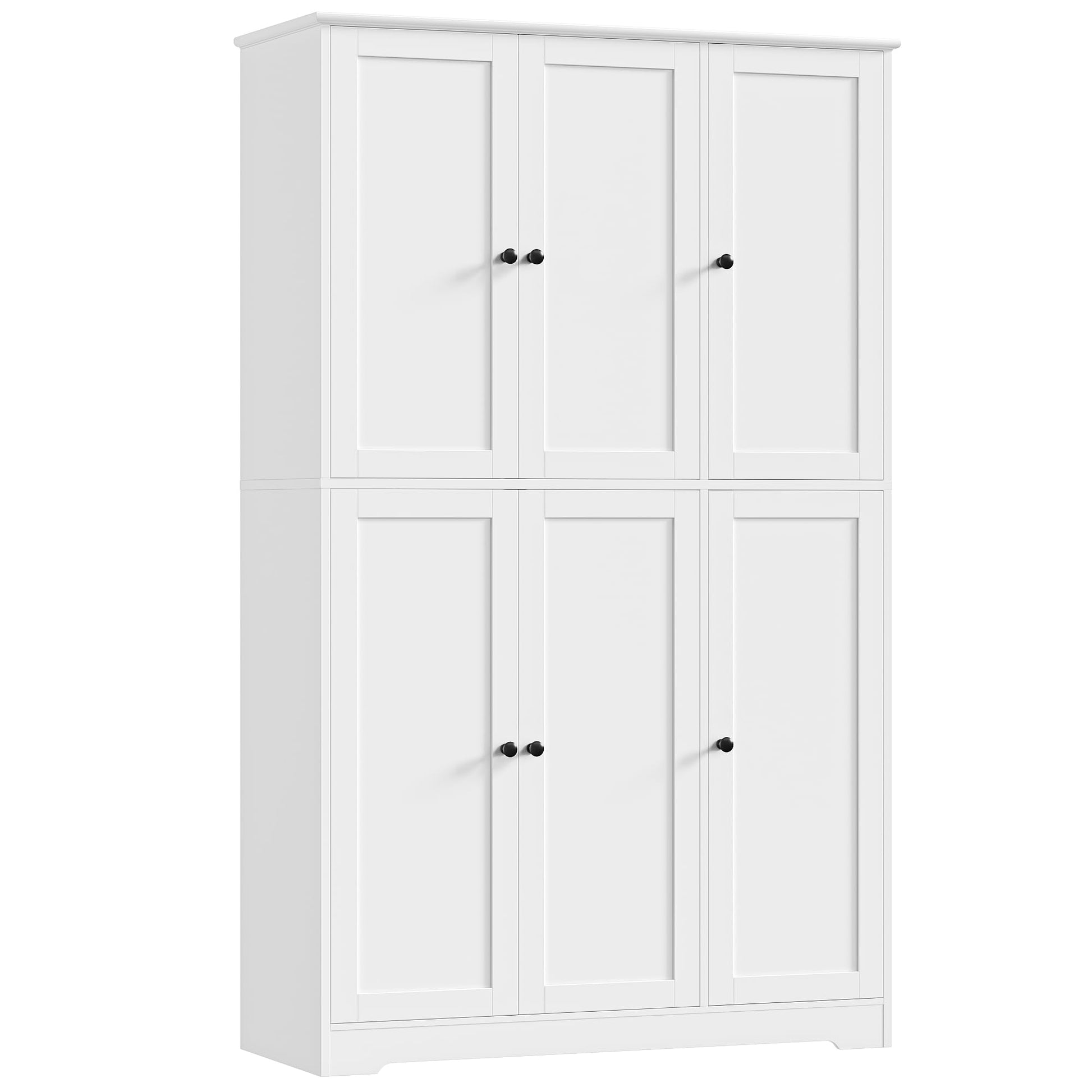 - VERSATILE STORAGE SPACE This 180 cm high multi-purpose 6 door cabinet impresses with its thoughtful and practical design. The top cabinet doors have 2 compartments with a distance of up to 36 cm, which can easily accommodate higher items such as A4 folders and large books. The left lower cabinet doors offer three compartments at a distance of 31 cm and thus enough space for kitchen appliances, cleaning utensils and much more. The right lower cabinet door of this tall cabinet is equipped with two removable and 6 cm height adjustable shelves, which are ideal for higher items such as vacuum cleaners, umbrellas and fishing rods