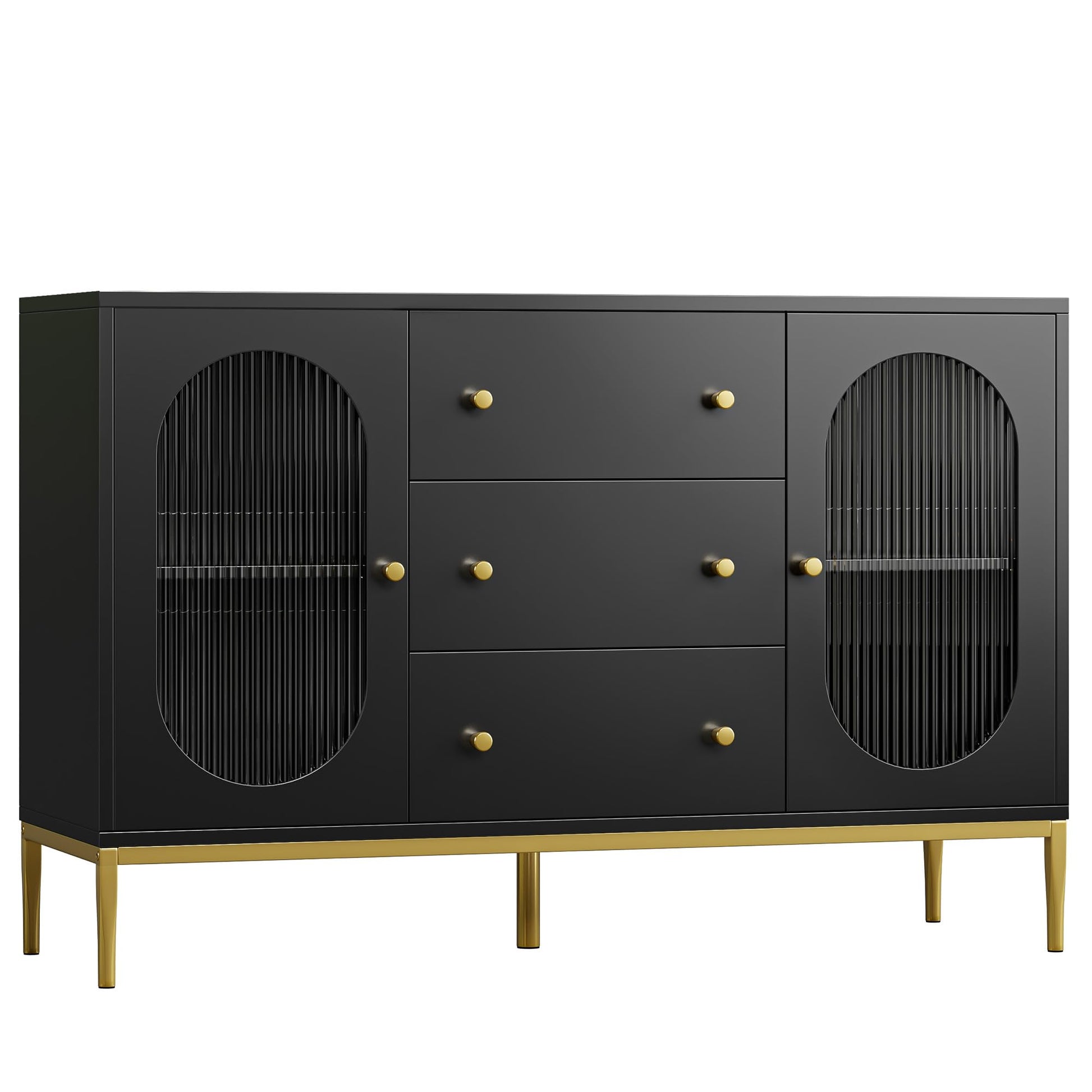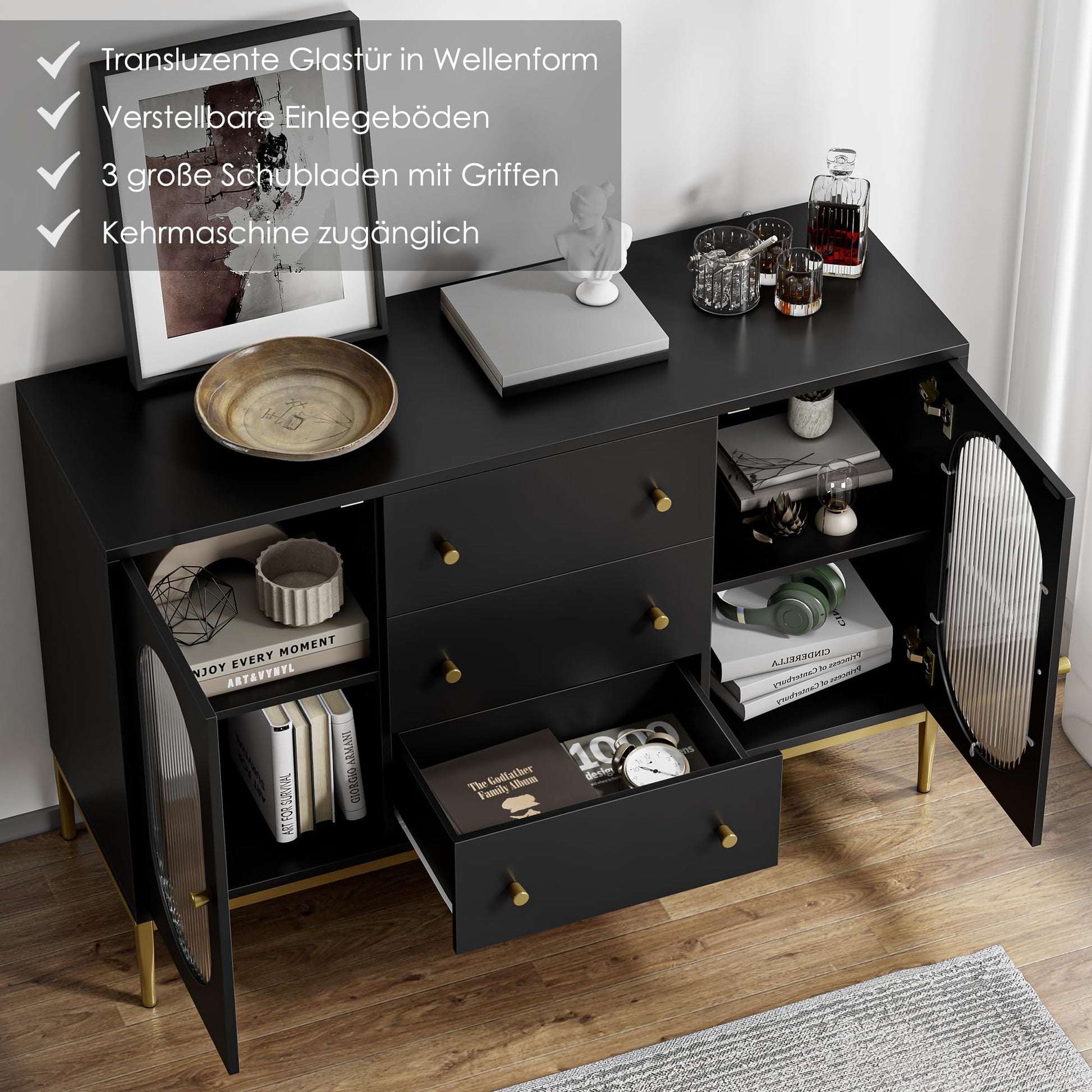 FirFurd Sideboard 120 cm Wide Kitchen Cabinet with Worktop Buffet Cabinet with 2 Glass Doors 3 Drawers Kitchen Buffet with Adjustable Shelf for Kitchen Dining Room Living Room 120 x 38 x 80 cm Black