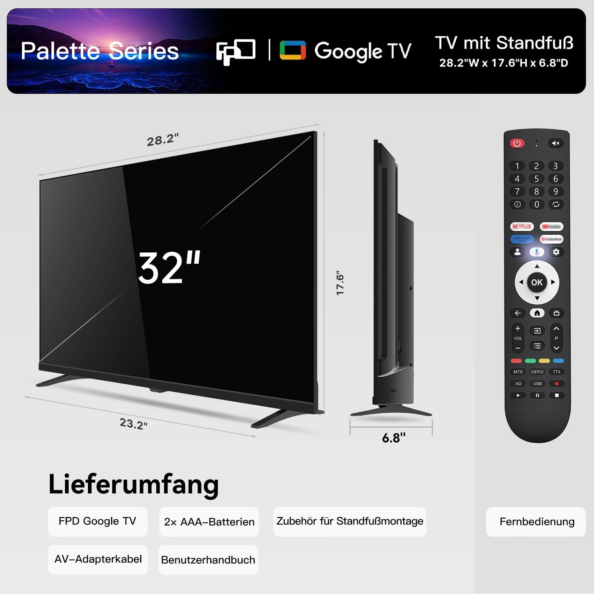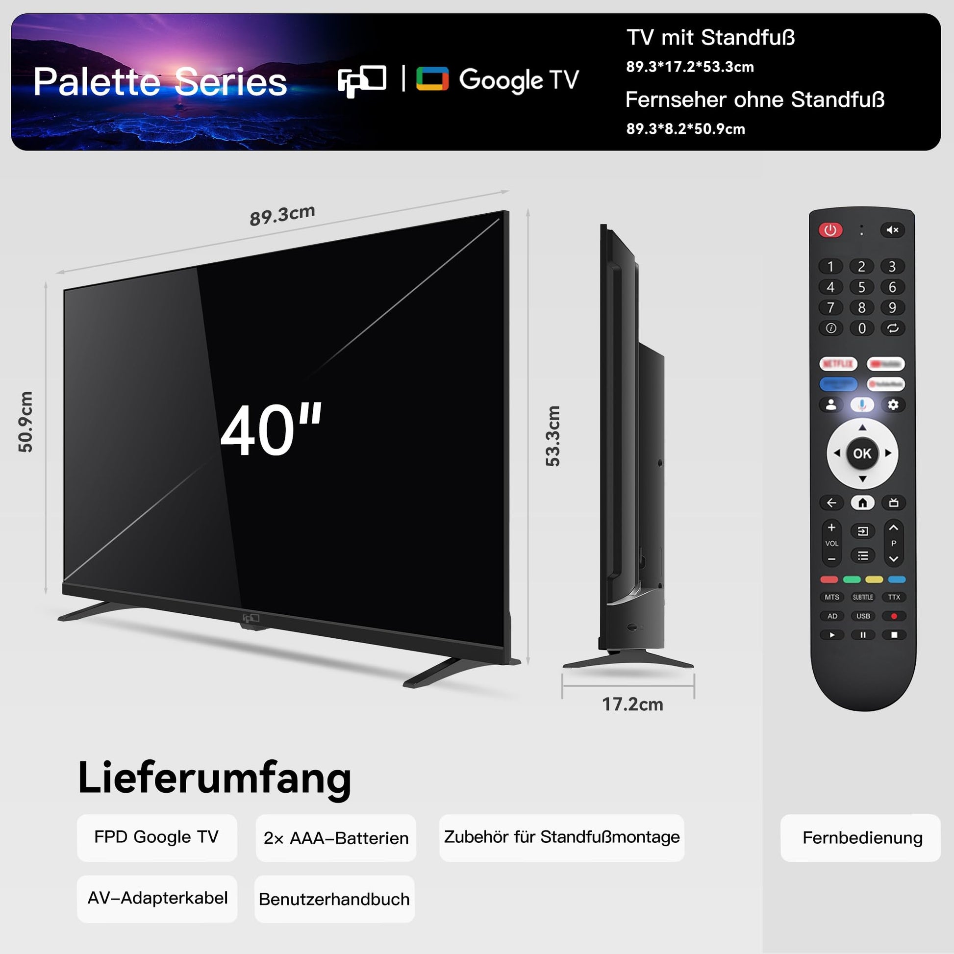 - Included in the FPD Google TV package: 43 inch smart TV, remote control with 2 AAA batteries, stand mounting accessories, AV adapter cable and user manual (English language not guaranteed)