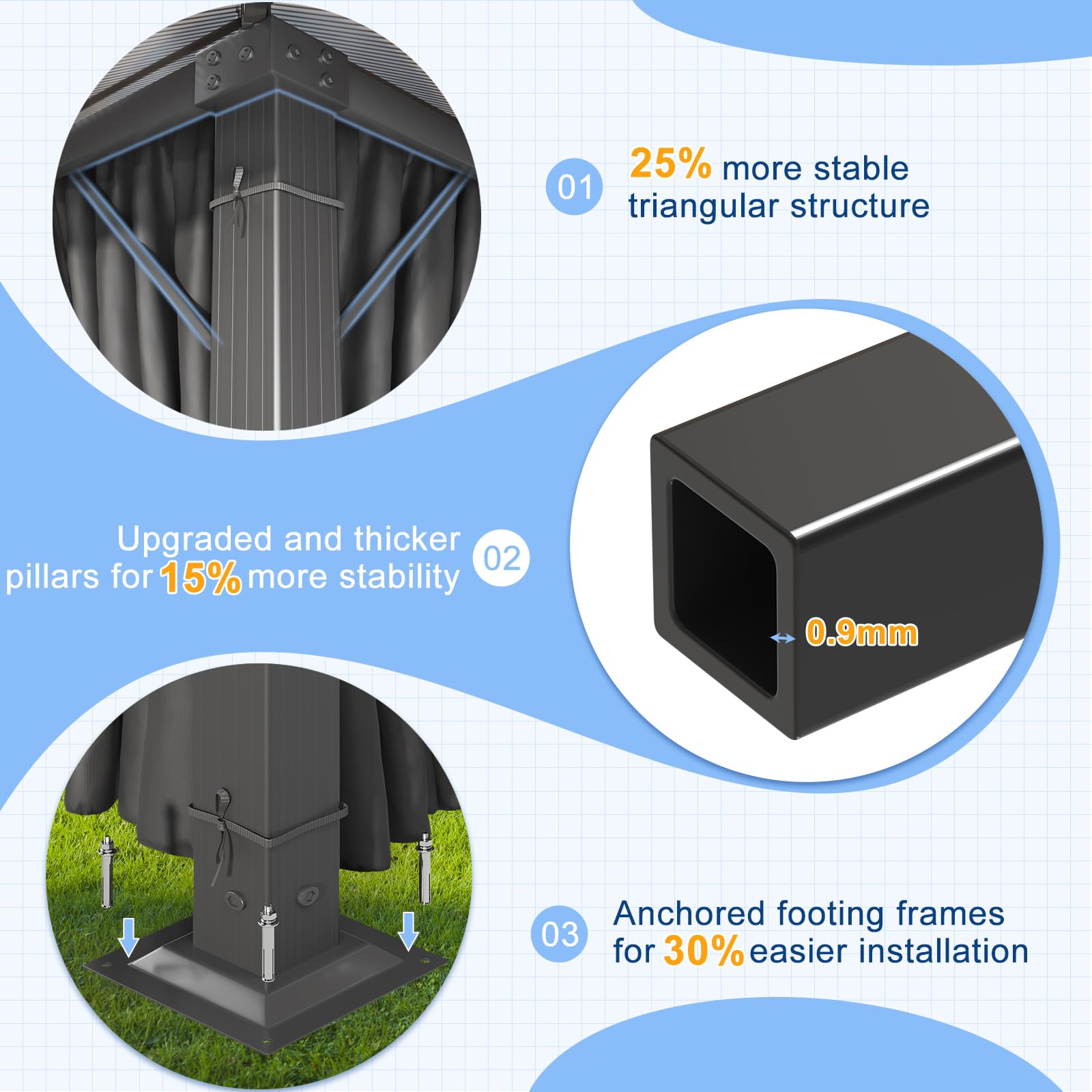 - Ultra strong and stable: 16 expansion screws + 16 ground nails multi-angle anchoring system, firmly anchored in the ground; 4 0.9 mm thicker legs and 4 0.8 mm thick cross tube provide solid support, stronger load capacity, stable and reliable structure.