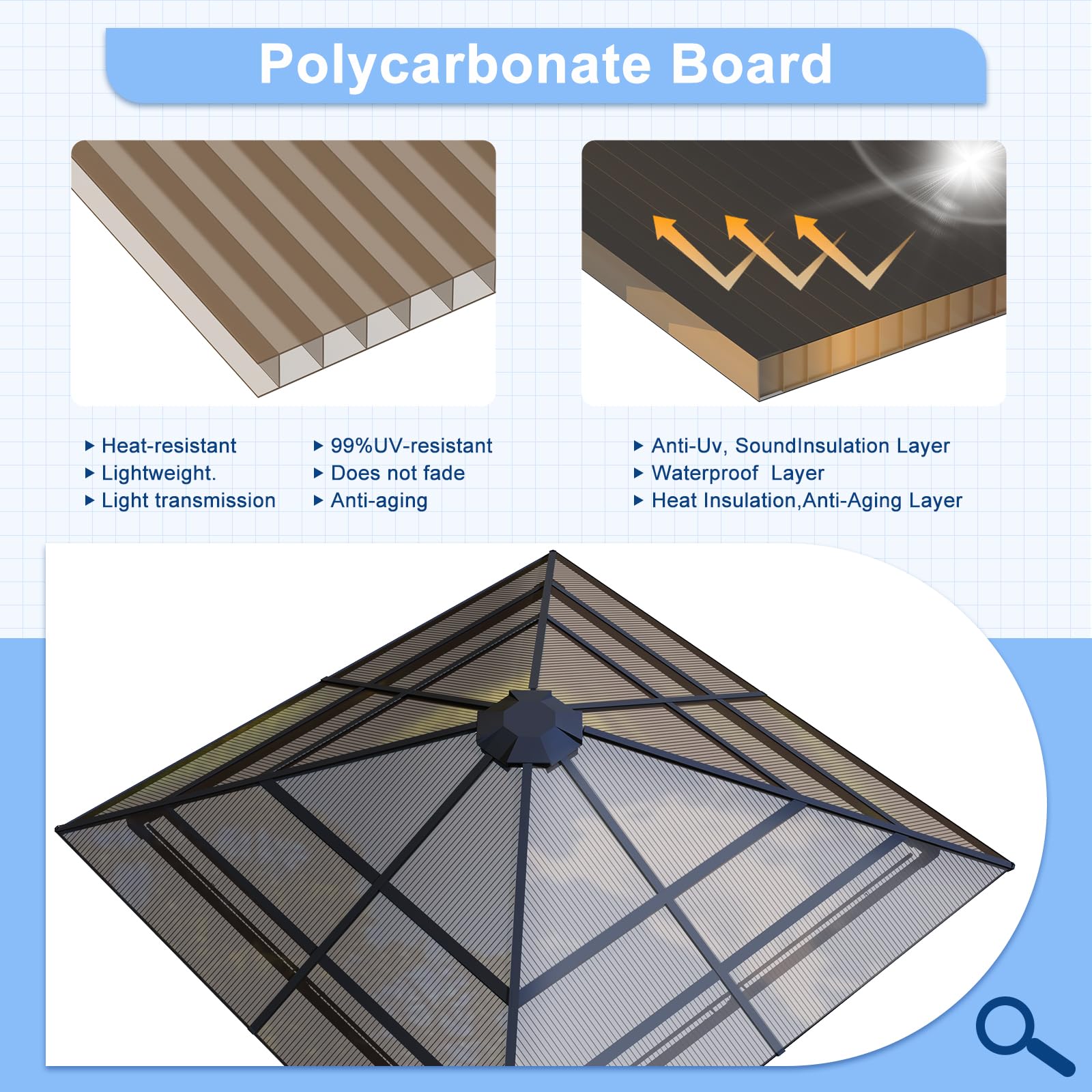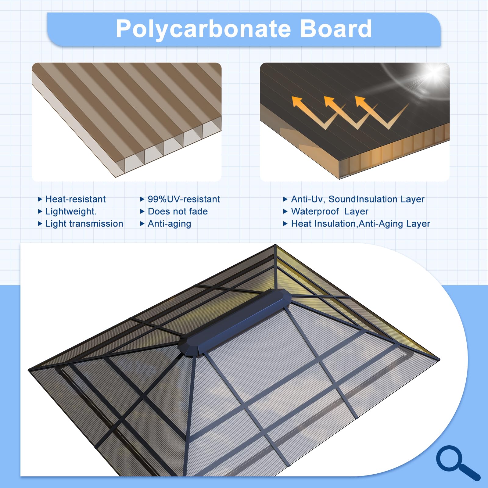 - COMFORTABLE SPACE 3×3 or 3×4 sizes are available to better match different patio spaces. 16 pieces of 6 mm thick hollow PC panel roofs ensure good light transmission, bright and even light inside the gazebo; surrounded by 4 pieces of PA polyester fabric, which can protect against wind and rain and release the view when they are retracted.