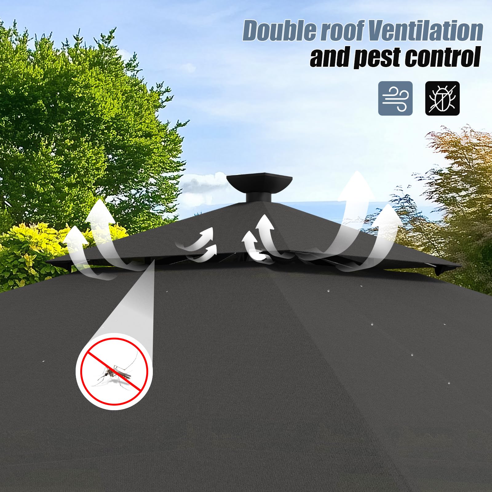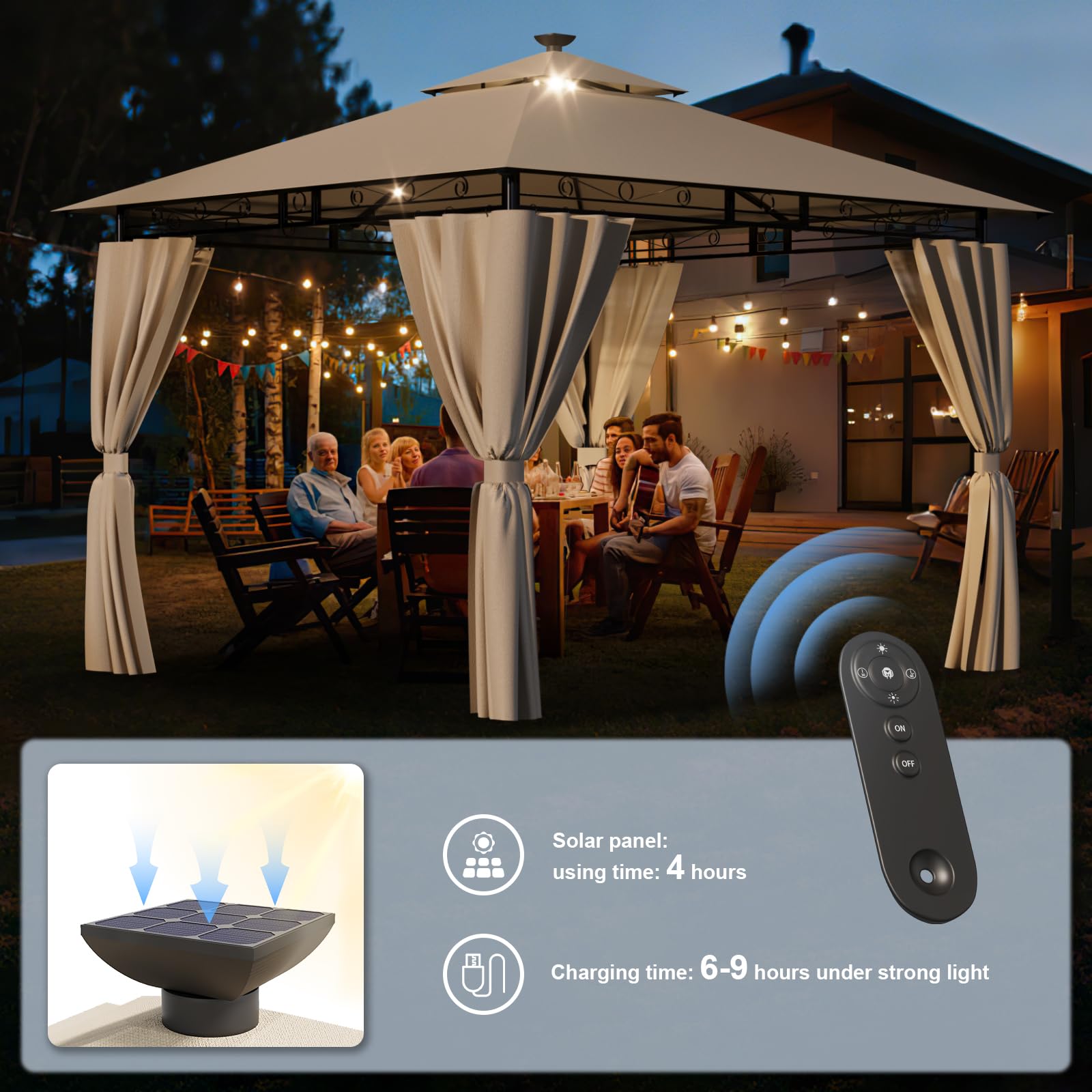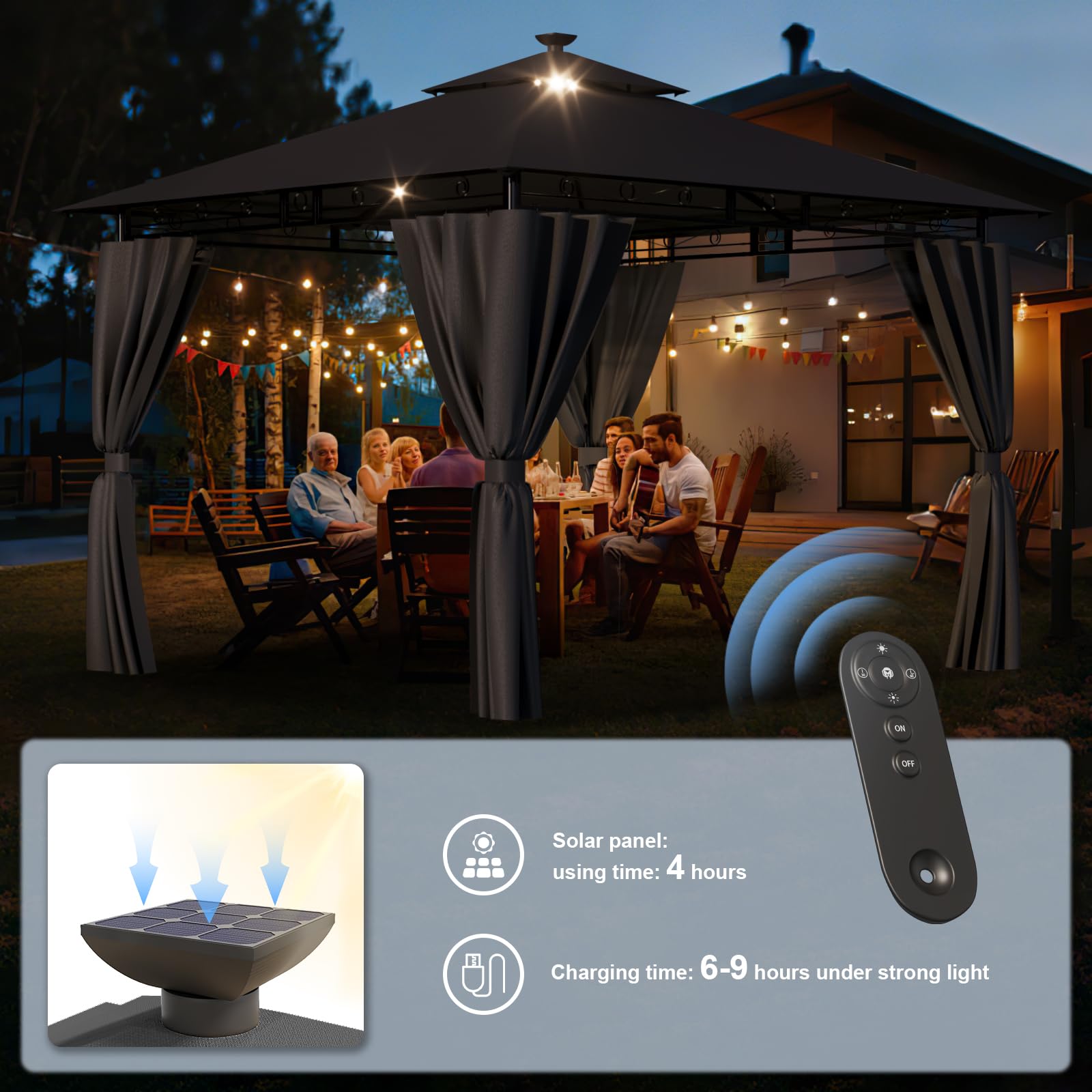 - Intelligent LED lighting system: this gazebo is equipped with solar power and USB charging function, which is convenient for you to easily charge outdoors. The top is equipped with eight lamps, each with four lamp balls, which provide you with a bright light source. With the rechargeable remote control, you can easily control the light, including 2-button on/off function, 30-minute and 60-minute timer and 5-level dimming function.