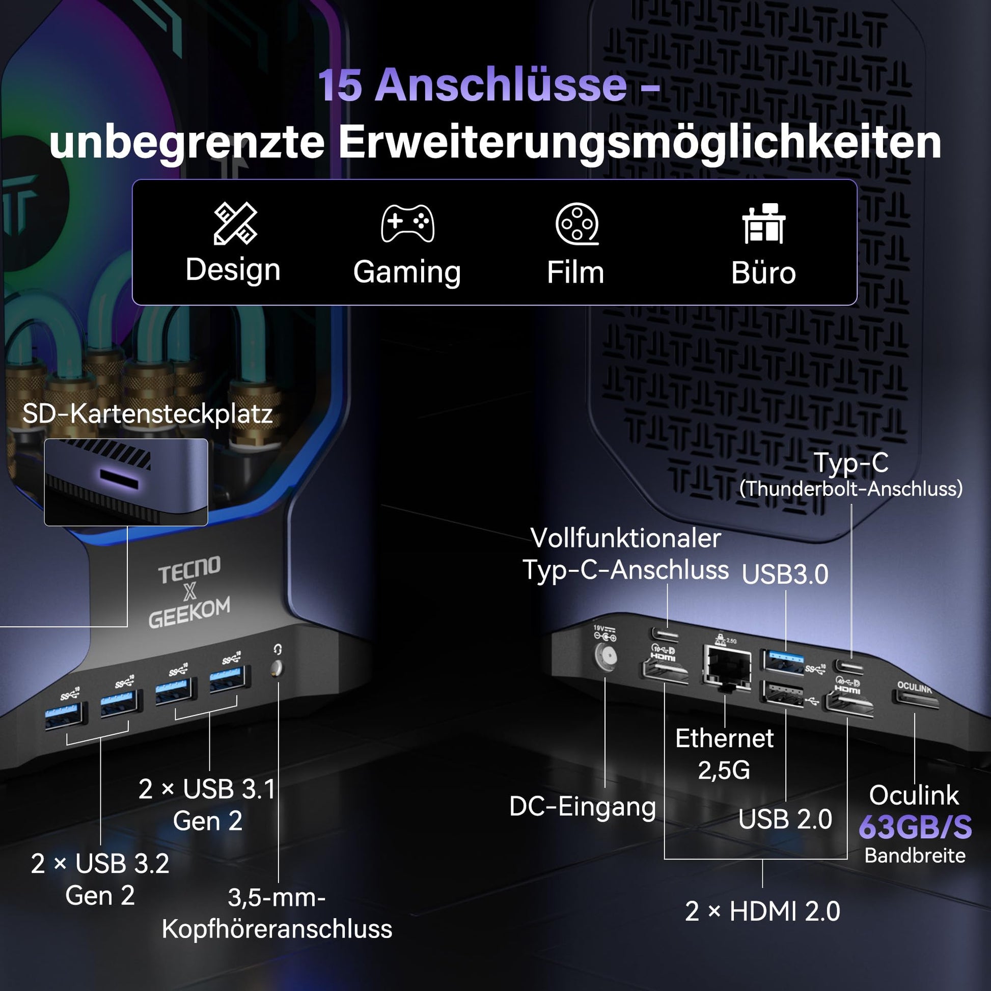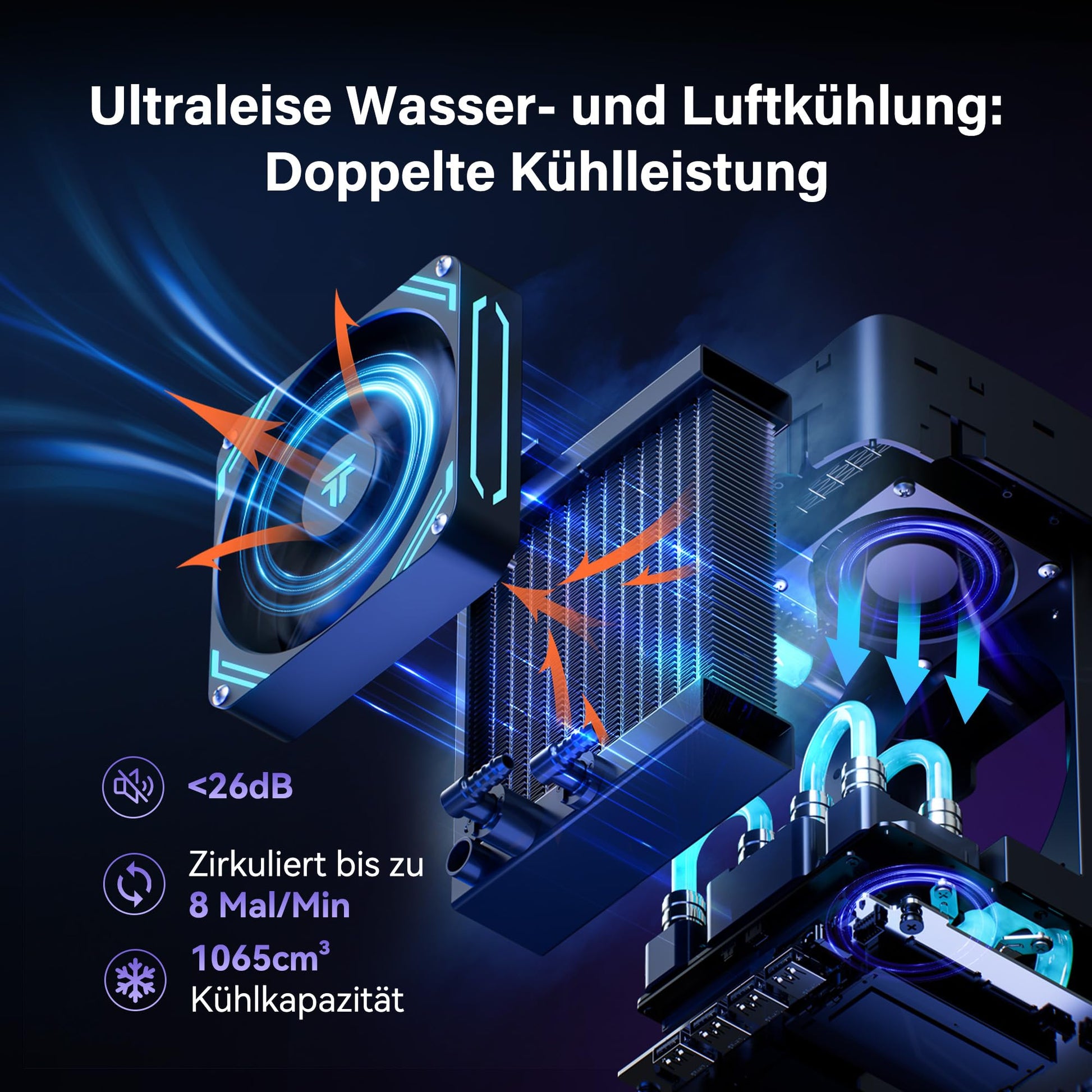 - Advanced water and air cooling: the GEEKOM Megamini G1 gaming computer combines a 360 ml water cooling system with ultra-quiet pump (<26 dB) and a large 6888 mm² copper heat sink for CPU and GPU. Complemented by a dual fan system (>106 CFM) it ensures efficient heat dissipation, stable performance and quiet operation even under high load.