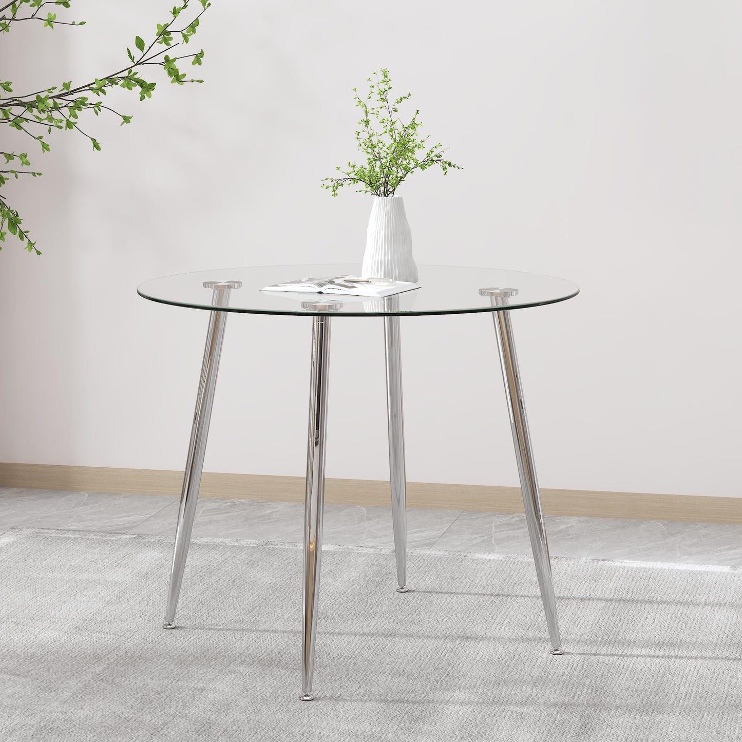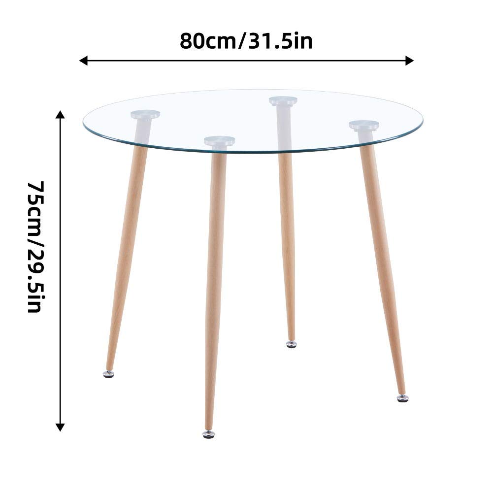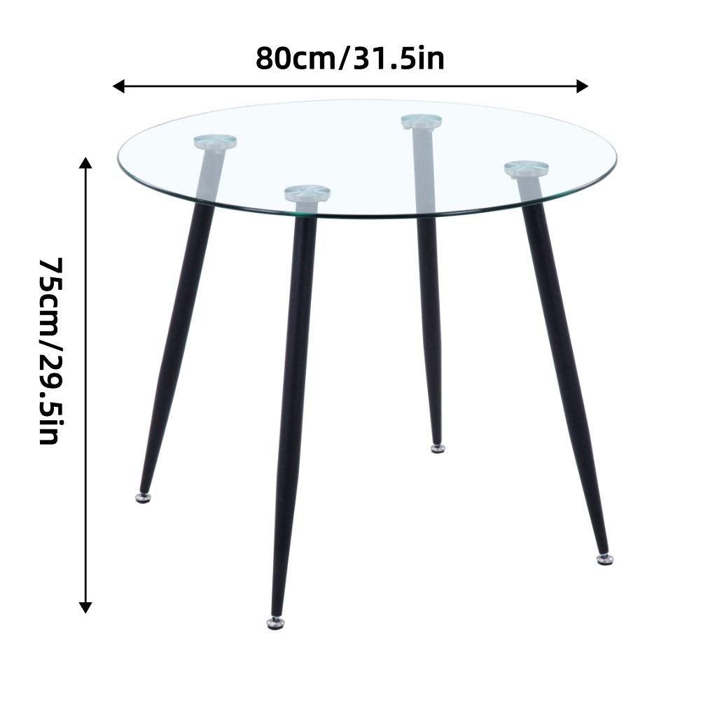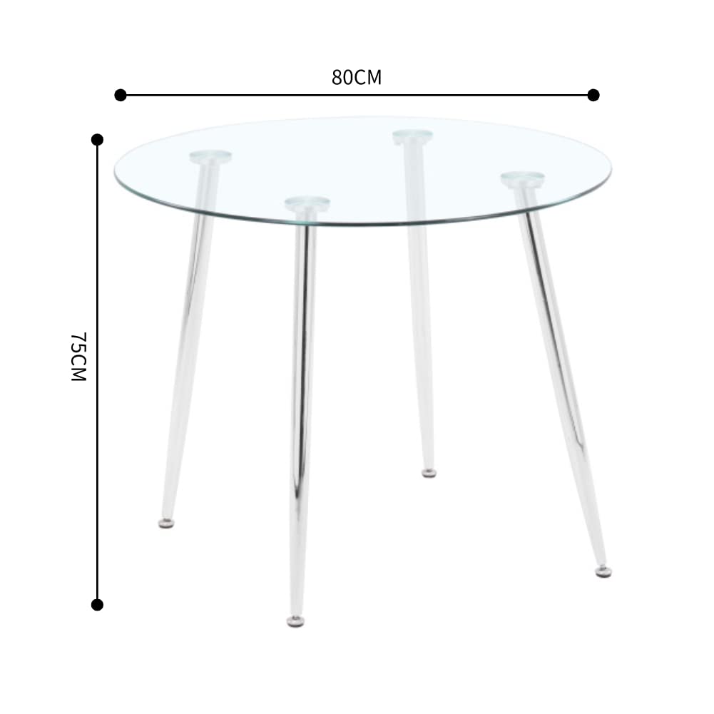 - Esstisch Rund: Die Tischplatte besteht aus transparentem gehärtetem Glas. Die Tischbeine sind Metallbeine.
