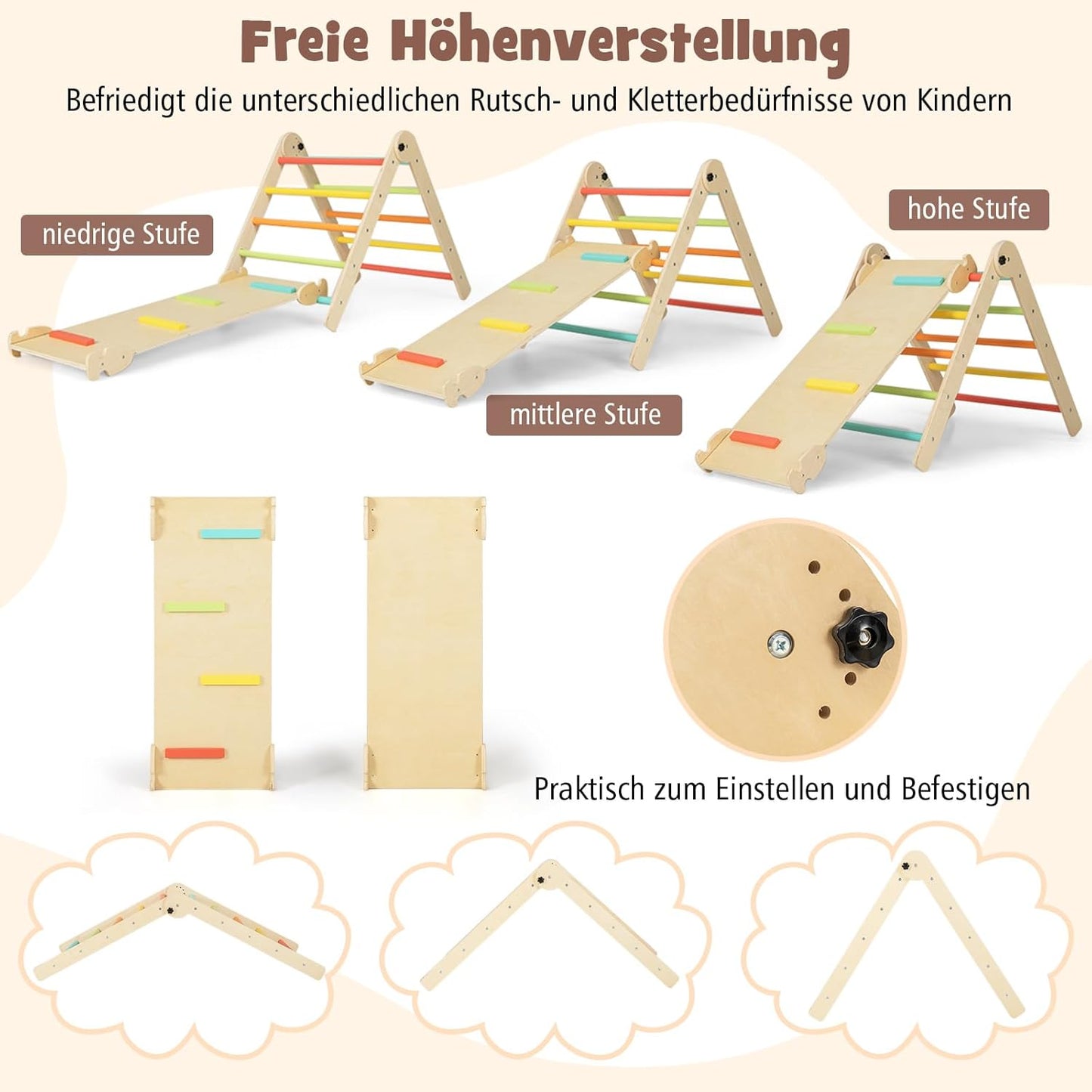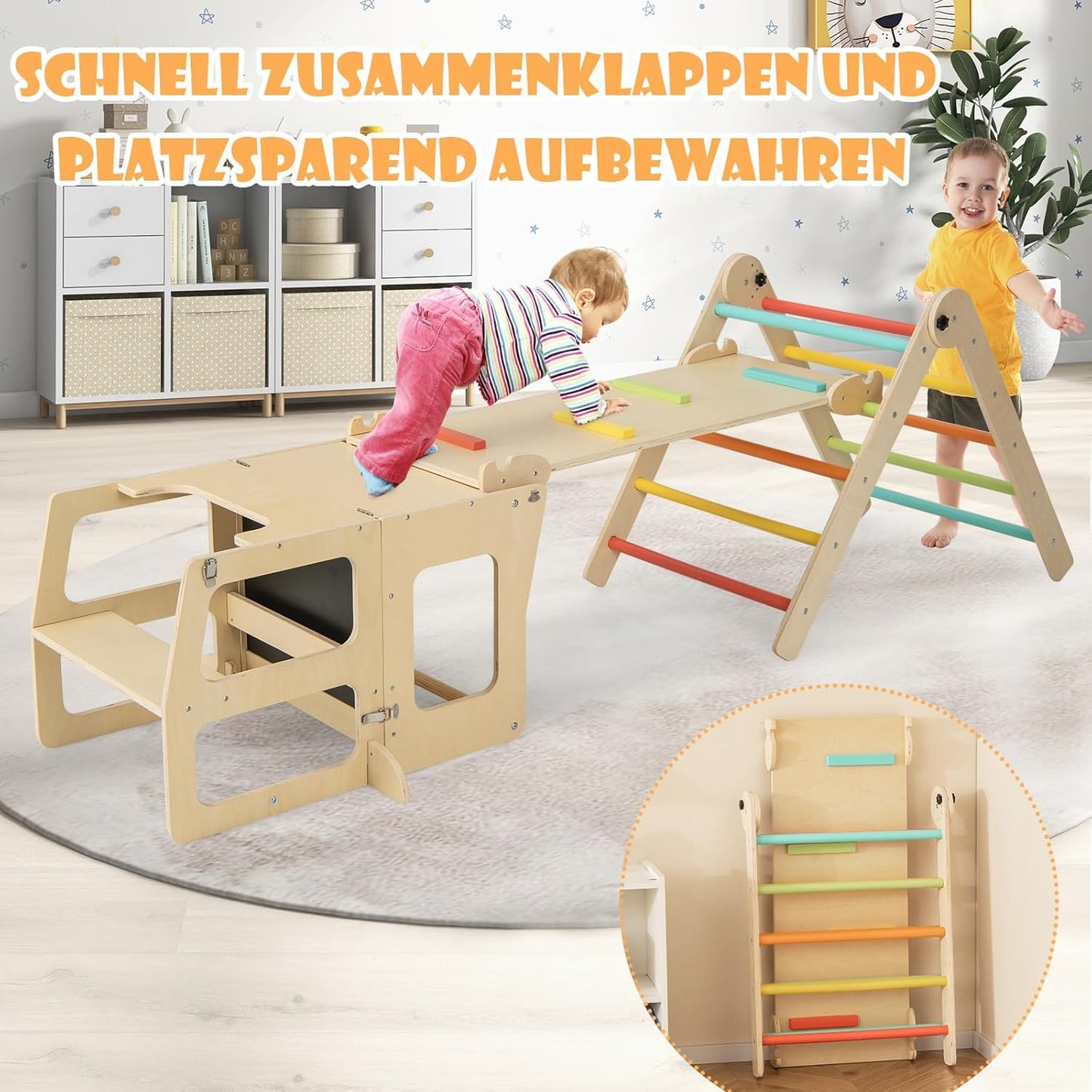 - ✨7 IN 1 MULTIPURPOSE DESIGN: With a climbing triangle, a ramp and a step aid, the versatile climbing and play set offers endless possibilities to play: climbing ladder, crawl tunnel, climbing ramp, long slide, step aid, blackboard and integrated table and chair set.