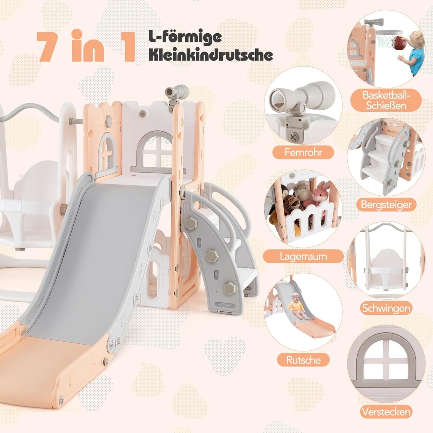 - 7-in-1 Spielplatz für Kinder: Dieses Set kombiniert Rutsche, Schaukel, Leiter, Basketballkorb, Teleskop, Fenster und Stauraum und bietet den Kindern ein 360-Grad-Freizeiterlebnis. Erhöht die Spielvielfalt und fördert das Interesse an körperlicher Aktivität.