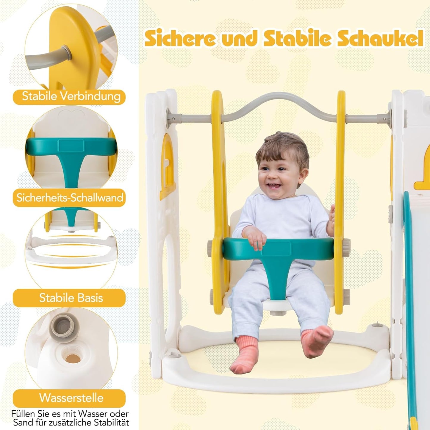 Dieses 7-in-1-Rutschenset für Kinder ist ein multifunktionaler Spielplatz, der für Kinder im Alter von 1 bis 3 Jahren entwickelt wurde. Es umfasst eine Rutsche, eine Schaukel, einen Basketballkorb, ein Teleskop, ein Fenster und Stauraum. Die Rutsche ist mit 3 verschiedenen Zonen konzipiert: Beschleunigung, Rutschen und Dämpfung, um die Sicherheit und den Komfort der Kinder während des Rutschens zu gewährleisten. Die Schaukel ist mit einer Sicherheitsbarriere ausgestattet und die Basis kann mit Wasser oder Sand gefüllt werden, um die Stabilität zu erhöhen. Die Leiter ist mit leicht zu greifenden Handläufen und rutschfesten Pedalen ausgestattet, um die Sicherheit der Kinder beim Aufstieg zu gewährleisten. Diese Rutsche ermöglicht es den Kindern nicht nur, Spaß beim Spielen zu haben, sondern hilft ihnen auch, während ihrer Entwicklung wichtige Fähigkeiten zu entwickeln.