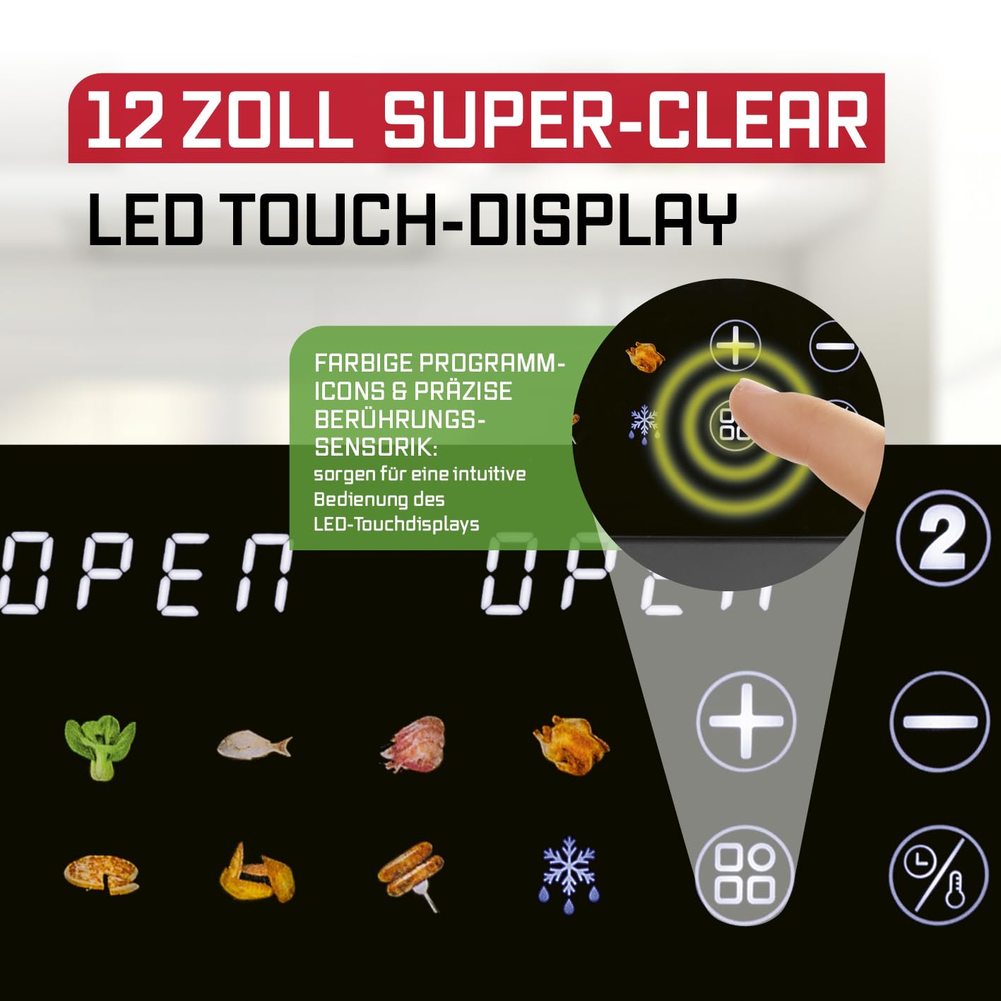 | Besonderes Merkmal | 10 vorinstallierte Programme, Timer, Touch-Display, Vielseitiges Zubehör |