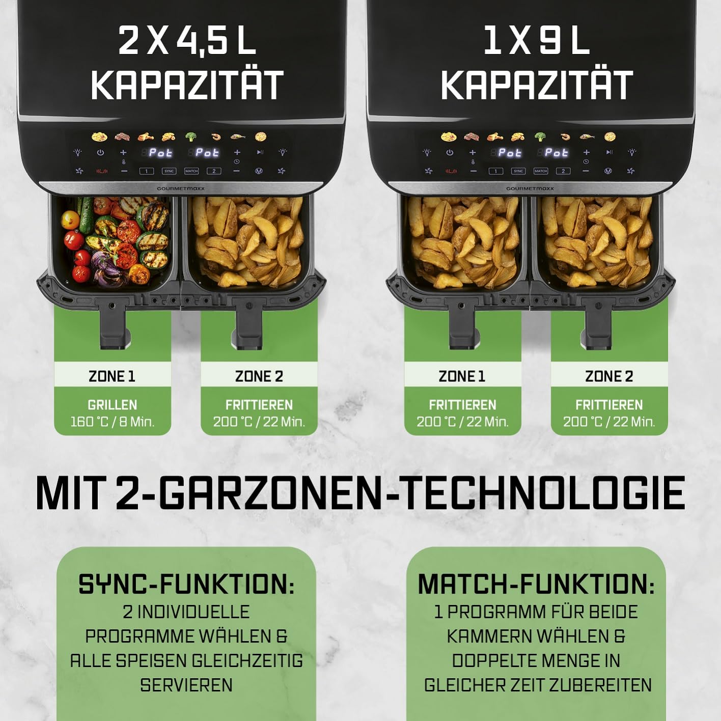 - FETTARM FRITTIEREN: Die GOURMETmaxx Heißluftfritteuse 12 l sorgt dank 1800 W, Temperaturen bis 200° & 360°-Rapid-Air-Technologie für die optimale Wärmeverteilung – für außen krosse & innen saftige Snacks. Genieße schonendes & geruchsarmes Garen mit 80 % weniger Fett als bei herkömmlichen Fritteusen.