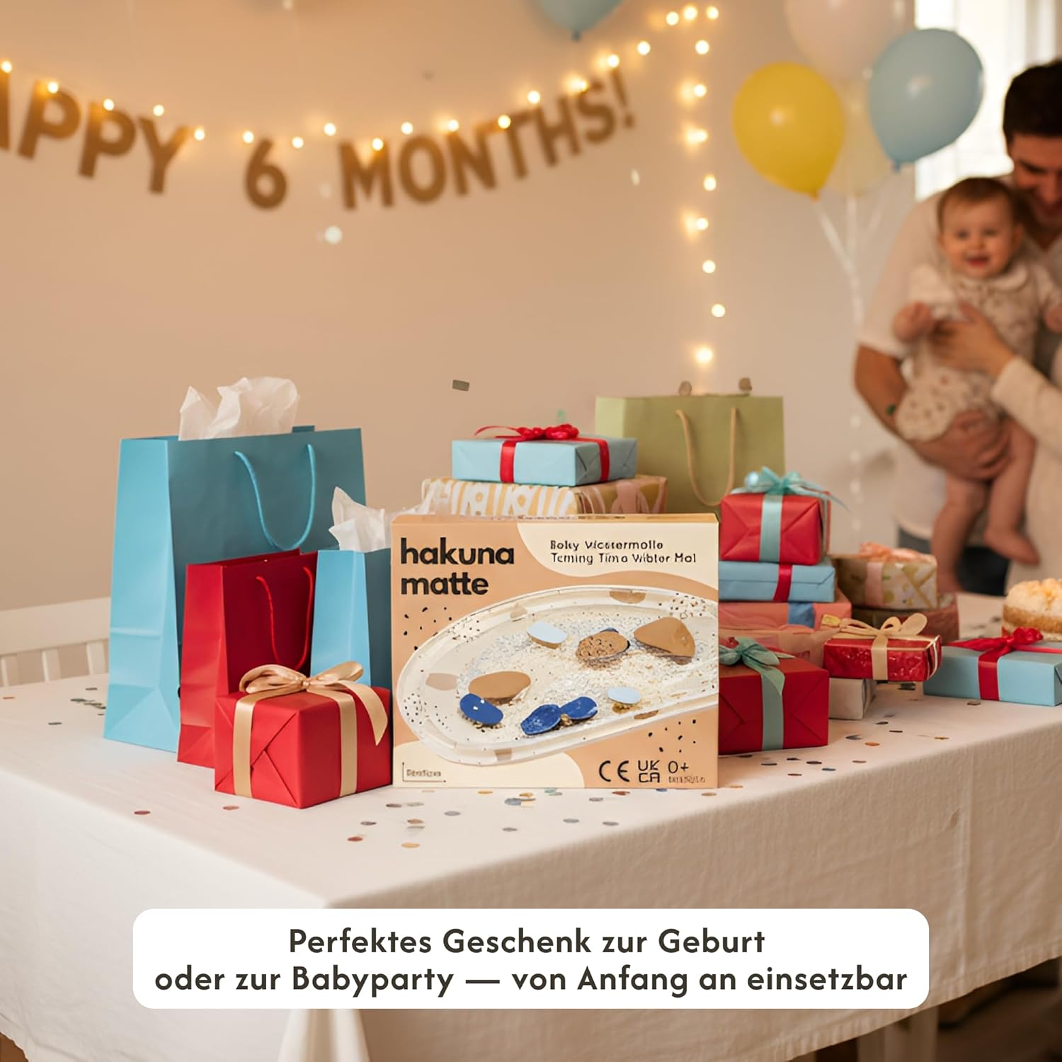 Immerse yourself in a fascinating underwater world that your baby will love - with the Hakuna Matte baby water play mat, which transforms tummy time into a real highlight. No more whacking minutes on his stomach - your little darling discovers what his body can do. Our play mat is more than just entertainment: it is a thoughtful development tool. Your baby strengthens neck, back and shoulder muscles while chasing colourful figures. At the same time, it trains hand-eye coordination, balance and concentration - without pressure, but with lots of fun. That's why tummy time toys like this mat are one of the most valuable everyday companions in the first months of life. Parents appreciate the uncomplicated assembly: filled with air and baby water in just a few minutes, completely leak-proof, robust and ready to use. No leaks, no hassle - just pure joy. When travelling or visiting Grandma & Grandpa? Simply empty, fold and take with you - your mobile playground always with you. SAFETY IS OUR PROMISE - High quality BPA and phthalate free material, double taped seams and an odorless finish ensure carefree play. In addition to classic tummy time pillow or a prone position pillow baby, our baby mat play mat offers a safe way to promote joy of movement. The stylish design with soft natural colours fits perfectly into modern living spaces - not bright plastic, but a real eye-catcher. The lovingly designed look is reminiscent of a small baby aquarium that inspires baby's imagination. Whether as a gift for a birth, baby shower, christening, Christmas or birthday – with this mat you are always right. It is more than a present: an experience that inspires babies and relaxes parents. Even if you already use a prone position toy baby or a baby prone position pillow, this mat will be the ideal addition.