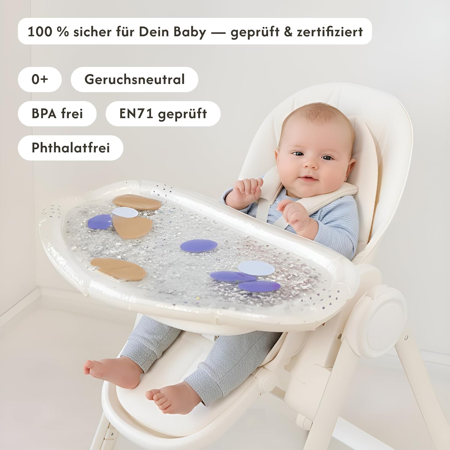 - Tummy Time to Love - Babies hate prone position? No more! Our baby water mat transforms it into your favourite moment: soft edges, vibrant contrasts, floating figures and sparkling glitter encourage eyesight, curiosity and playful development from 3 months.