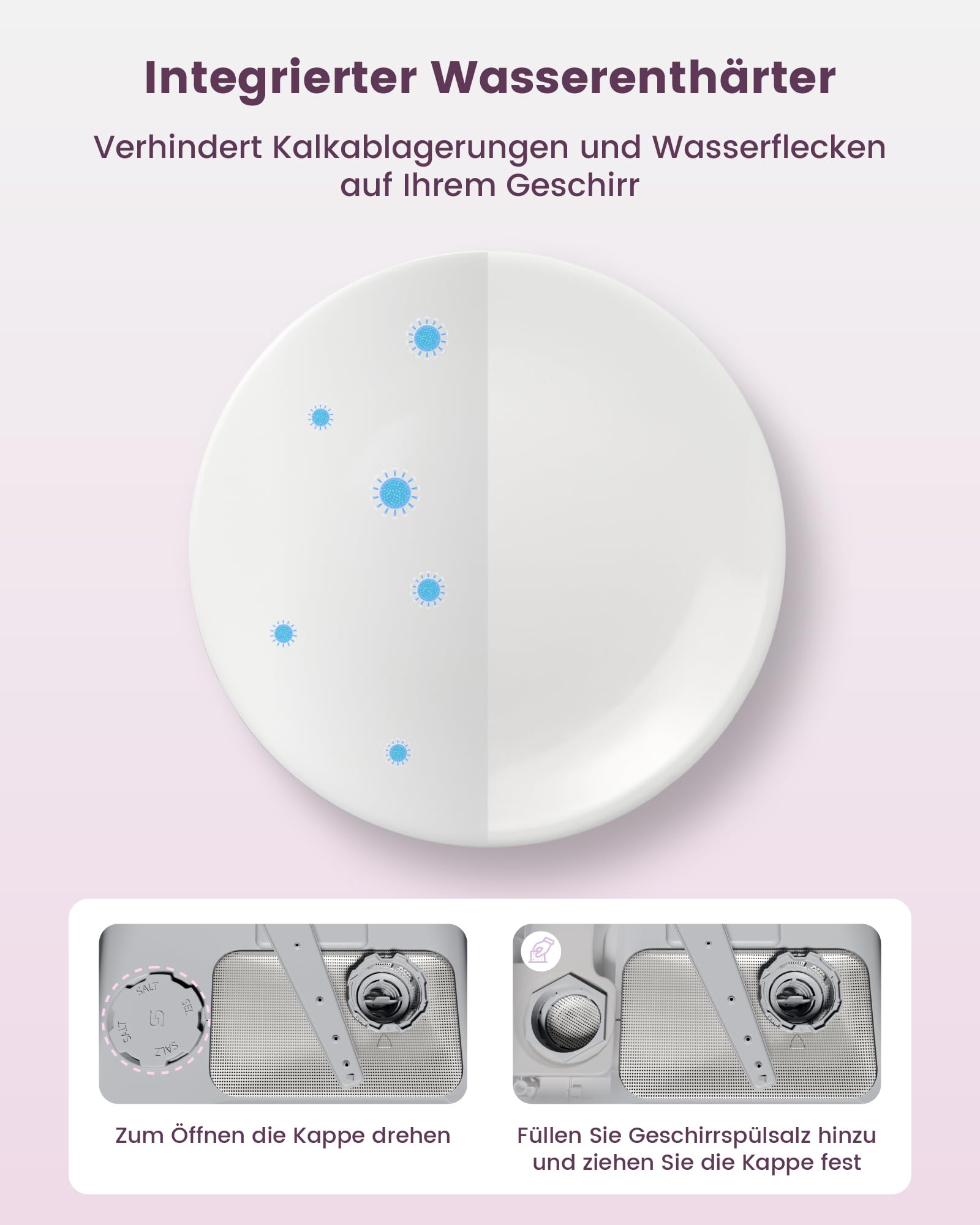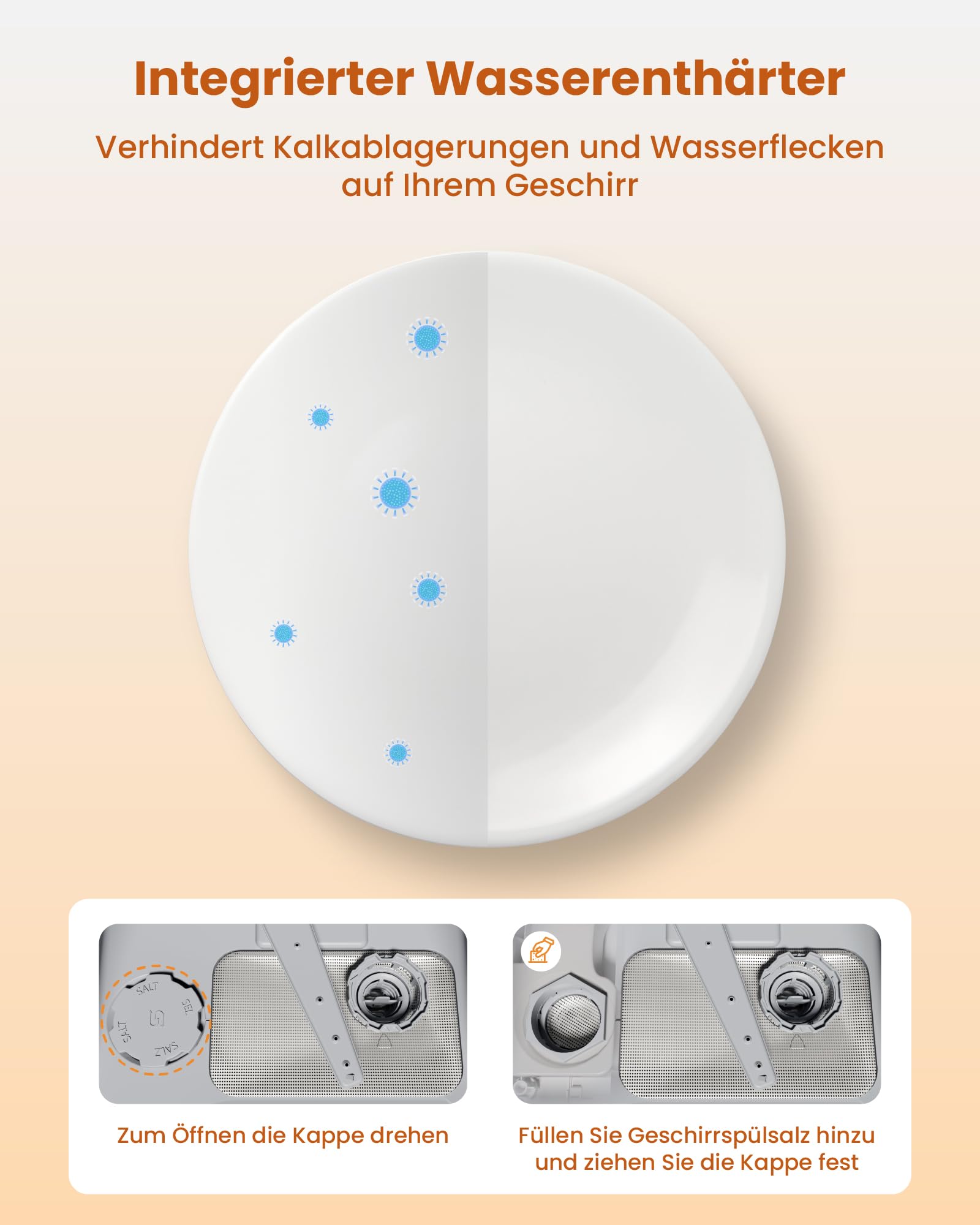 - Built-in Water Softener - The HAVA portable dishwasher is now equipped with a water softener that effectively solves hard water problems. Choose the softener setting according to your water hardness to avoid limescale deposits inside the machine and water stains on your dishes and achieve optimal cleaning results.