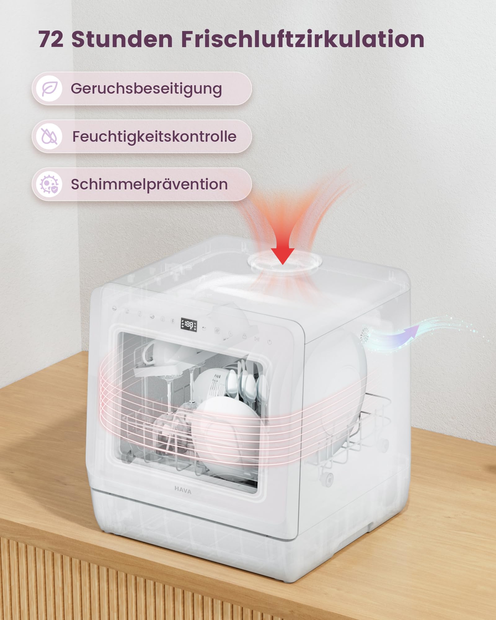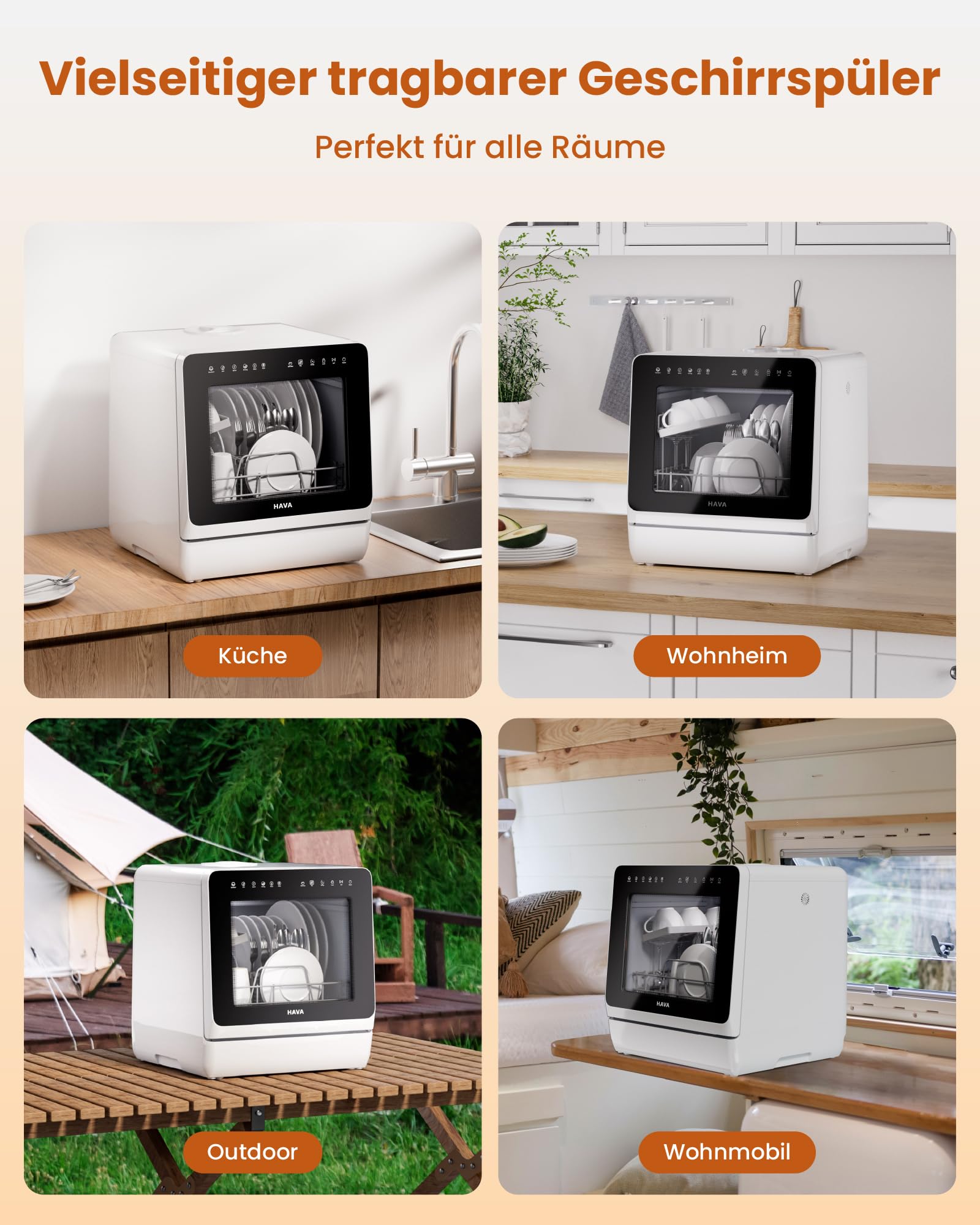 - HASSLE FREE INSTALLATION - The built-in 5 litre water tank provides extra convenience and eliminates the need for water installations, so you can place this HAVA mini dishwasher anywhere in your dorm, apartment, kitchen or RV. Enjoy the portability of this device in small spaces or temporary setups without the need for complex installation.