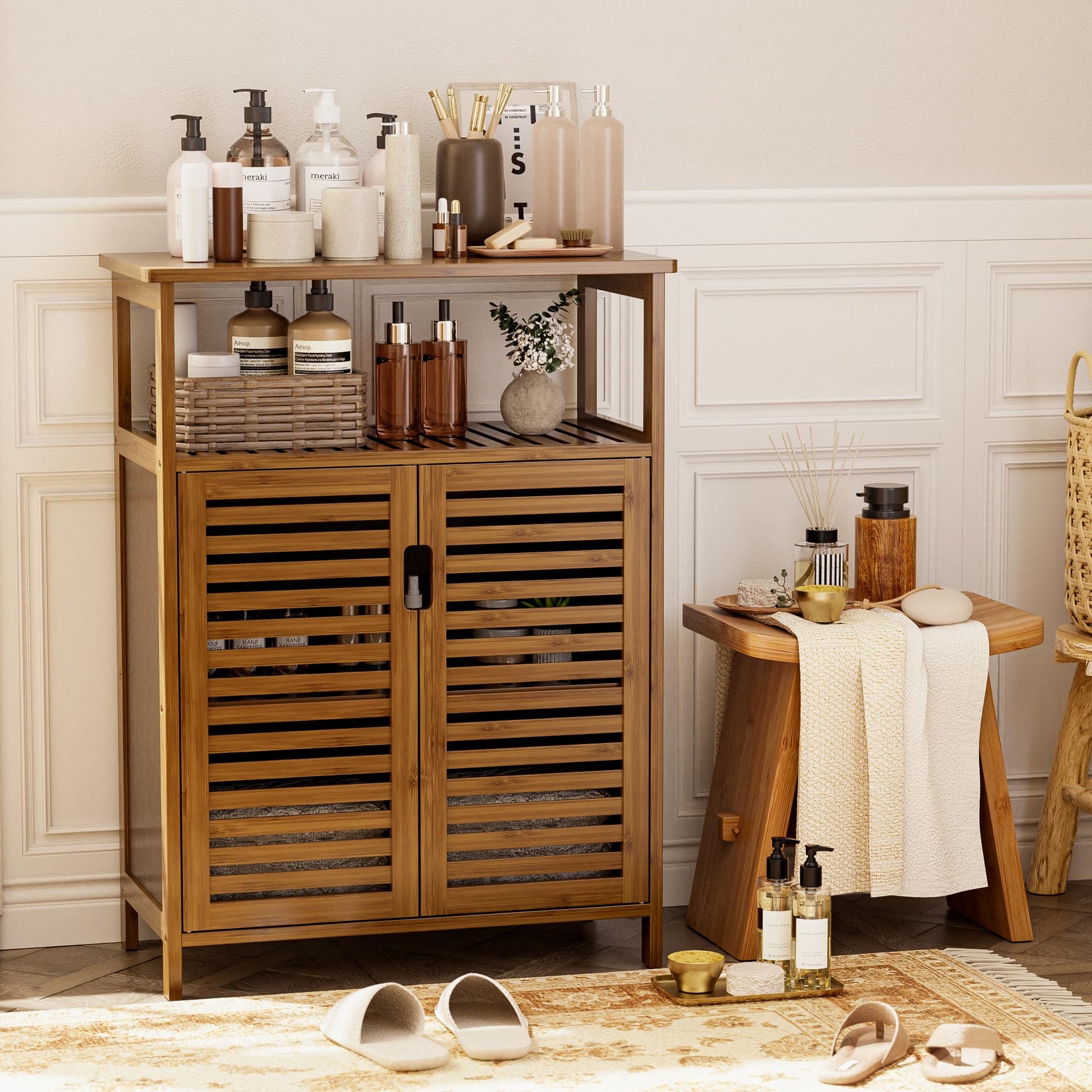 - Large bathroom cabinet – This bamboo bathroom cabinet has a top table top, open shelves and 2 fixed shelves with rolling doors that provide plenty of space to tidy up and organise items. The open compartments allow you to store decorative items or frequently needed items to make them easily accessible. The 2 inner compartments behind the slotted doors can store towels, toilet paper and other bathroom utensils