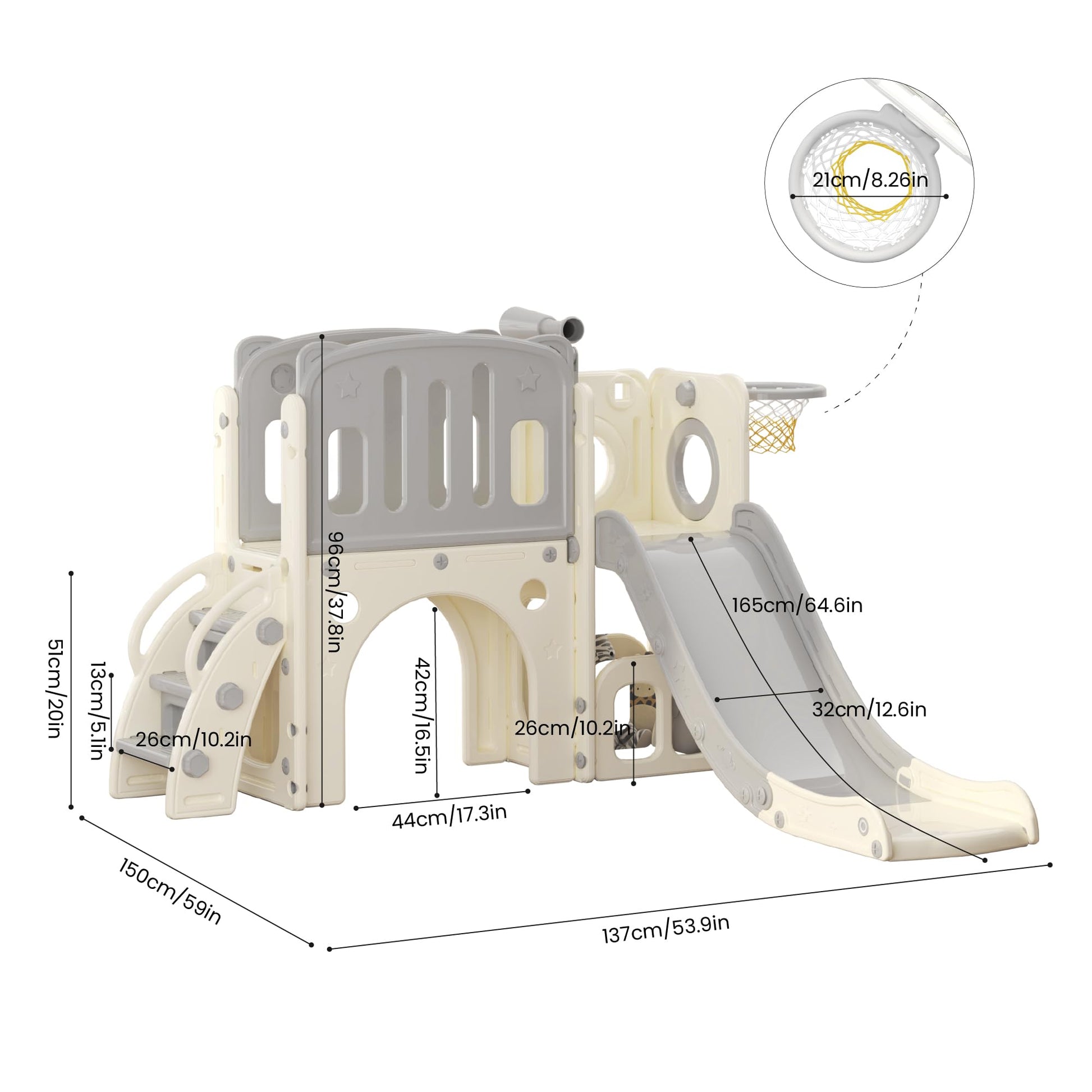 hoopyosms Kids Slide with Climbing Frame, Basketball Hoop and Tunnel, Indoor Plastic Slide Set for Kids, Montessori Toy for Playground, Grey