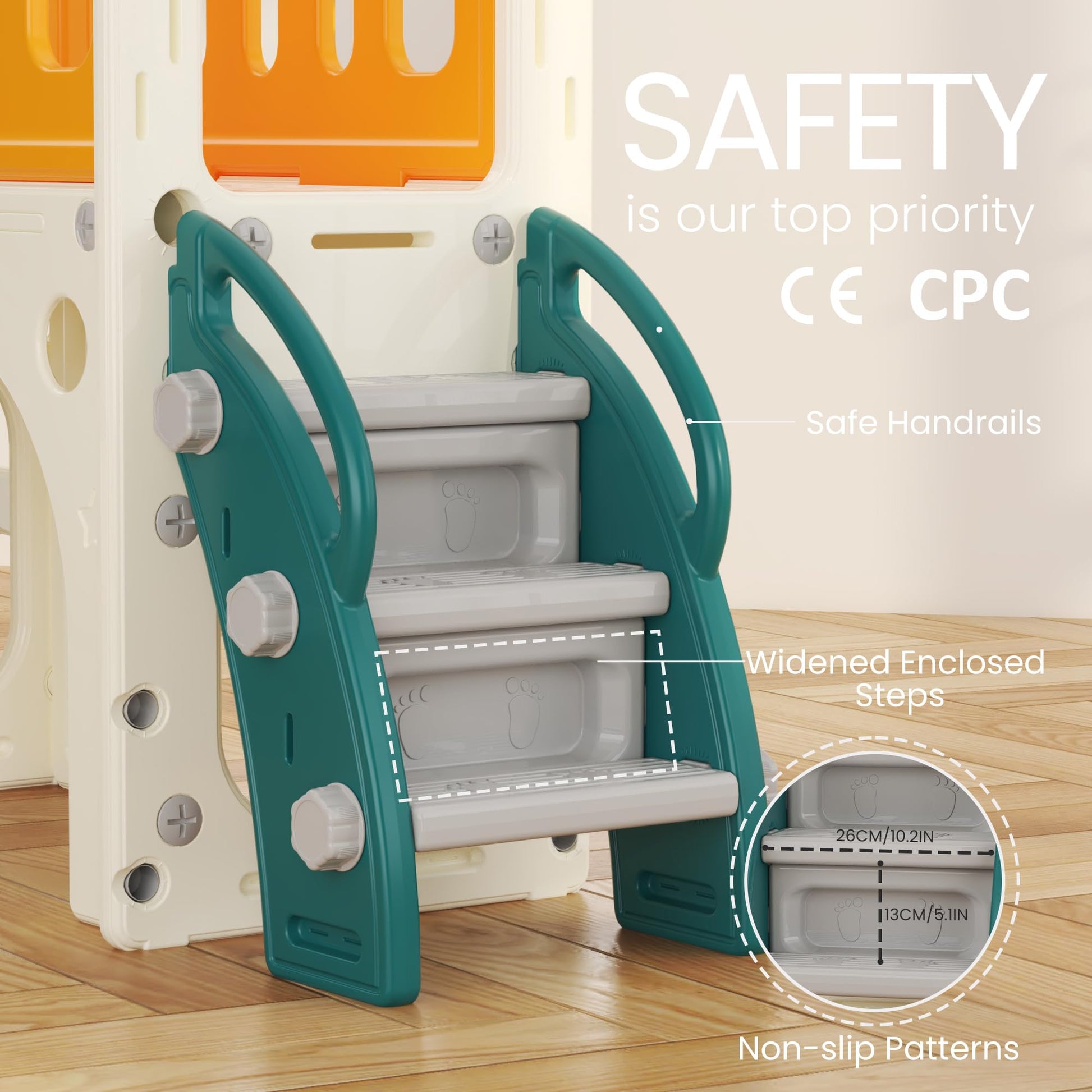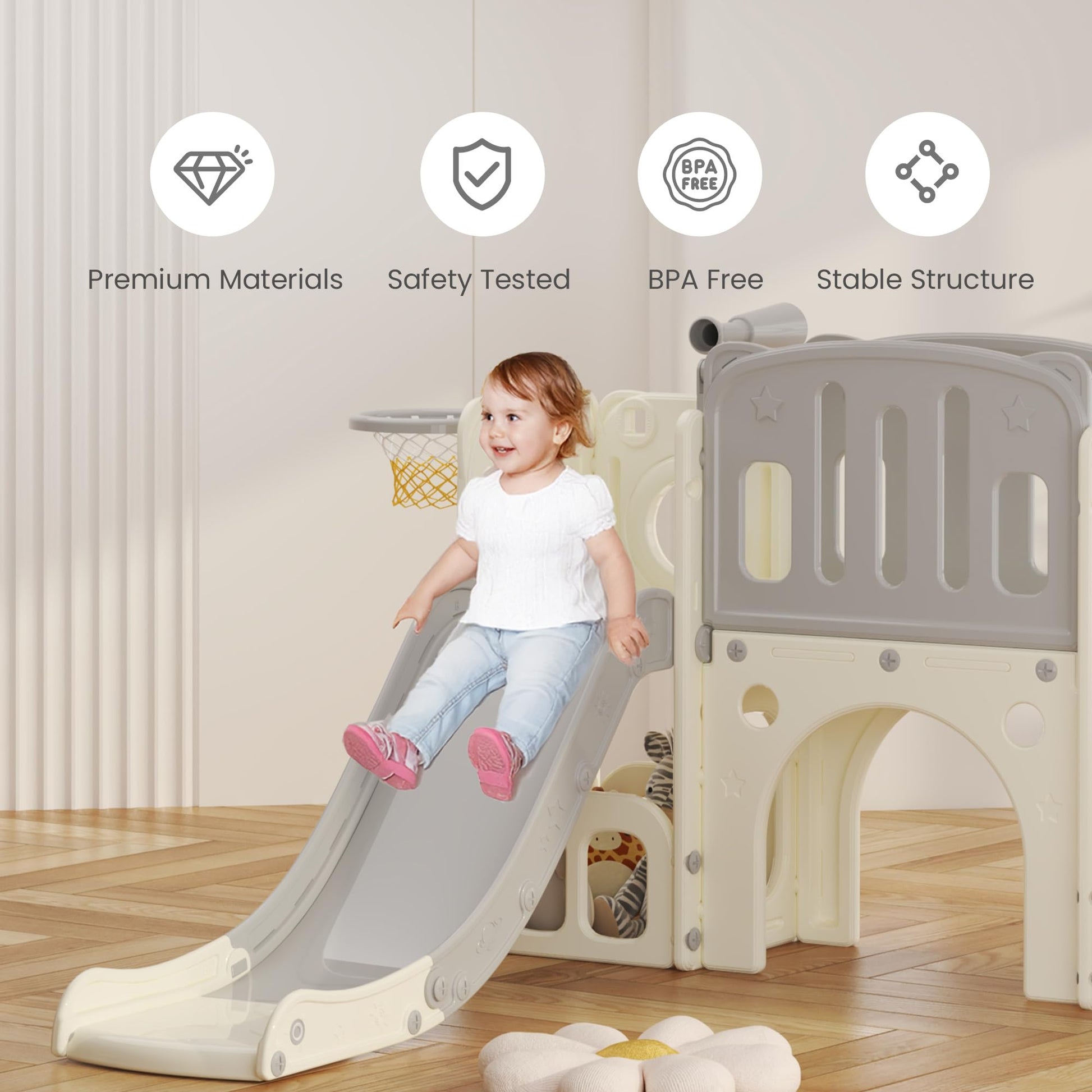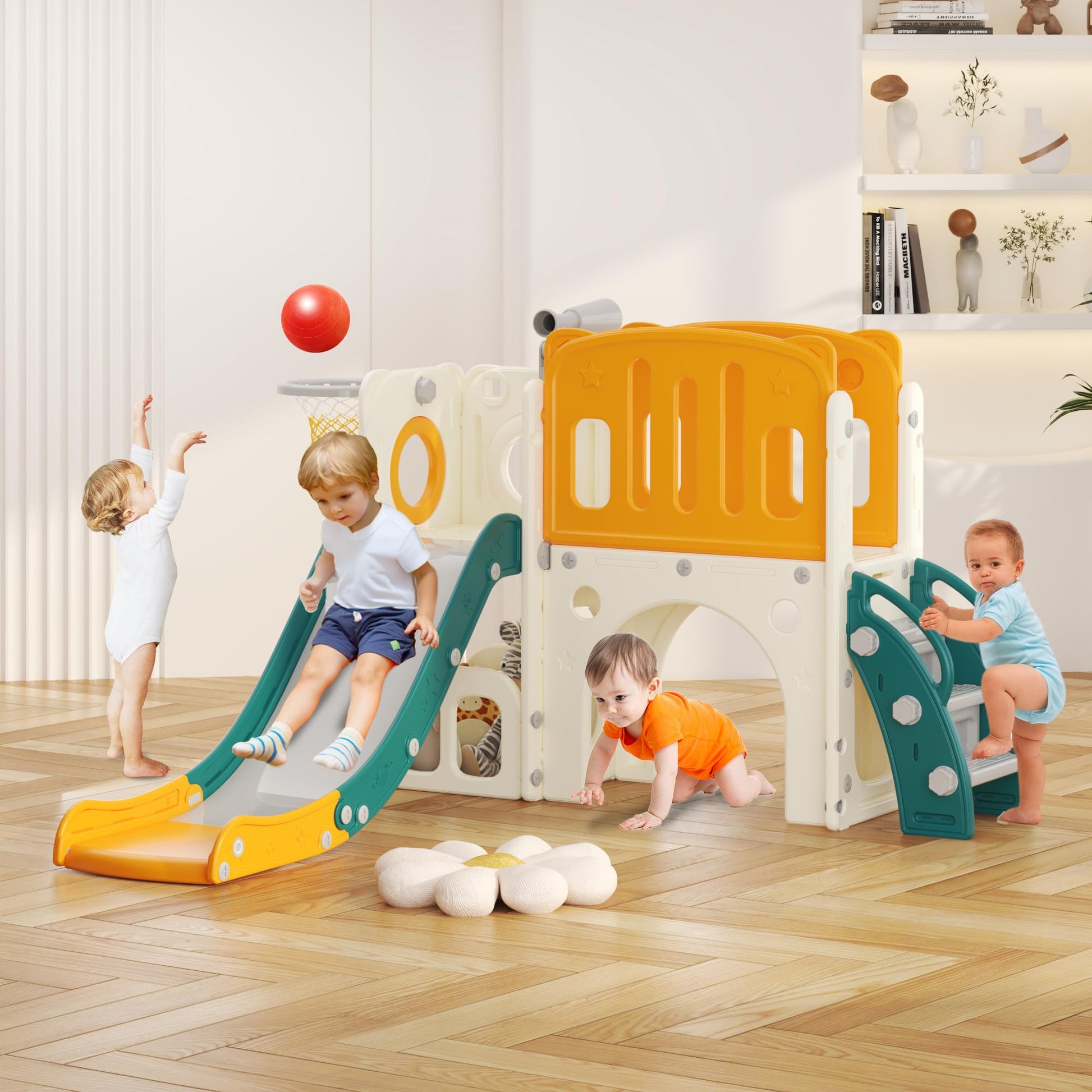 - ALL IN ONE This versatile toddler slide set includes multiple activity areas: climber, slide, basketball shooting, telescope and crawling tunnel. Designed to engage and challenge, our toddler slide set is perfect for promoting physical, cognitive and social skills in a safe and fun environment.