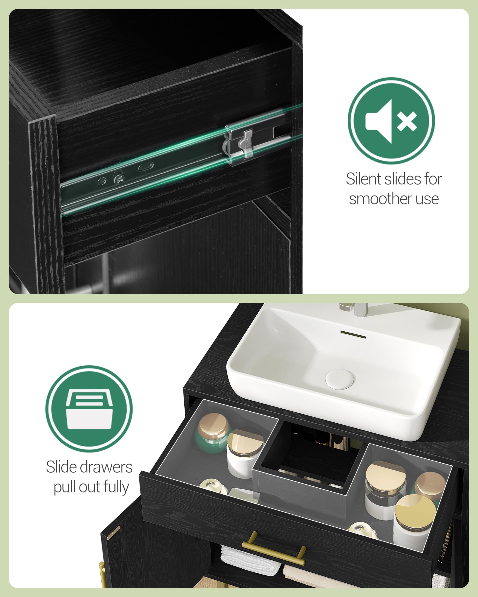 - Sufficient storage space: This sink cabinet has been designed with practical storage in the bathroom in mind. 1 drawer and 1 storage space with cabinet doors provide plenty of space and are perfect for storing toiletries, towels and paper towels as well as other daily bathroom utensils. This design not only makes your bathroom look tidier and more organized, but also allows you to easily find what you need when you need it, bringing convenience to your bathroom life