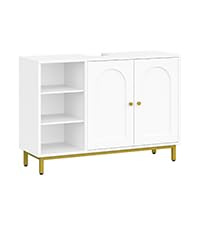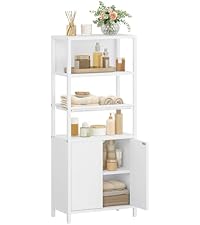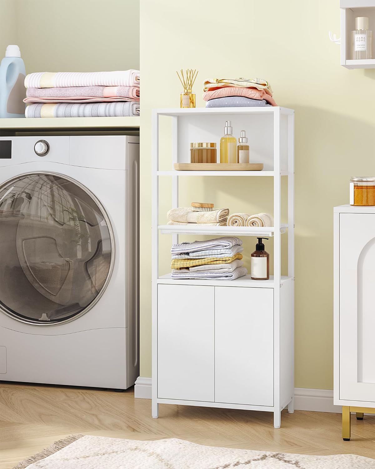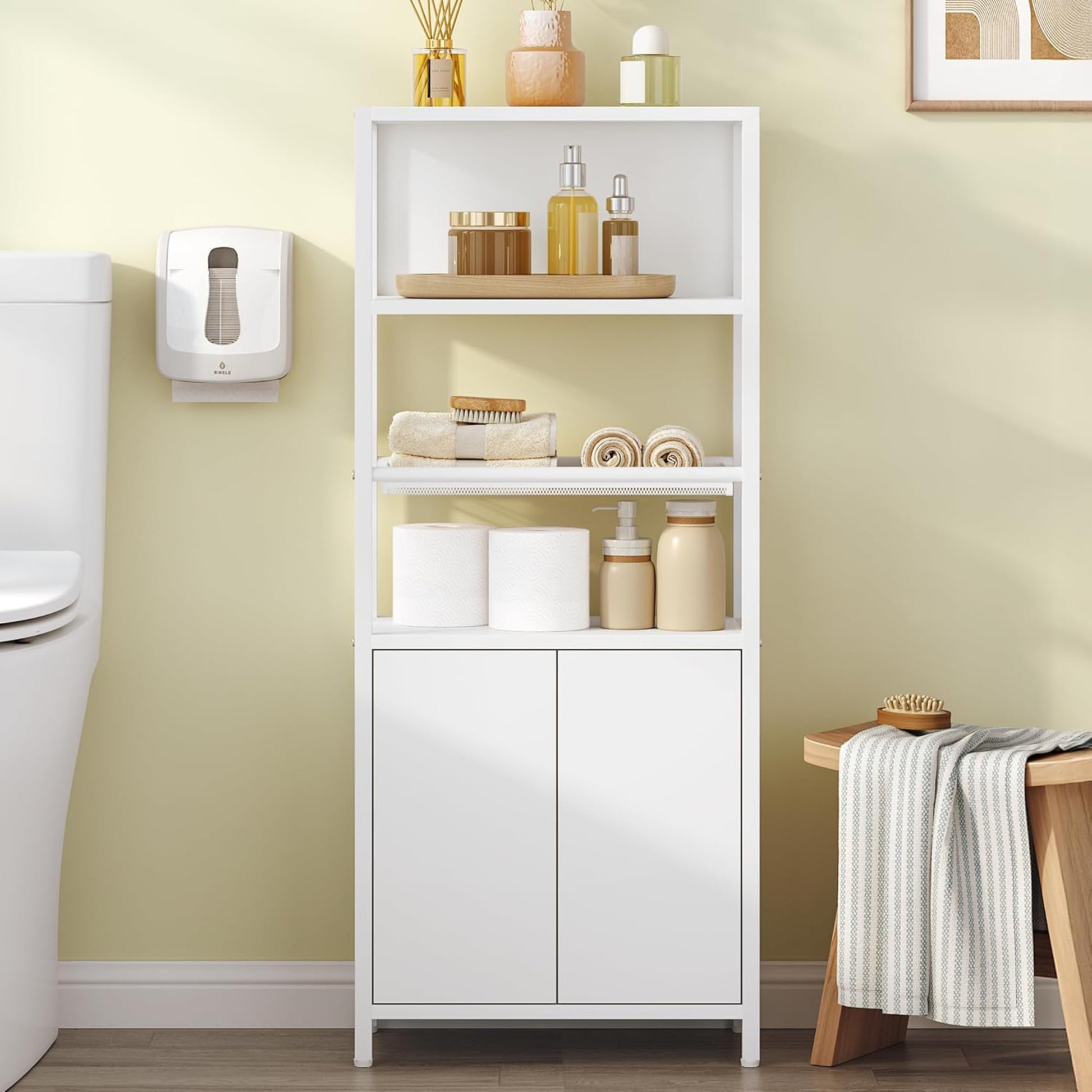 - Zone division: the open top of this bathroom cabinet presents perfumes and care products. The innovative metal mesh compartment in the middle accelerates drying of towels thanks to its breathable structure. The spacious base with double doors provides generous storage space for toilet paper and large bottles of detergent