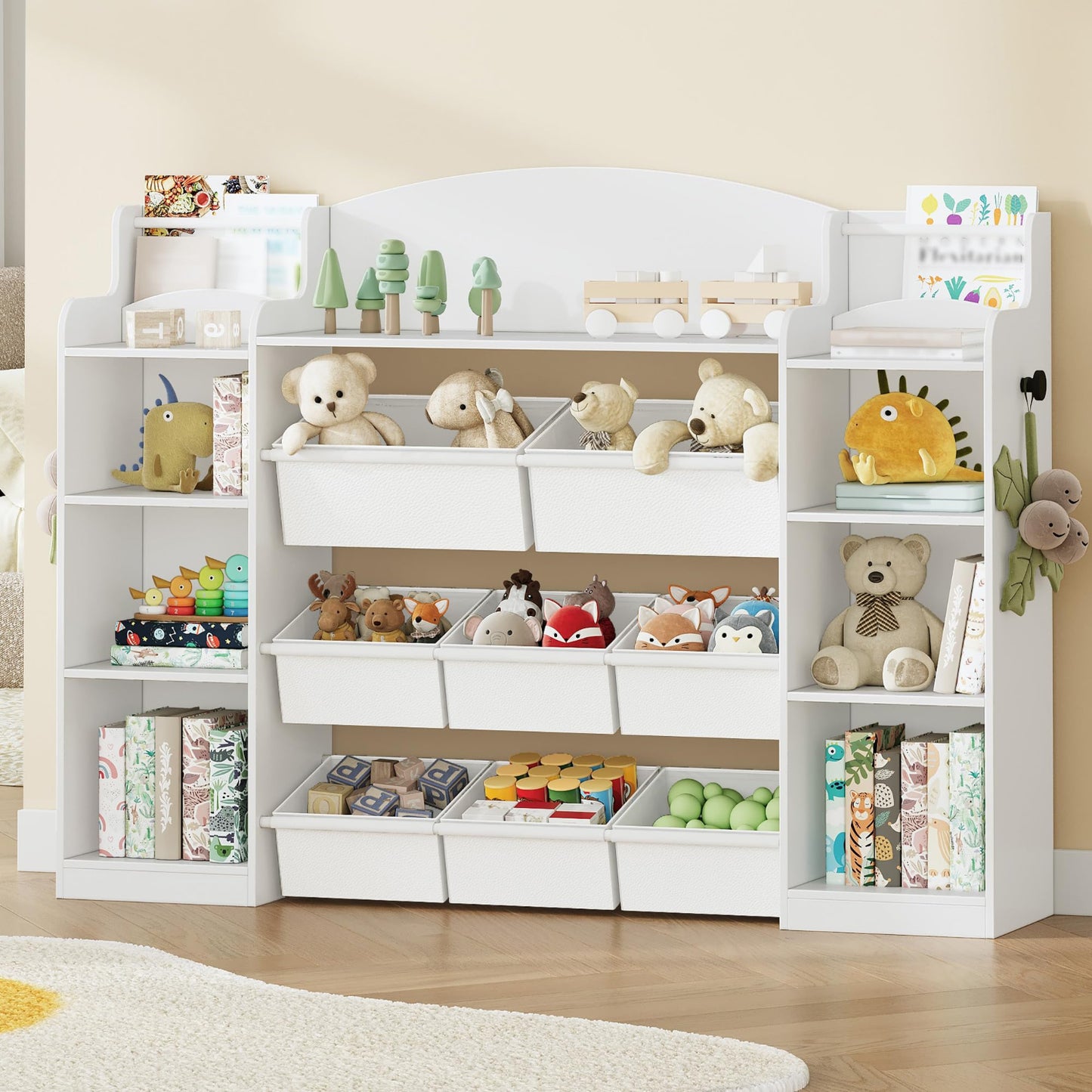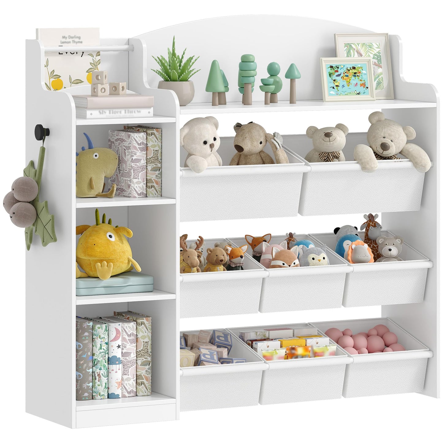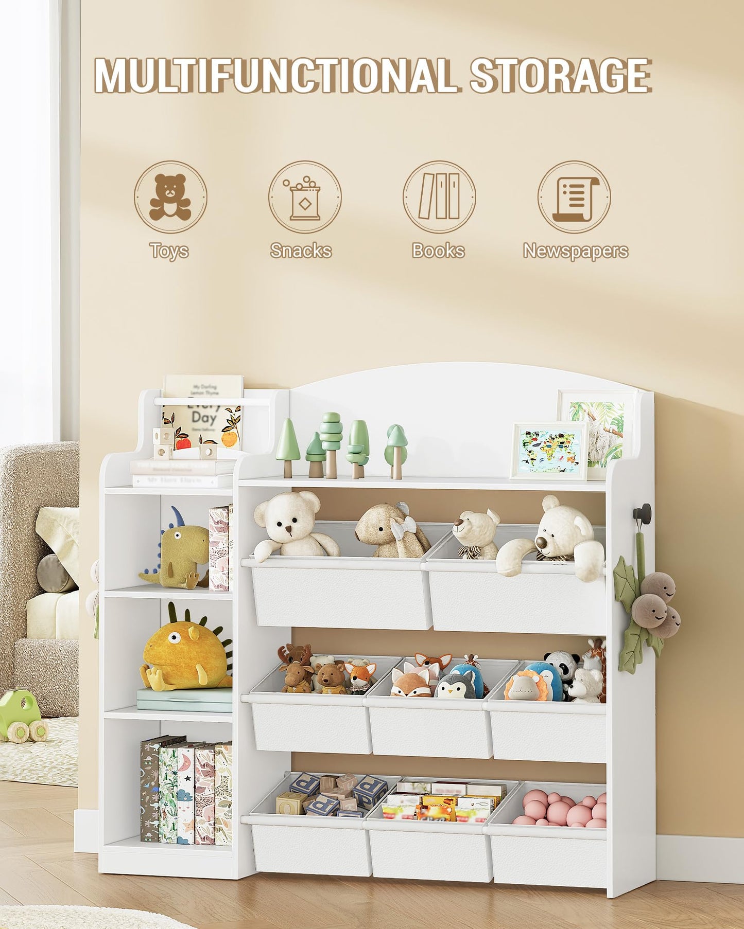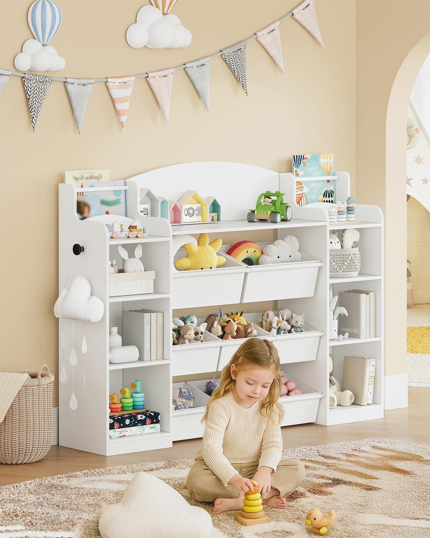 - Multifunctional: The design of the storage shelf combines multiple functions, including 9 open compartments, 2 newspaper racks, 8 toy storage boxes and two hooks. This creates a storage system for busy families that allows you to easily keep your child's play area tidy and organised