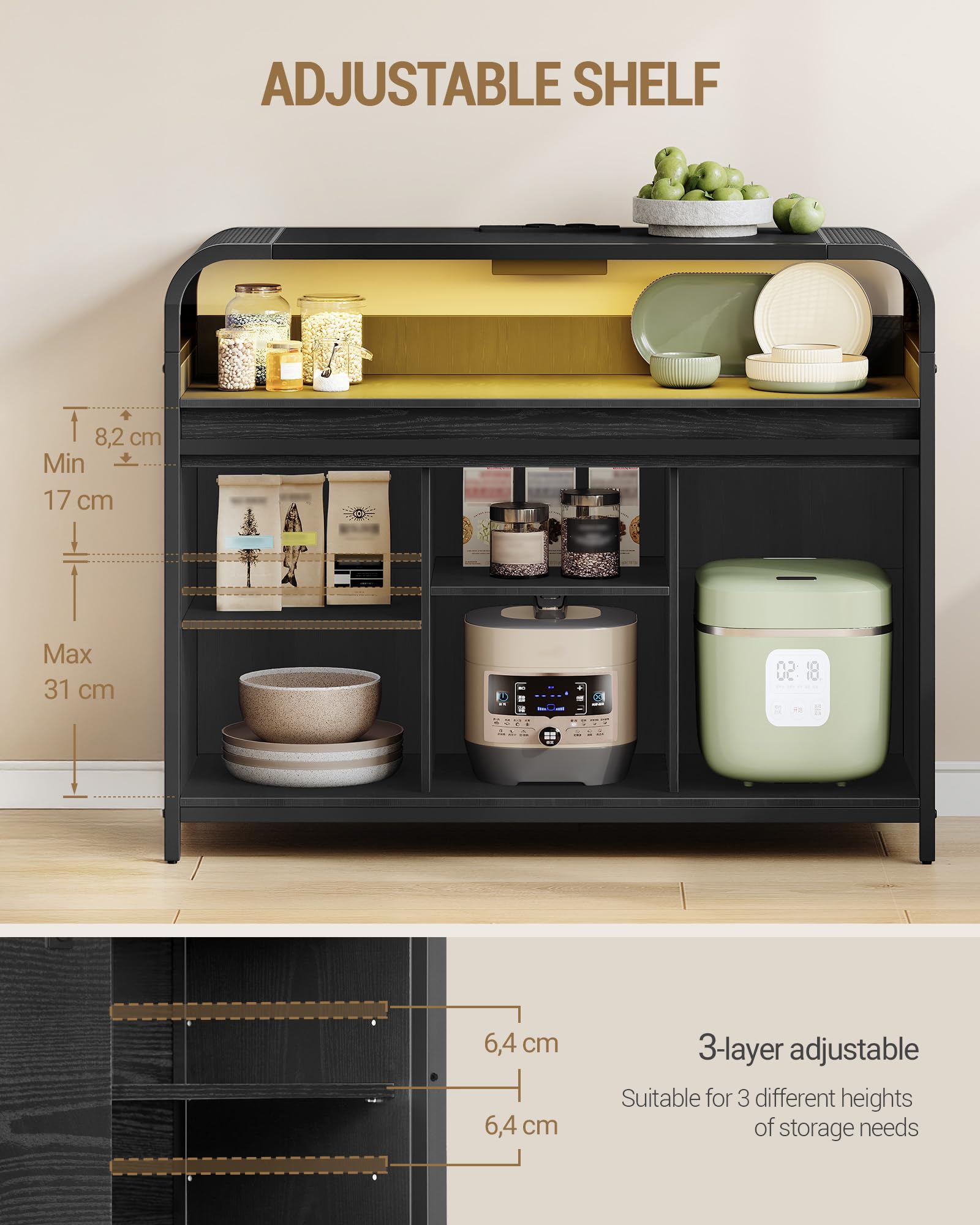 - Height adjustable shelves: Three flexibly adjustable shelves with 6.4 cm adjustment range per step adapt to different items. If necessary, the shelves can be removed to accommodate larger utensils