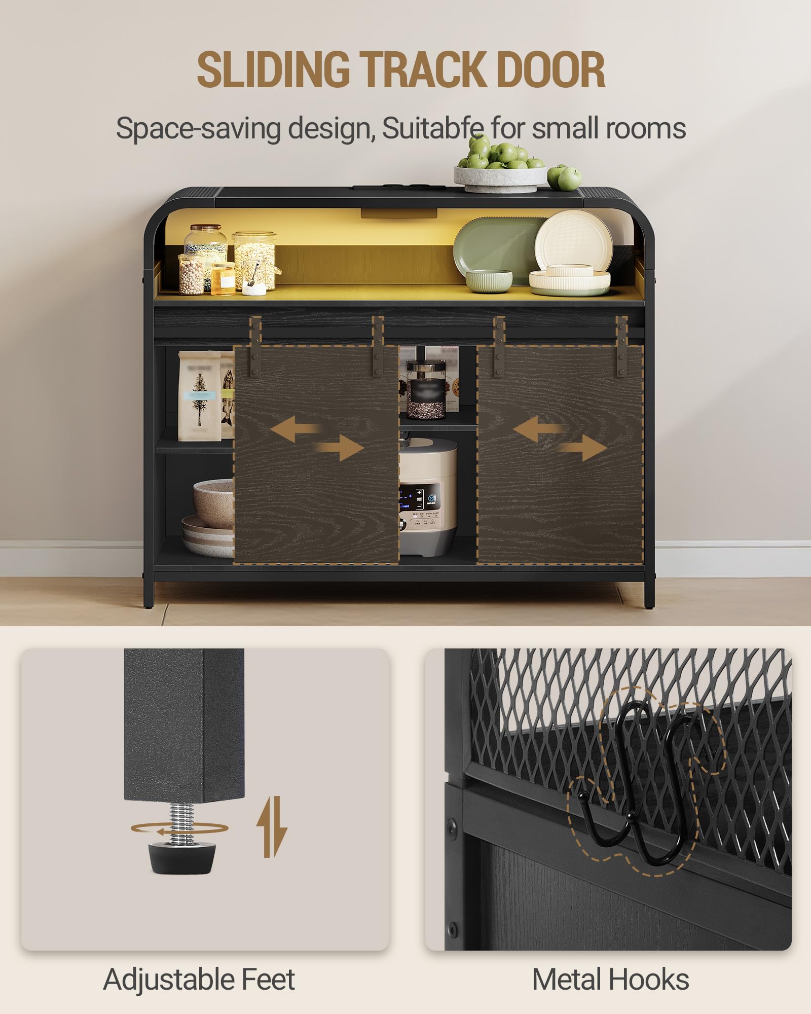 Hzuaneri SC00103WEU Kitchen Cabinet with LED Lighting, Sideboard with Power Strip, Storage Cabinet with 2 Sliding Doors, Adjustable Dividers, Kitchen, Dining Room, 35 x 100 x 80 cm, White