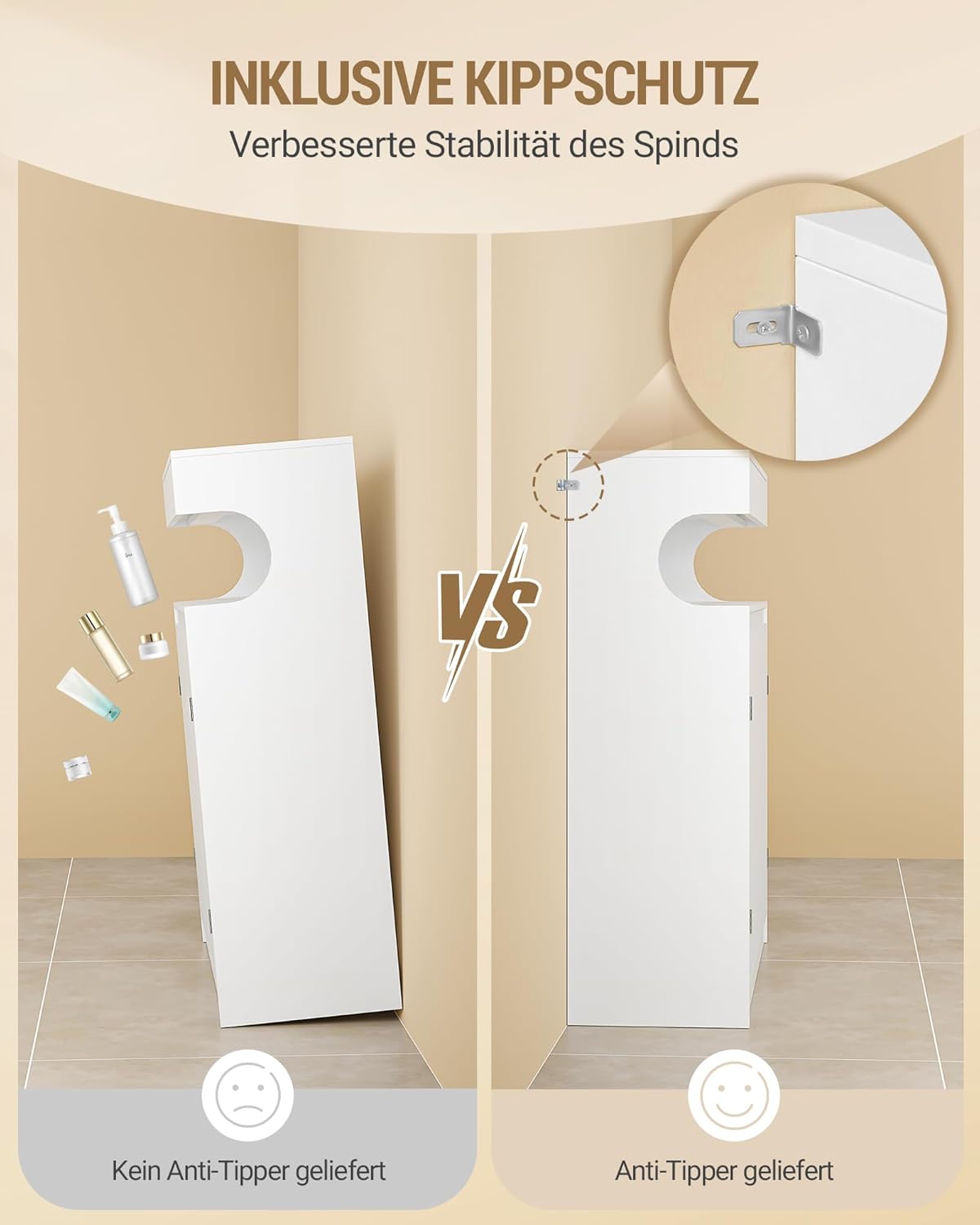 - Sturdy and stable design: this bathroom cabinet is made of MDF wood and durable metal. It has passed the 60kg load capacity test, ensuring a long service life. The included anti-slip set ensures that the cabinet stands stable under all circumstances. Trust in the reliability of this cabinet
