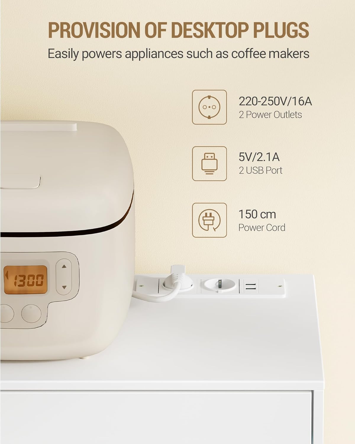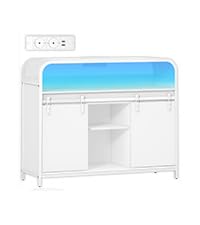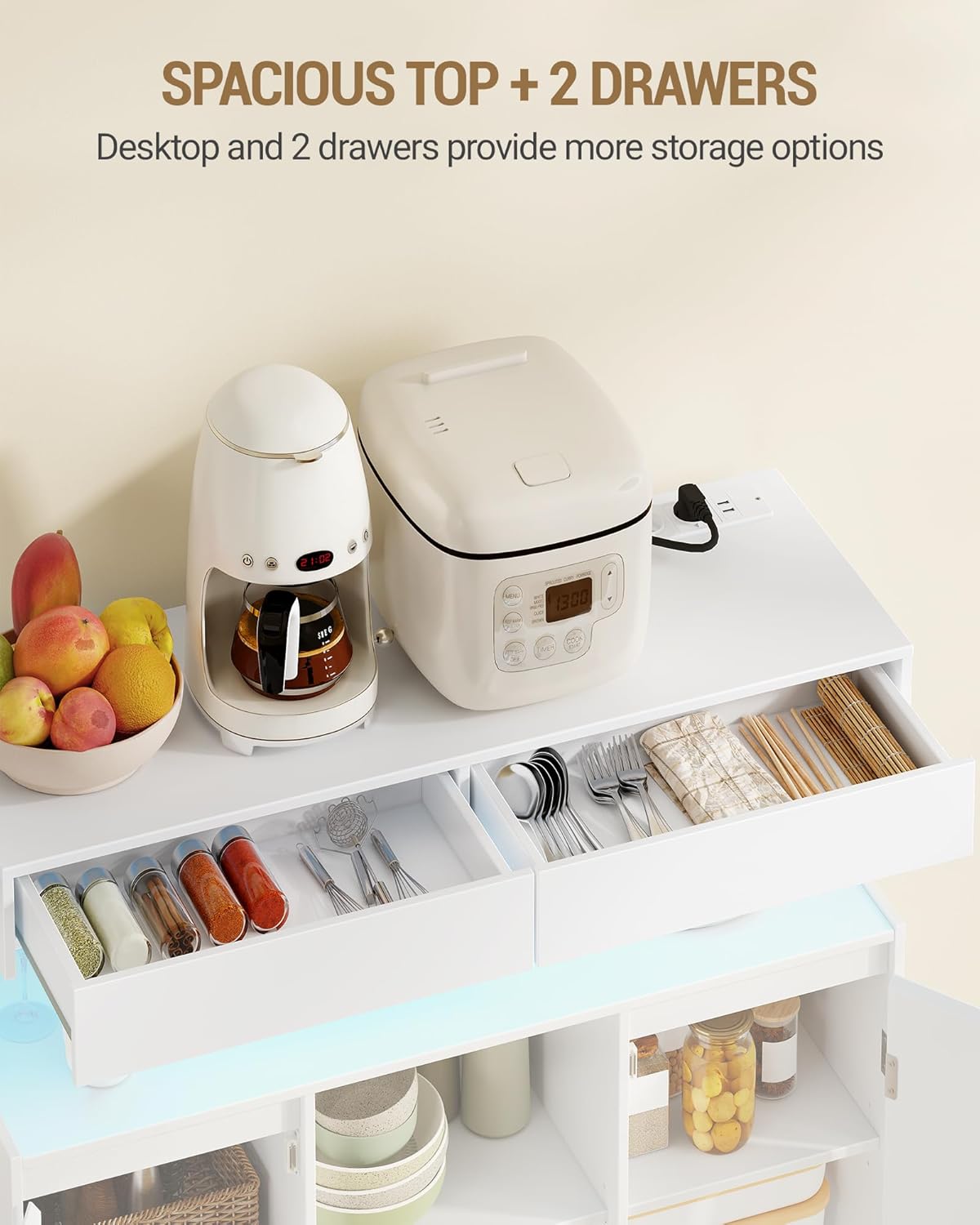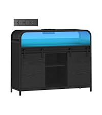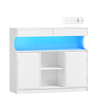 - With power strip and LED light strip: The storage cabinet is equipped with a power strip (with 2 AC and 2 USB ports) to power devices such as microwave ovens, coffee machines, hot air fryers, etc., and the hidden cable duct puts an end to tangled cables. It also has adjustable LED lights with 20 colours, 6 brightness levels, 10 flashing modes and 6 flashing frequencies, so you can create any atmosphere you want with the included remote control
