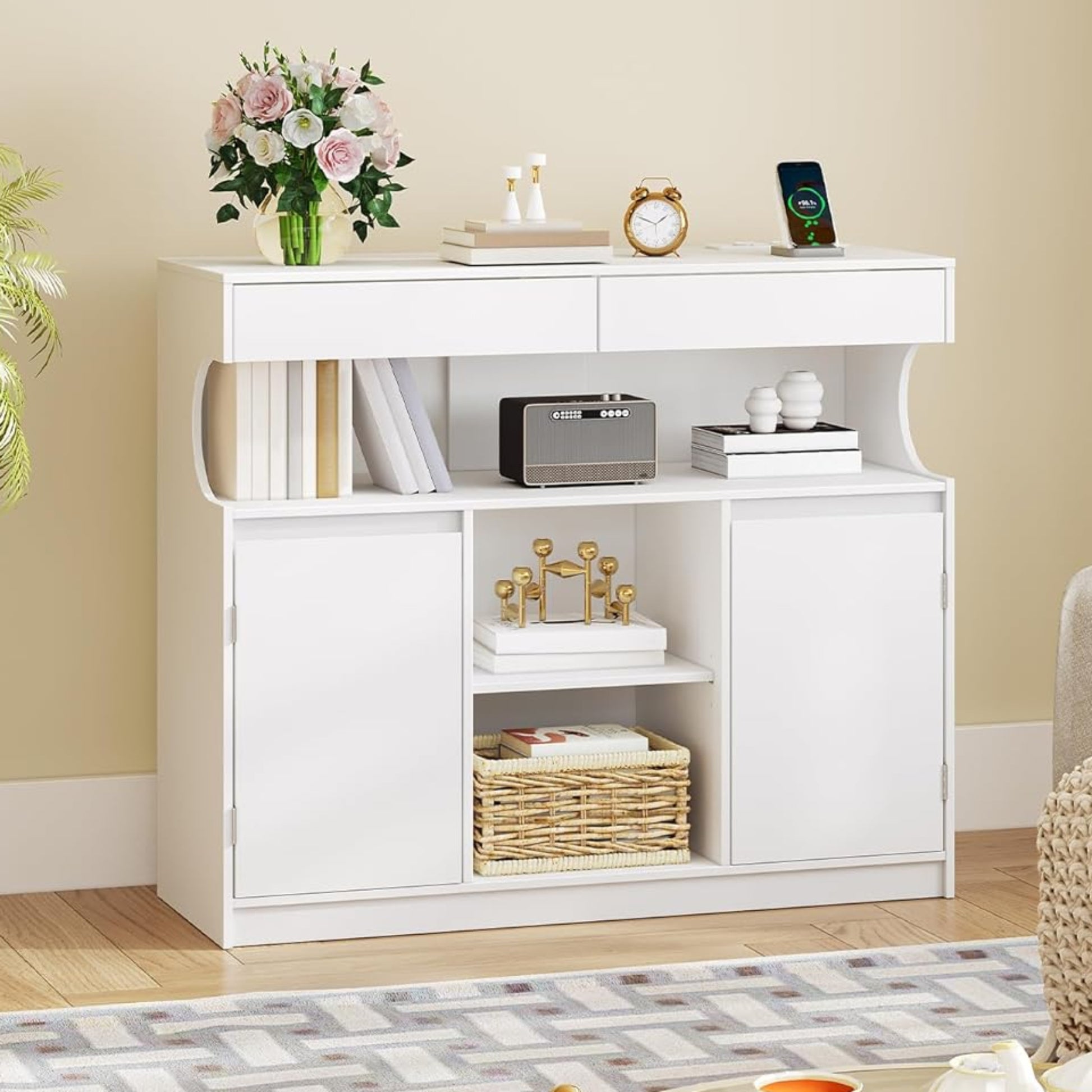 - [Generous storage space thanks to divider] This sideboard has a 100 cm long worktop and can be used as a breakfast corner and coffee bar to create a modern living atmosphere. Thanks to the double drawer construction on the top, small parts such as coffee spoons can be stowed invisible. The left and right cabinet doors + open display shelf can hold a whole set of wine utensils and tableware and can display green plants, ornaments, etc. in an appealing way