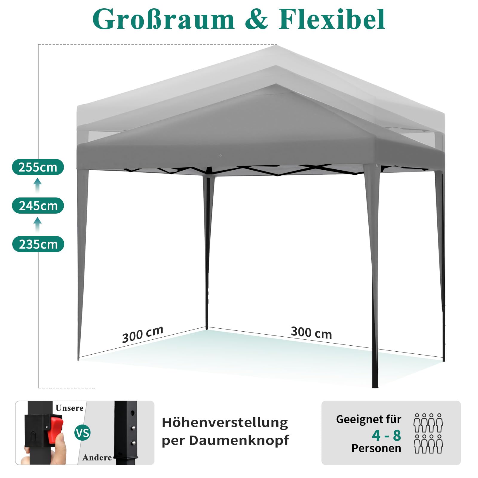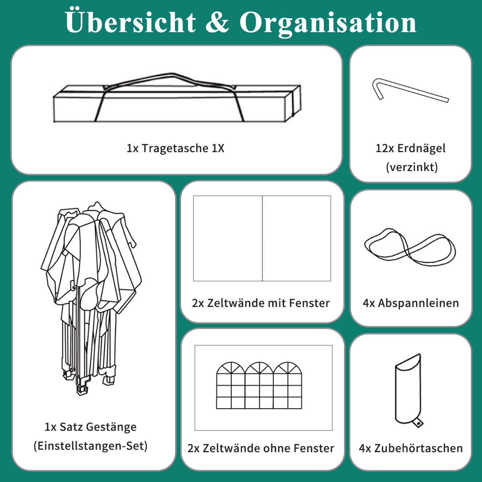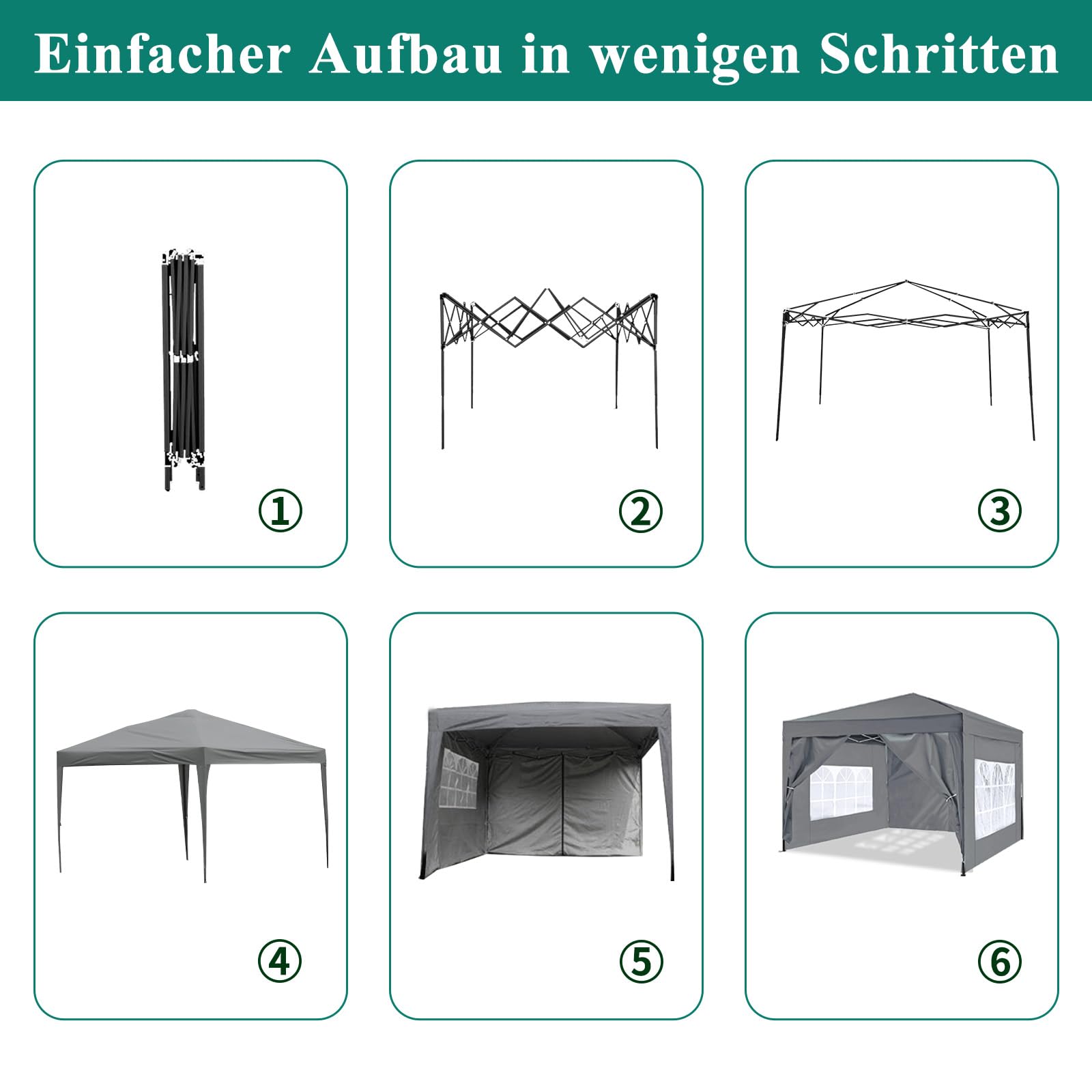 - Details: The weight of the frame is 9.9 kg, we offer you several pegs (12 pieces), so we guarantee a better stability of the tent. In addition to the detailed instructions (in German), the product consists of a 3x3 large folding gazebo, a carrying bag, a tension rope and as well as pegs (for anchoring the guy rope into the ground).