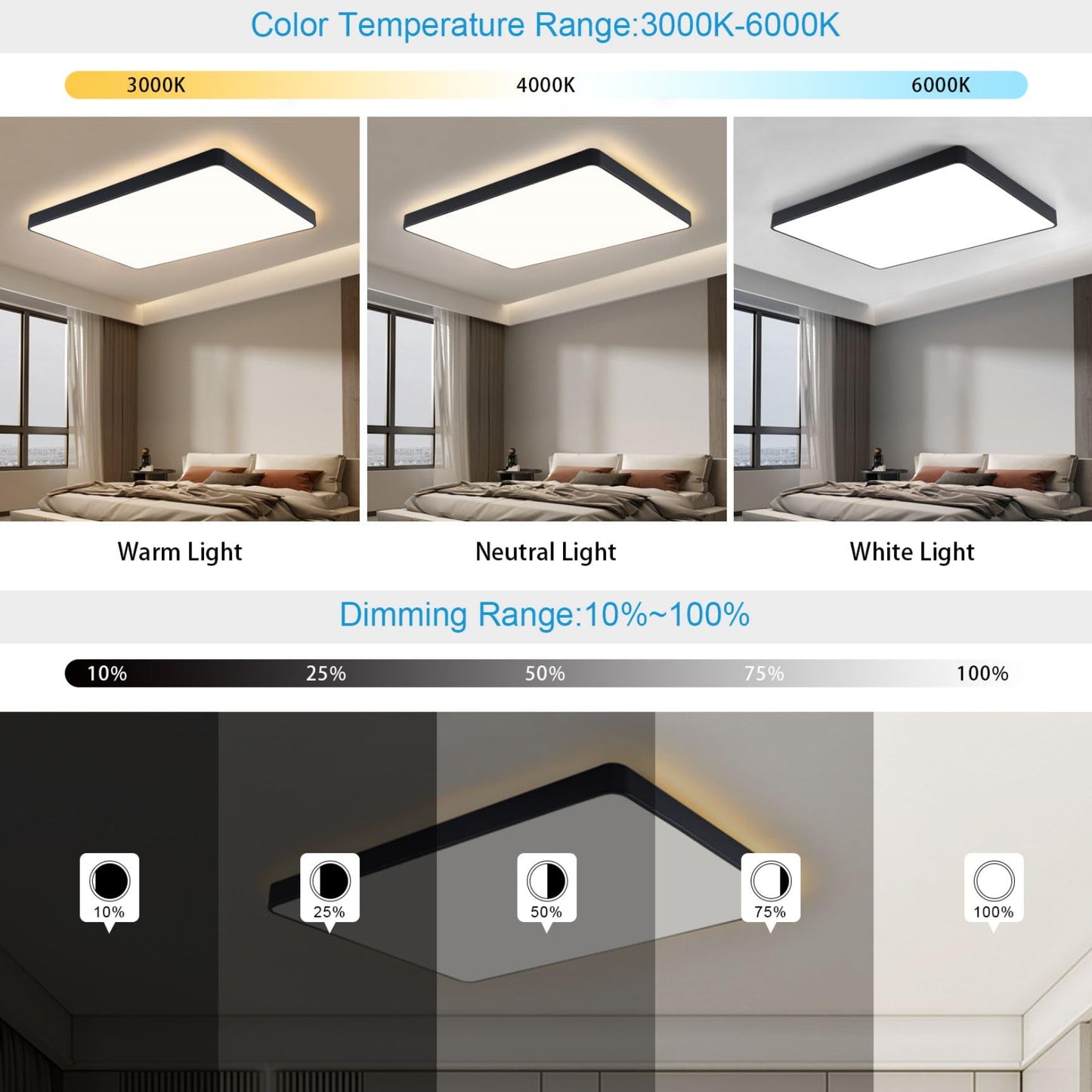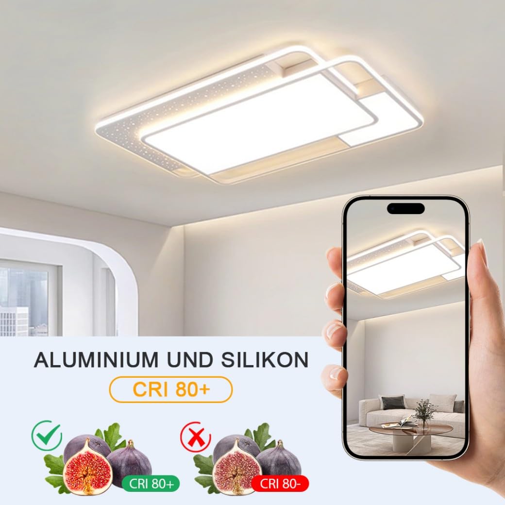 - Lichtstrom: Lichtverbrauch: 90W Spannung:230V Lumen: 7500LM Farbtemperatur: 3000K-6500K Größe: 90*55*6cm. Anwendungsbereich: 15-25m² Raum, sehr geeignet für Wohnzimmer, Arbeitszimmer, Büro usw. Einfache und elegante Deckenleuchte.