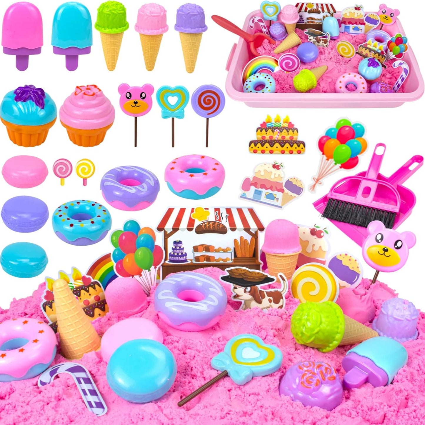 - Contains - 1 kg magic sand (pink), 17 sand moulds ice, 1 sandpit, 1 shovel tool, 1 small broom set and 9 decorations bow. The perfect combination of construction toy and sandpit enriches the fun.