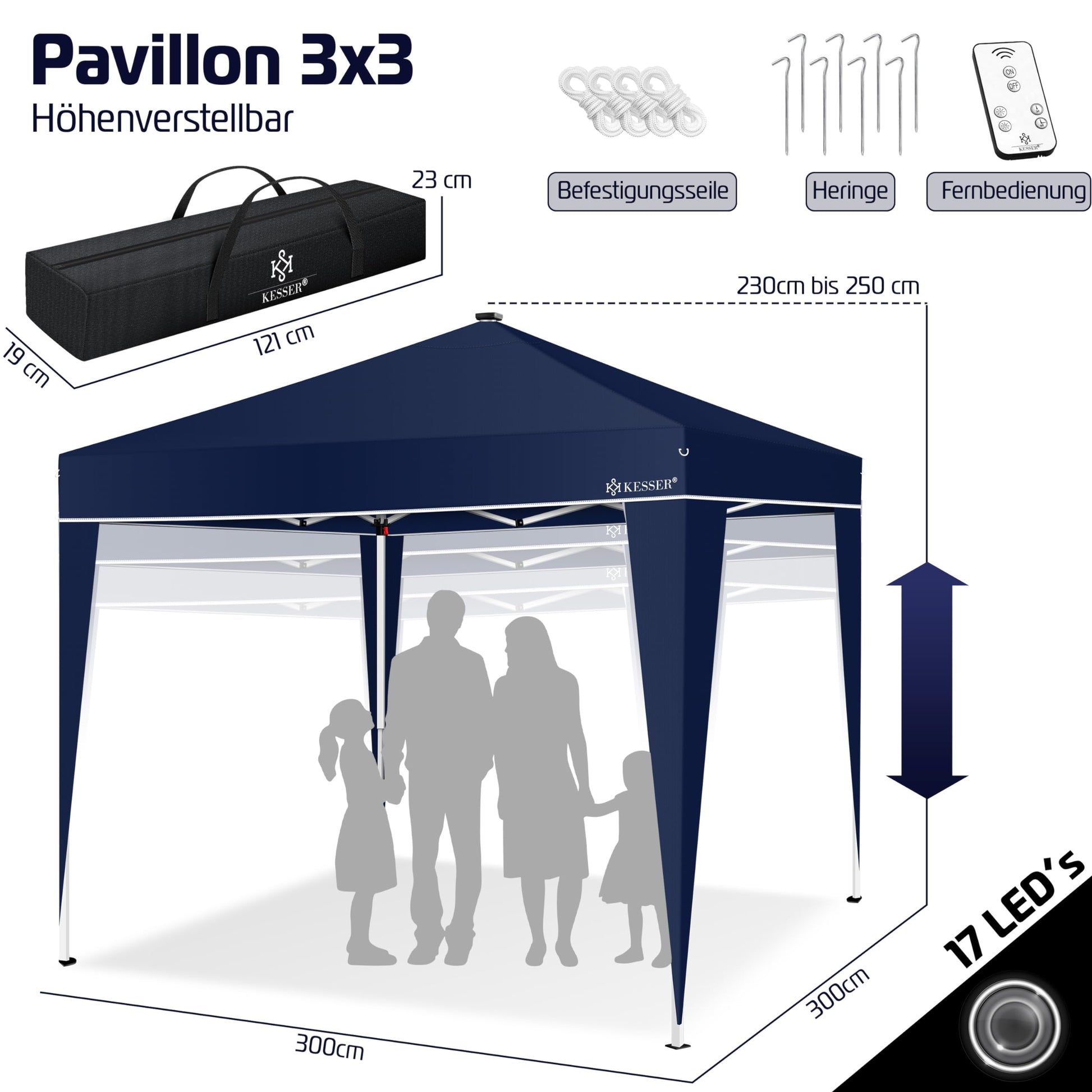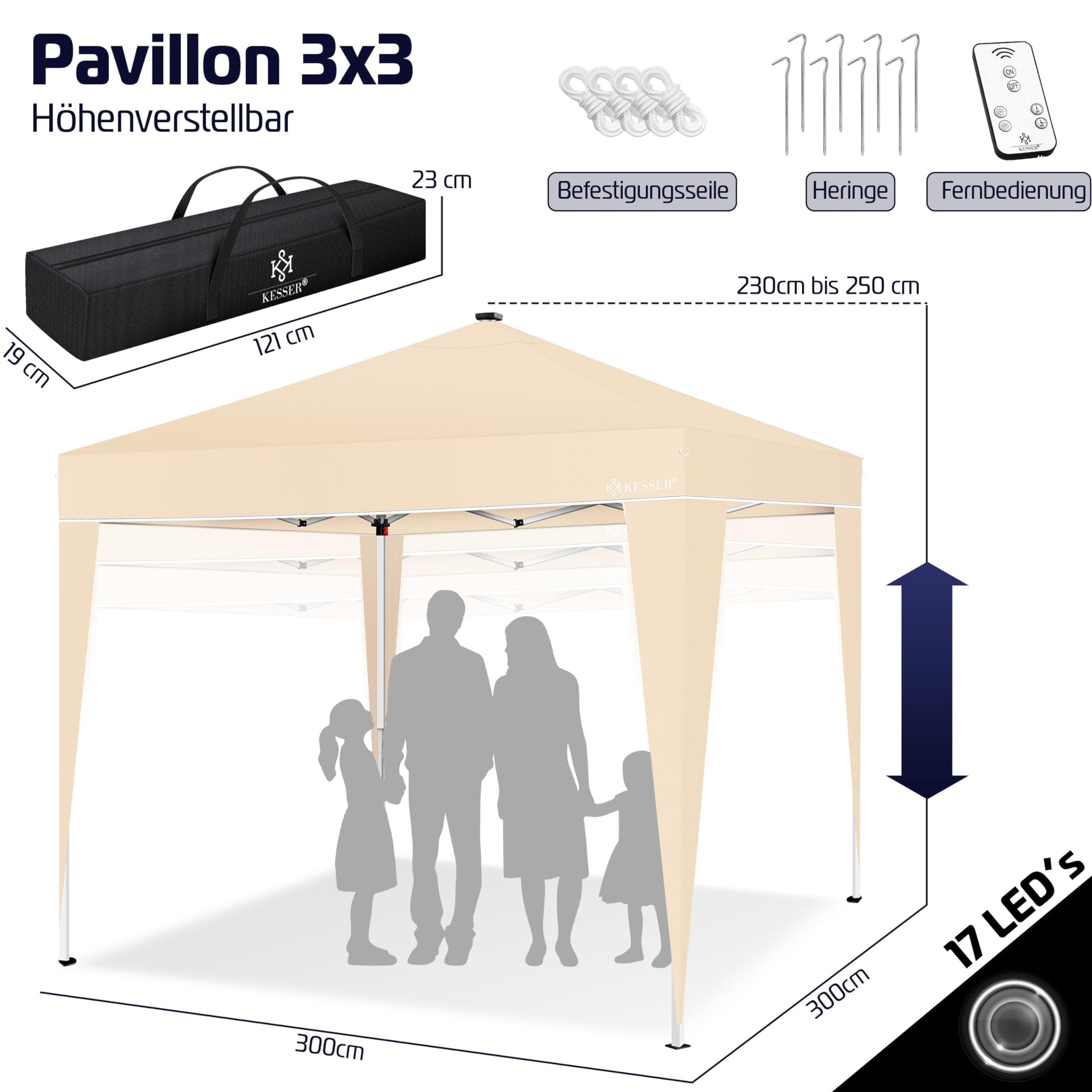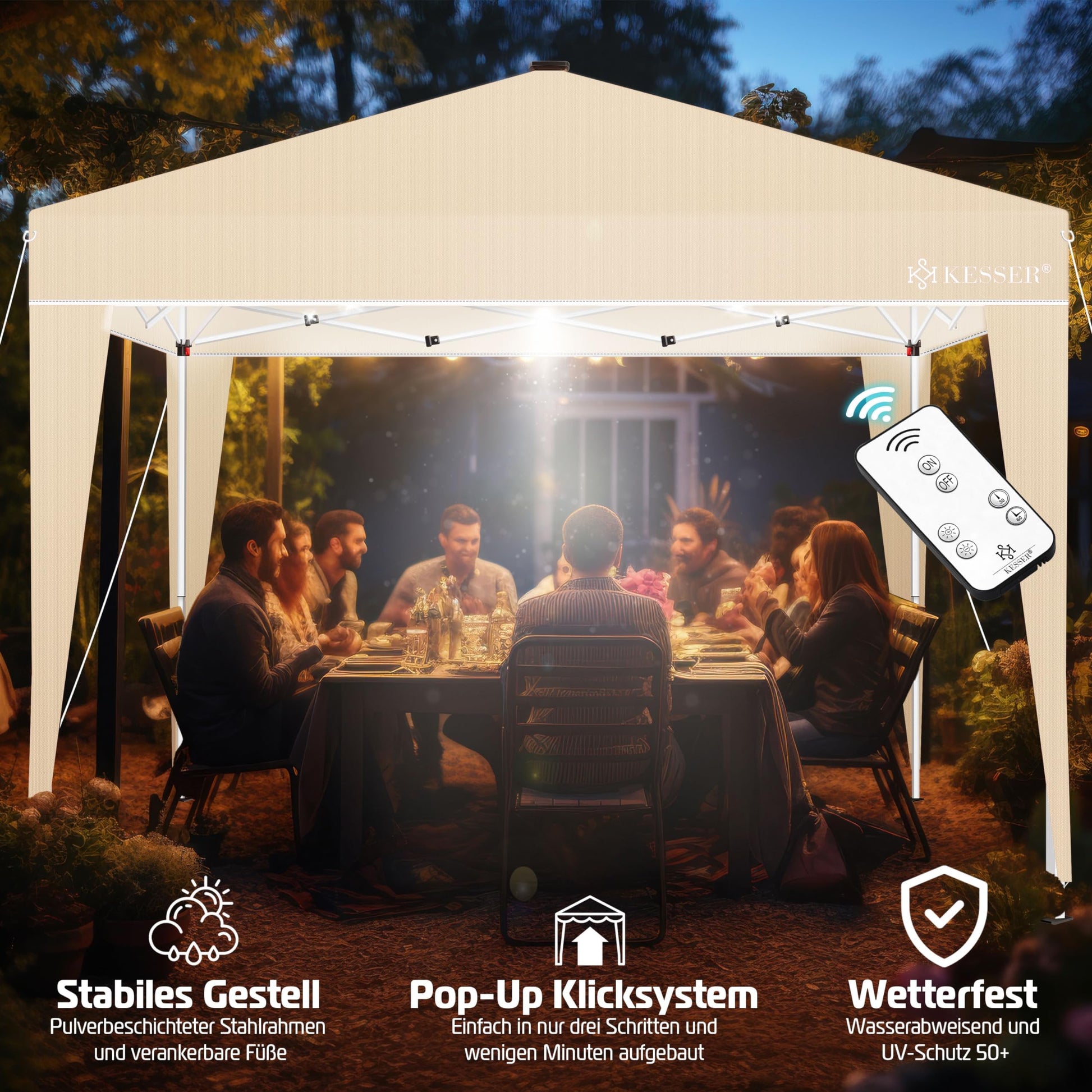 KESSER® Folding Gazebo 3 x 3 m with LED Lighting, Pop-Up Garden Gazebo, Height Adjustable, Stable, Waterproof, Winterproof, Party Tent, Marquee, UV Protection 50+, Includes Remote Control and Bag