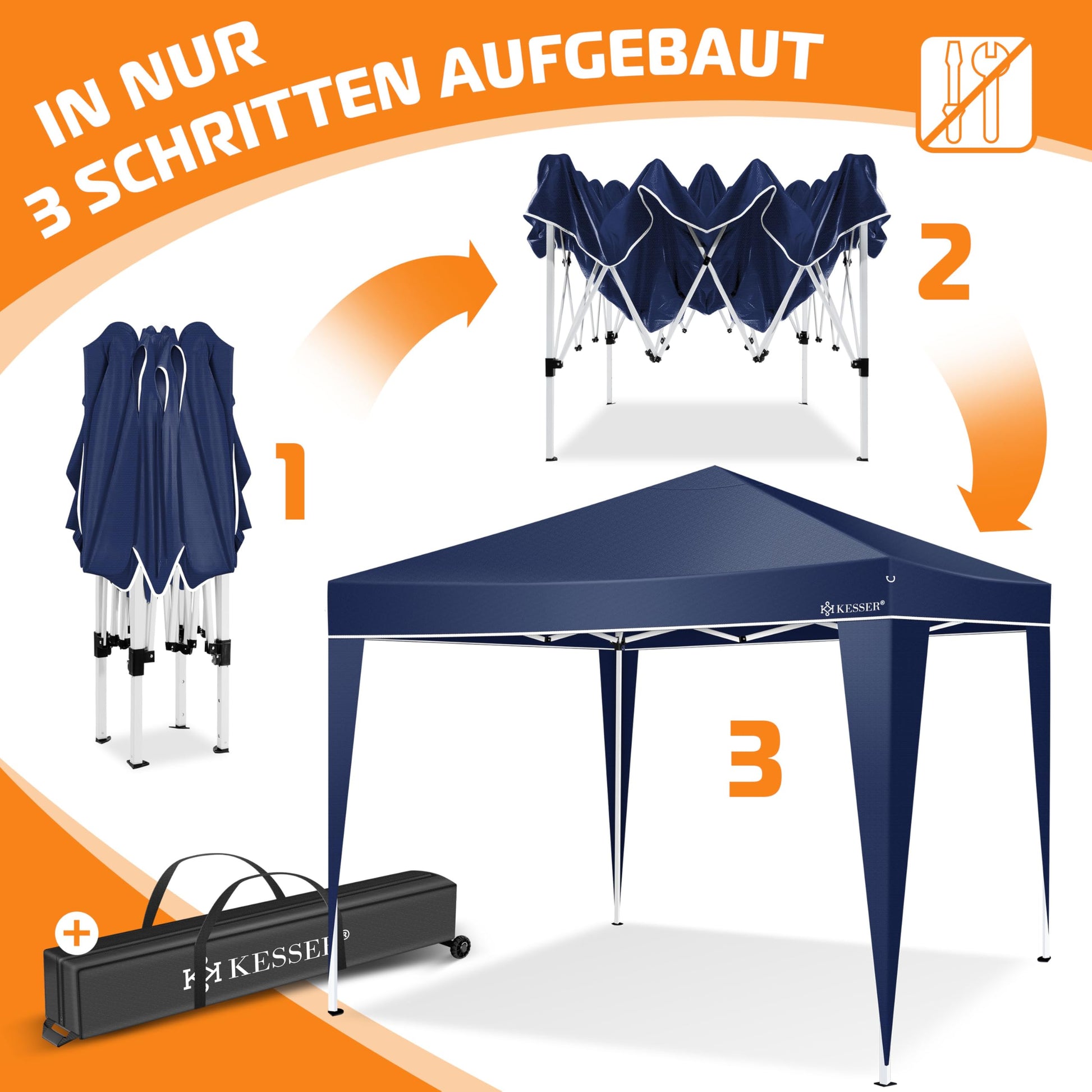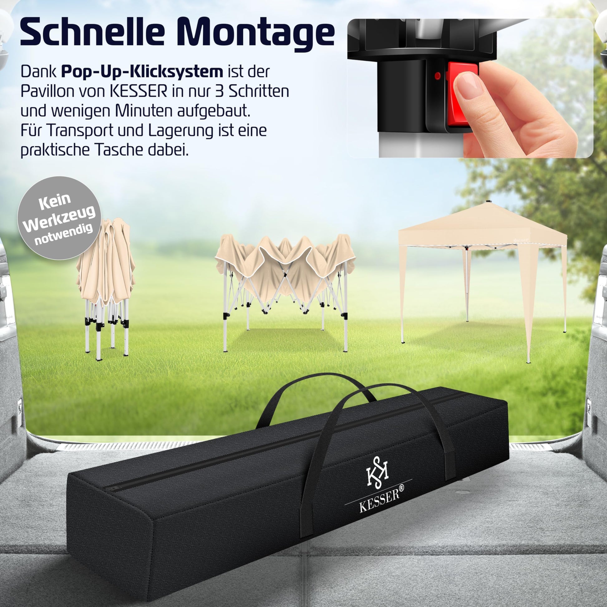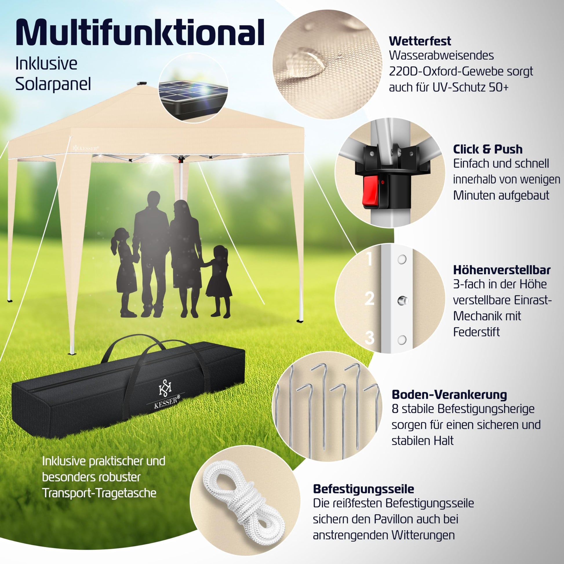 KESSER Pavillon UV-Schutz 50+, wasserabweisendes 220D-Oxford-Gewebe, schneller Aufbau dank Click & Push System. 3-fach höhenverstellbar, stabile Befestigung, reißfeste Seile für Stabilität. Tragetasche, Solarpanel mit 17 LEDs. Pop-Up-Klicksystem, pulverbeschichteter Stahlrahmen. Idealer Outdoor-Begleiter! Dieser hochwertige Pavillon kombiniert anspruchsvolles Design mit praktischen Funktionen, um Ihnen ein unvergleichliches Outdoor-Erlebnis zu bieten.
