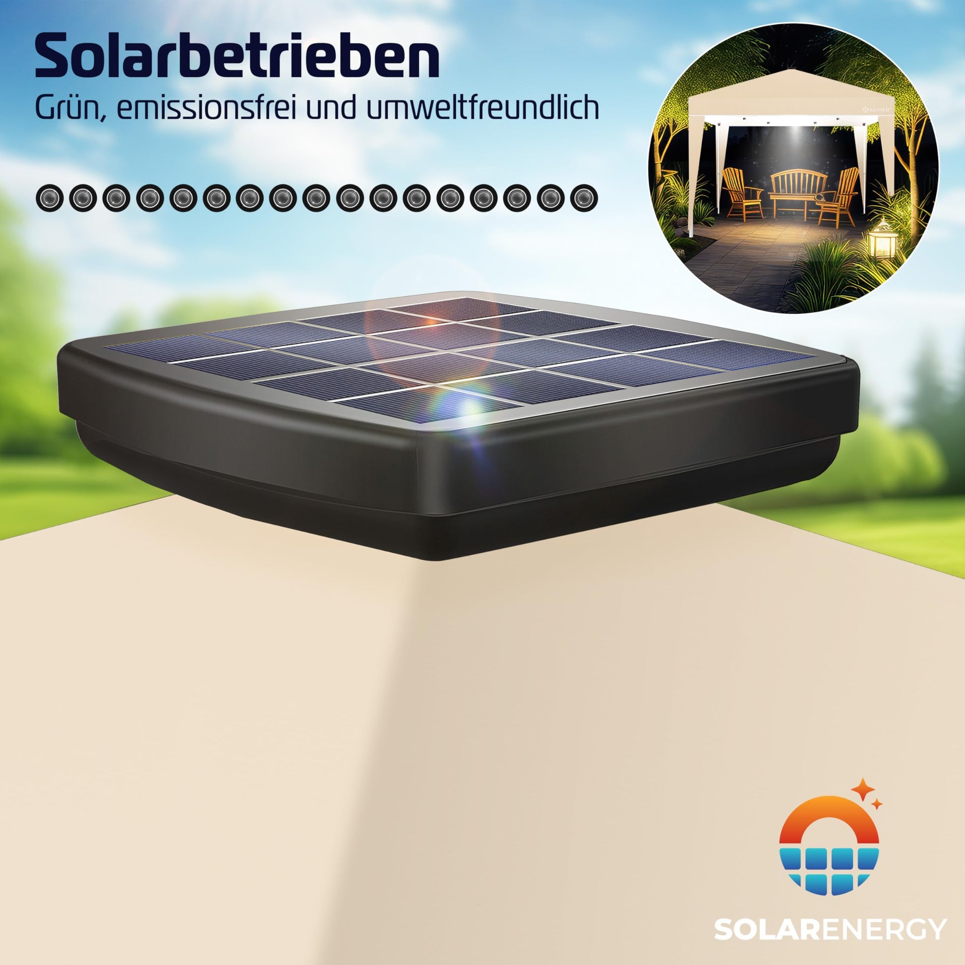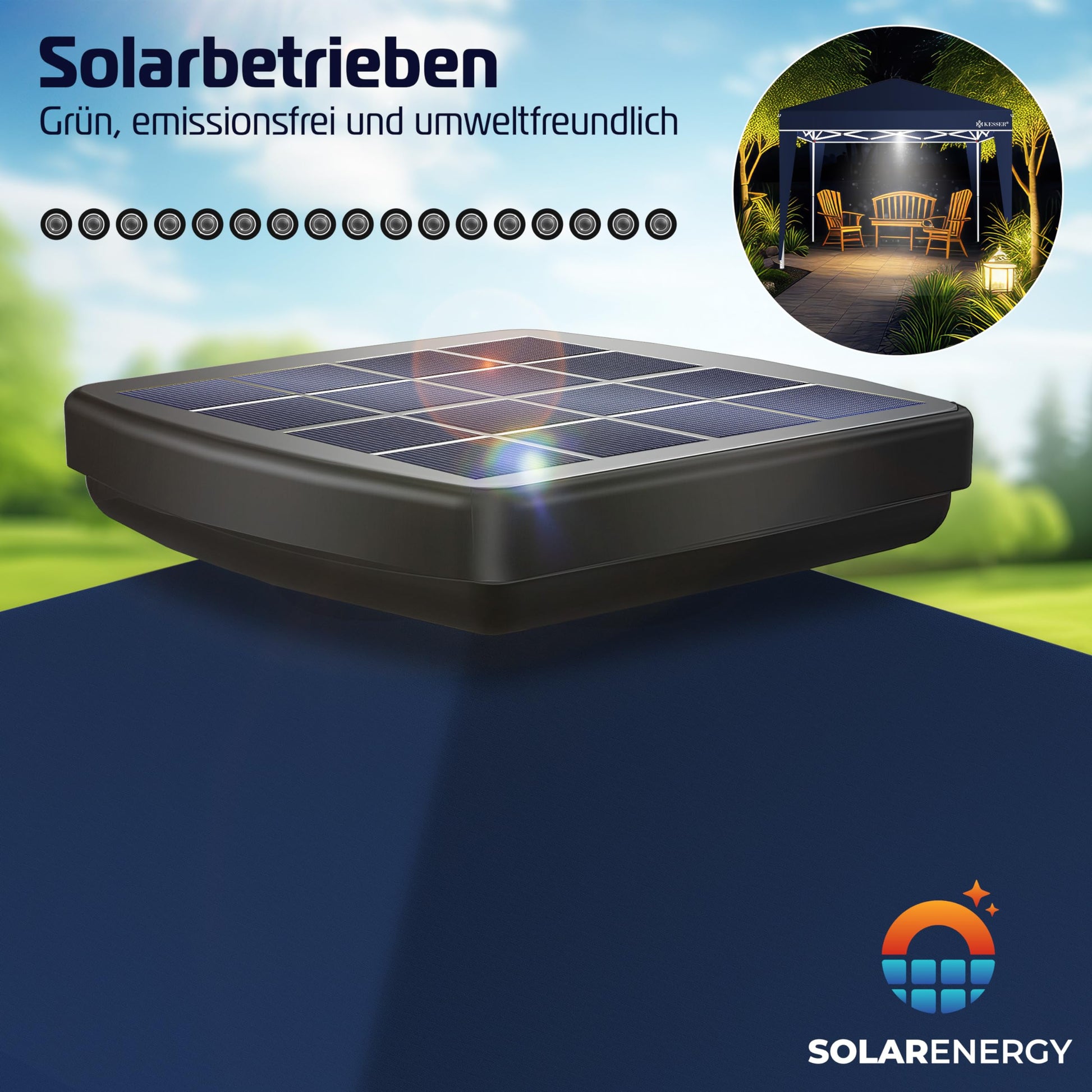 Ein herausragendes Merkmal dieses Pavillons ist das enthaltene Solarpanel. Insgesamt 17 LEDs bieten klare Sicht in den Abendstunden, sodass Ihre Veranstaltung auch bei Dunkelheit im besten Licht erstrahlt.