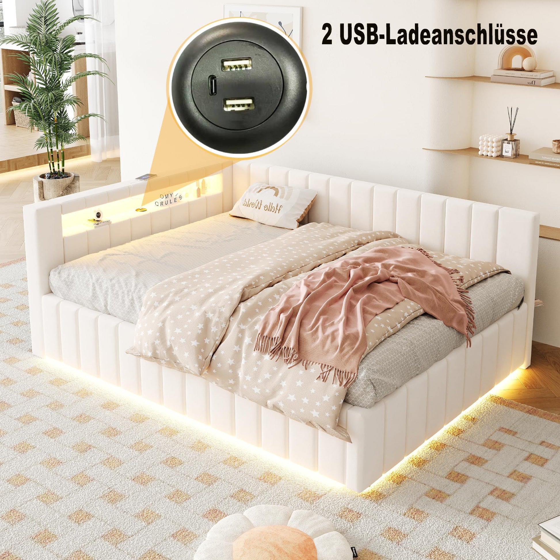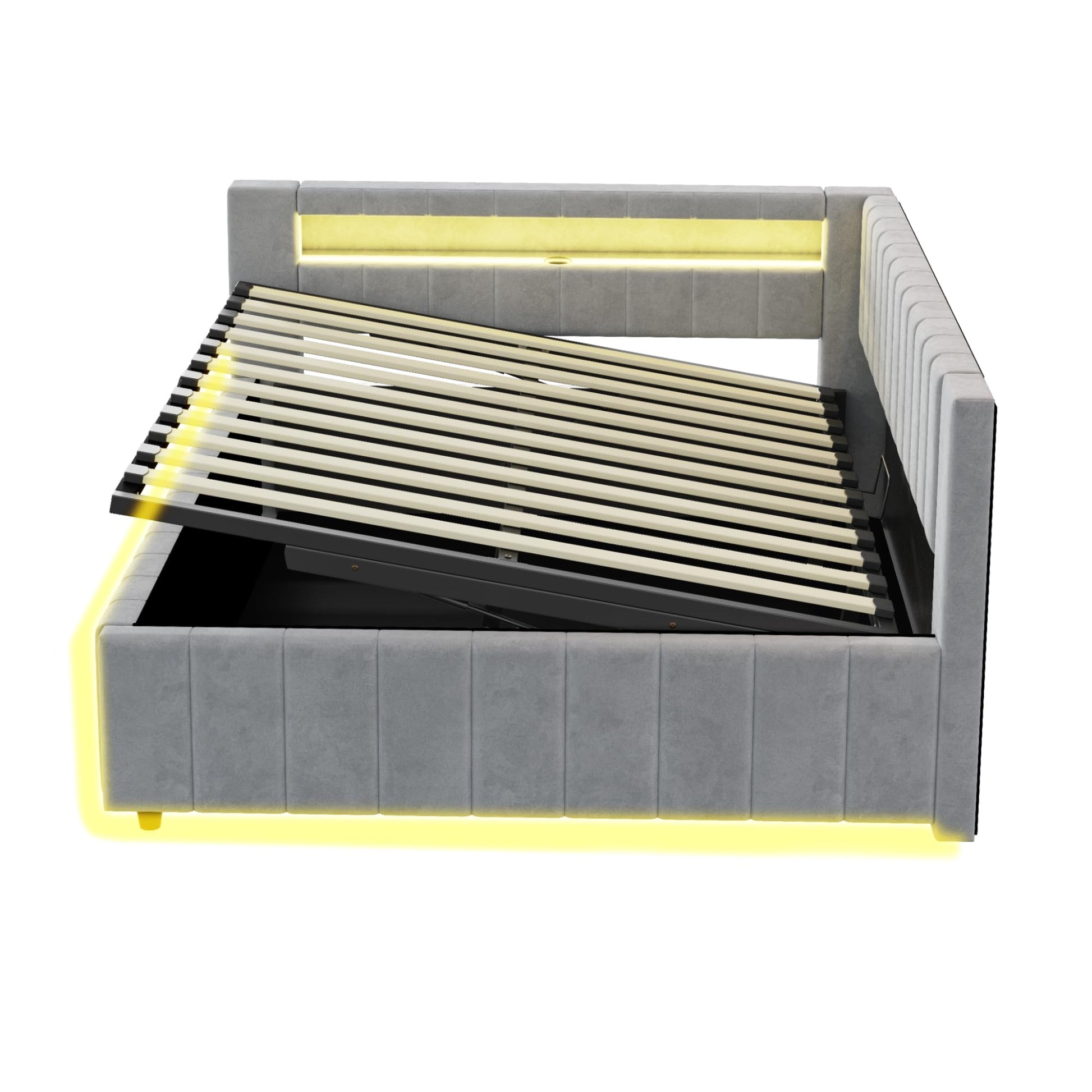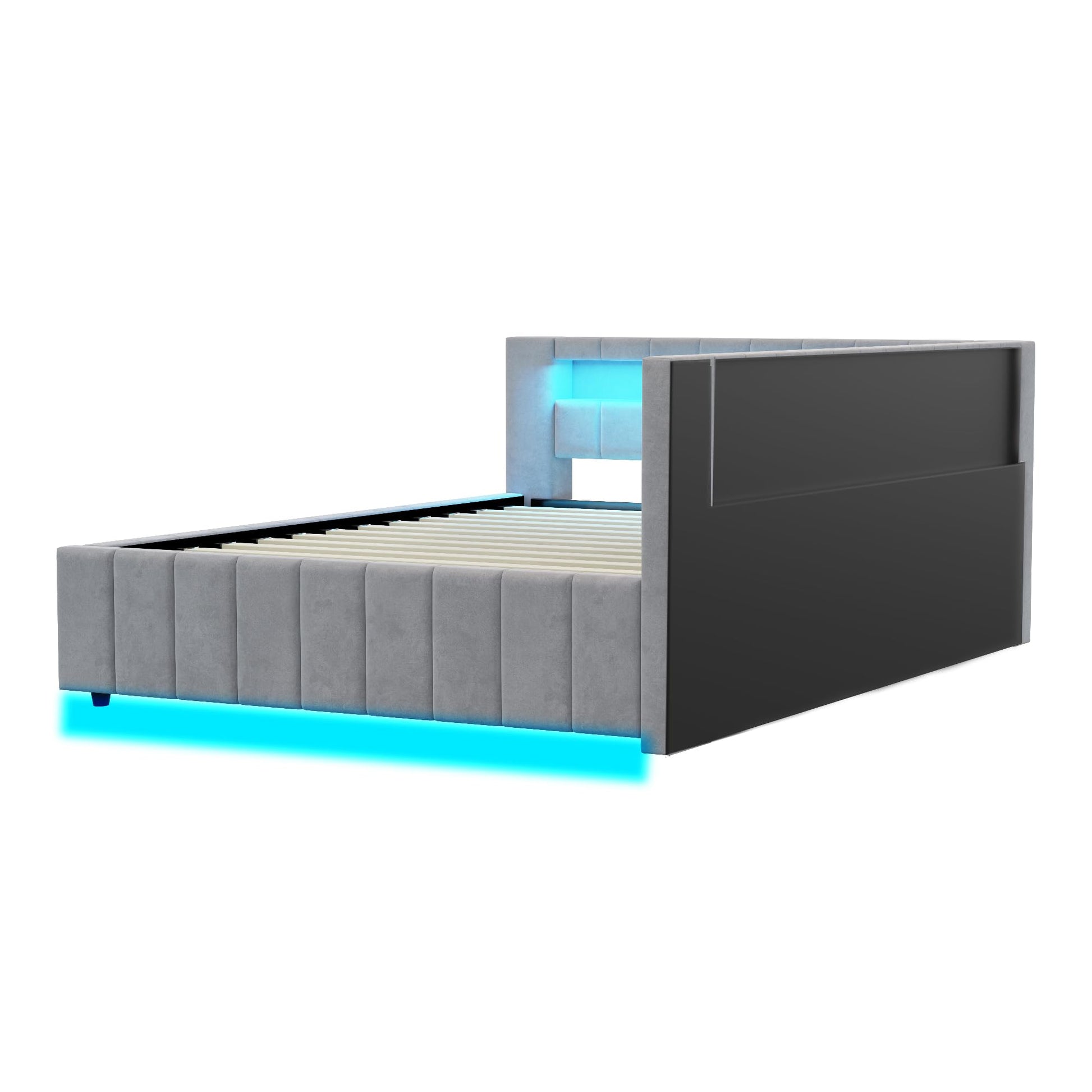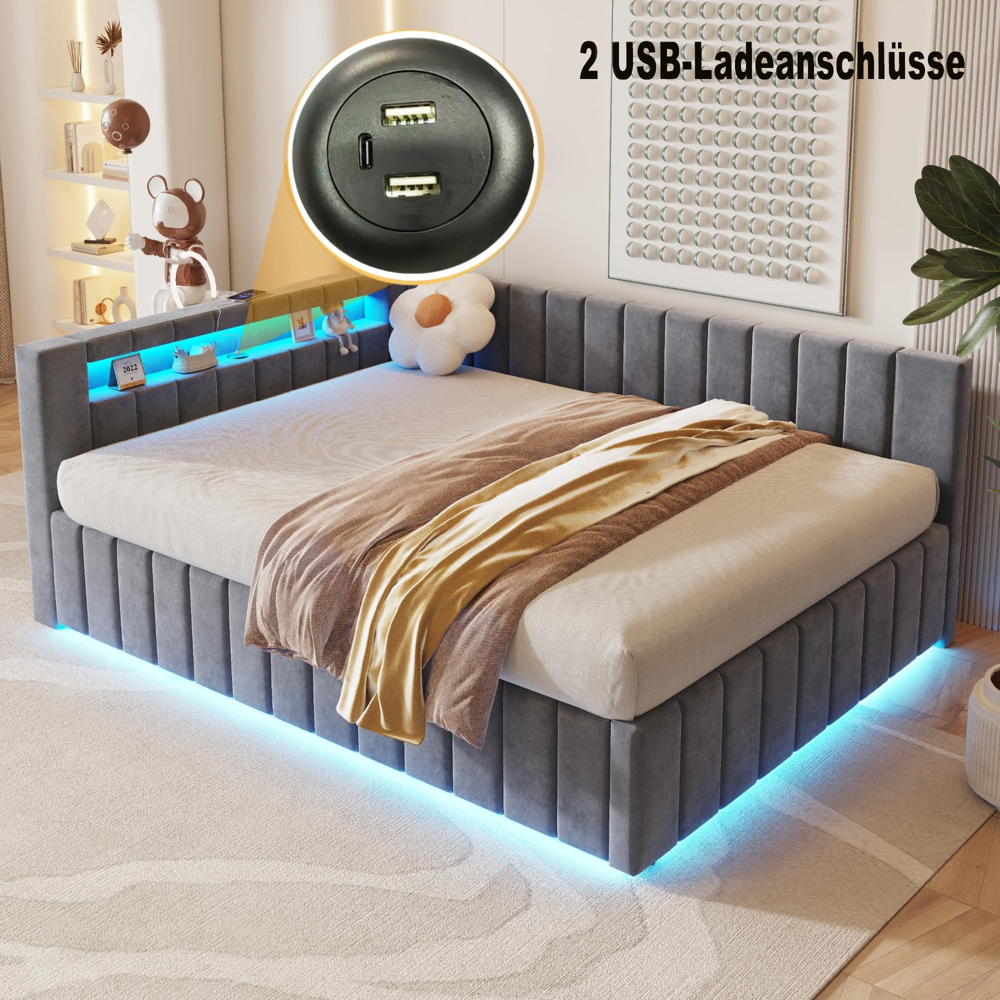 KEYIDE Upholstered Sofa Bed, 140 x 200 cm with LED Lighting and USB Charging, Bed Frame with Wooden Slatted Frame, Day Bed, Guest Bed, Youth Bed, Velvet Fabric, Without Mattress (Grey, 140 x 200)