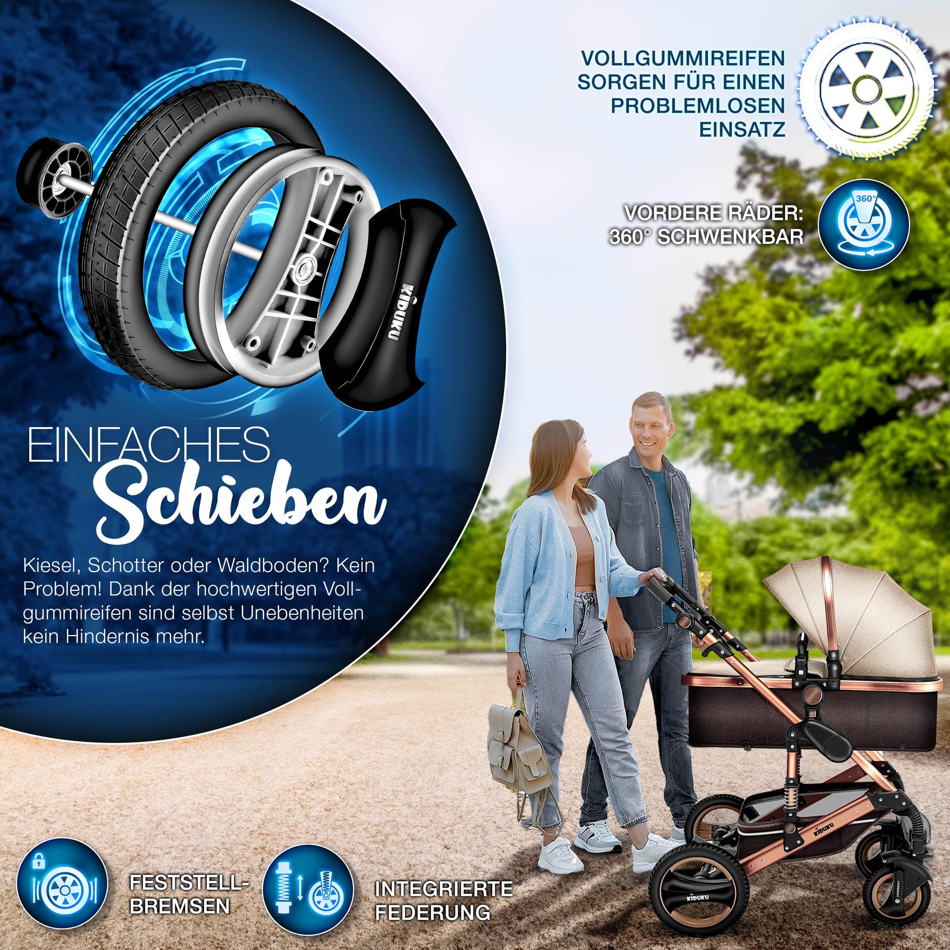 - Full rubber tyres: Our pram impresses with innovative solid rubber tyres that ensure excellent off-road suitability and durability. The parking brake on the rear wheels ensures optimal control, the suspension in four places provides maximum comfort for the child, and the 360° swivel front wheels allow effortless steering and manoeuvrability. This combination of tyres, brake, suspension and swivel wheels makes our pram the ideal companion for parents who place the highest demands on versatility, safety and comfort.