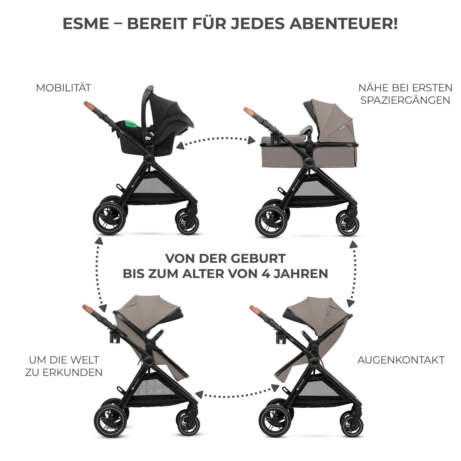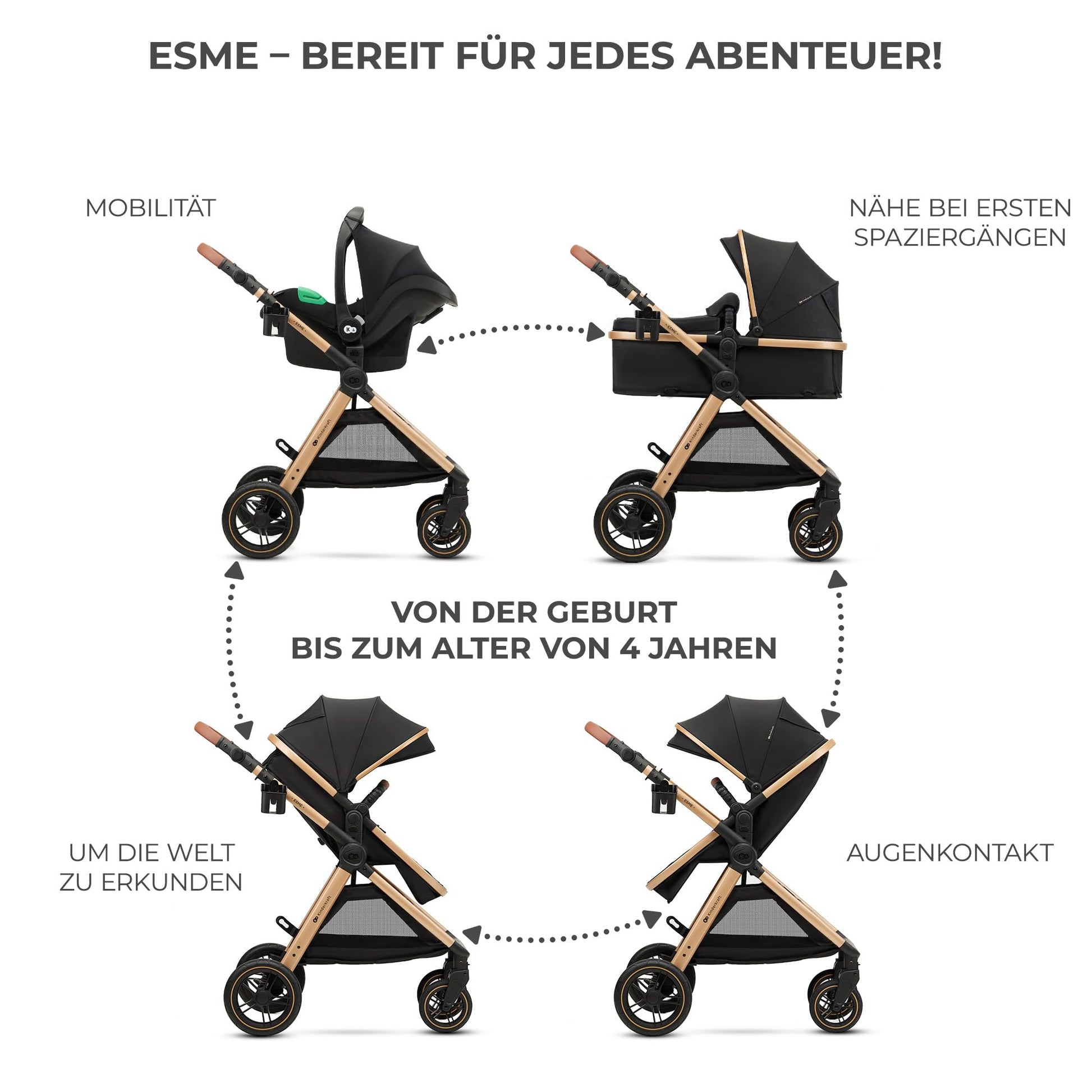 - For any terrain: 3-in-1 ESME pushchair is equipped with 4 large, cushioned wheels made of puncture-proof TPE rubber. They not only ensure driving comfort for the child, but also ensure smooth steering behaviour on uneven terrain. This pushchair is suitable for both the city and beaten forest paths.