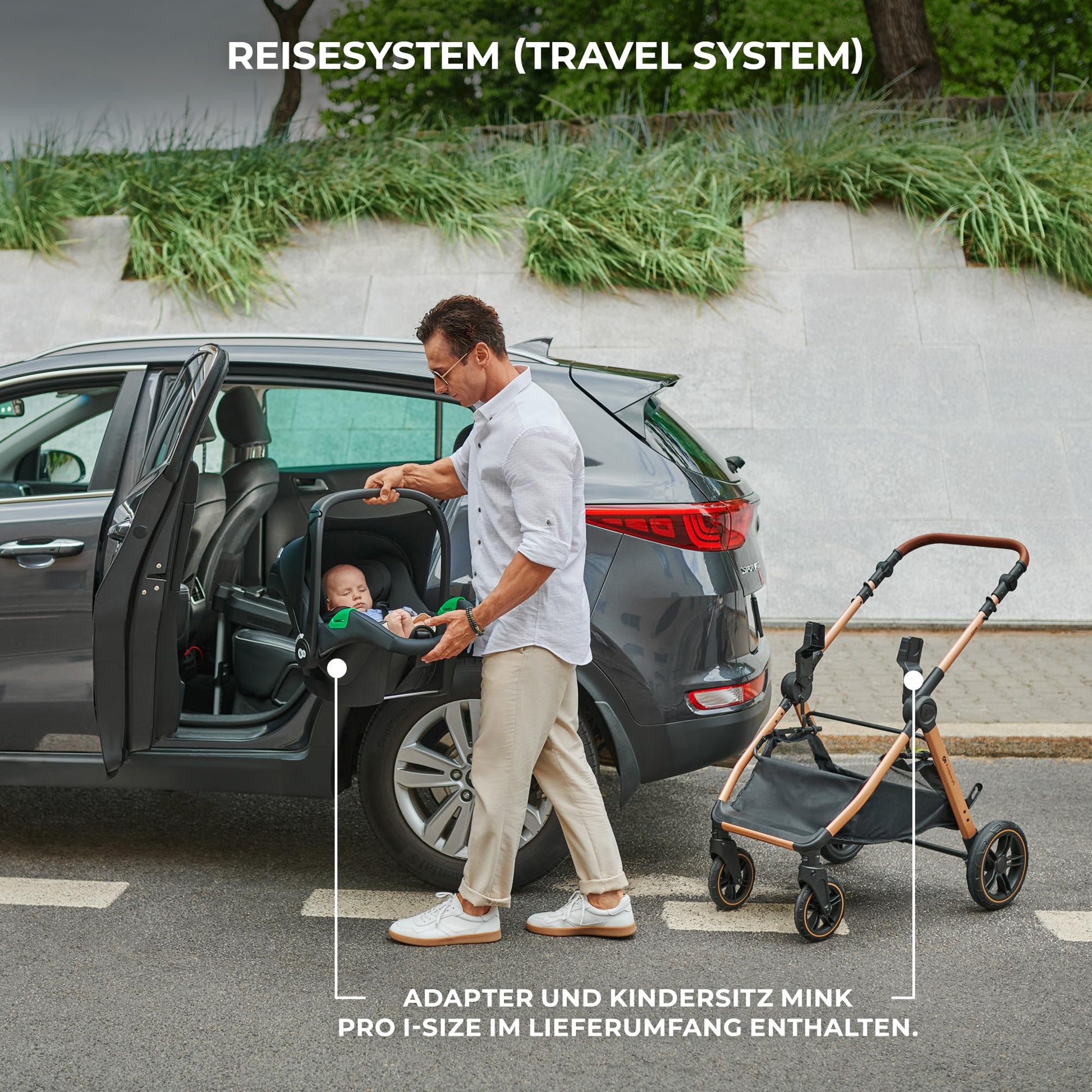 - Travel system (TRAVEL SYSTEM): With the adapters from ESME, the included Mink Pro i-Size child seat 40-75 cm can be latched into the frame, creating a practical travel system. In the car, the child seat is attached to the vehicle belt in the safest position, i.e. backwards.