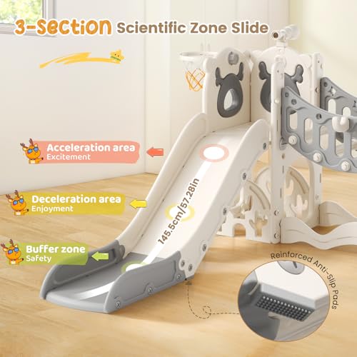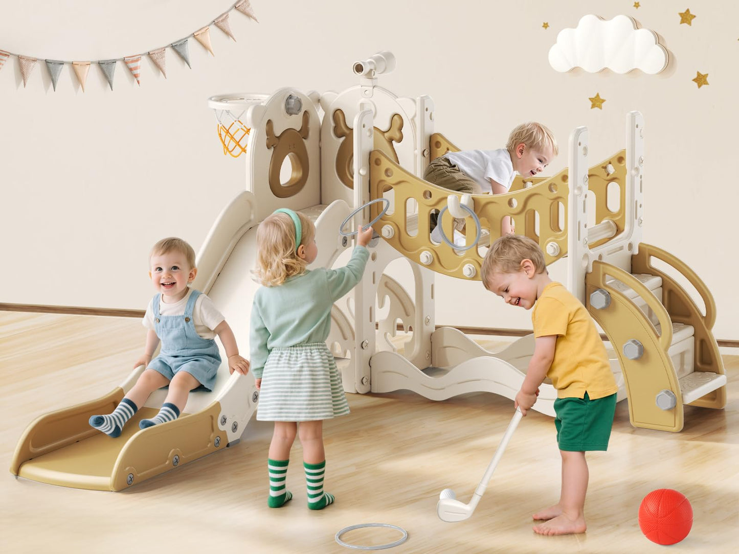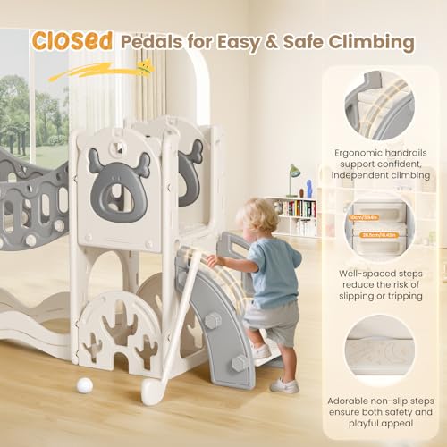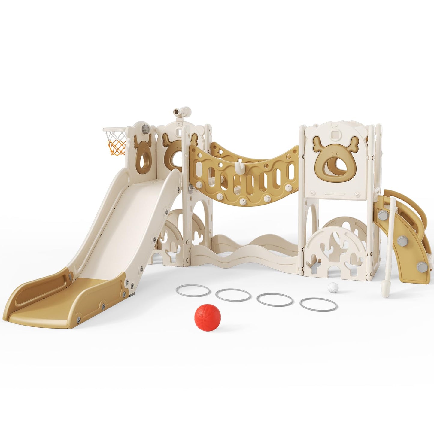 - Vielseitigkeit: Die Kleinkindrutsche bietet zahlreiche interaktive Spielfunktionen, darunter eine Kleinkindrutsche, eine Kletterbrücke, ein Ringwurfspiel, einen Basketballkorb, ein Teleskop, eine Treppe, ein Golfset und Stauraum. So wird aktives Spielen und die allgemeine Entwicklung von Kleinkindern gefördert.