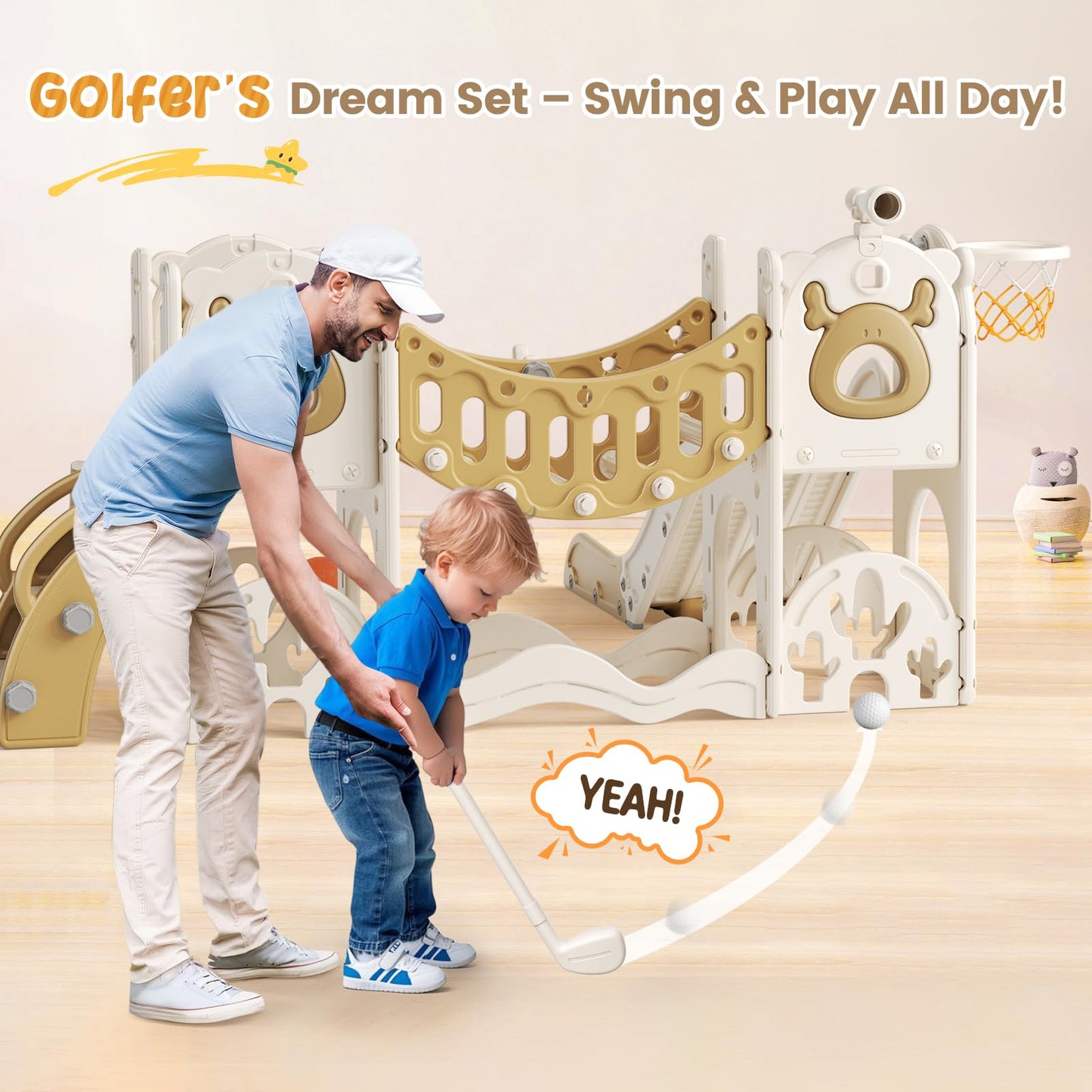 Kinderrutsche, Kleinkindrutsche mit Weihnachtselchmotiv Kleinkinderrutsche mit Golfset, Babyrutsche, Spielplatzgerät, für den Innen- und Außenbereich freistehend Babyrutsche (Khaki-6-in-1- Active)