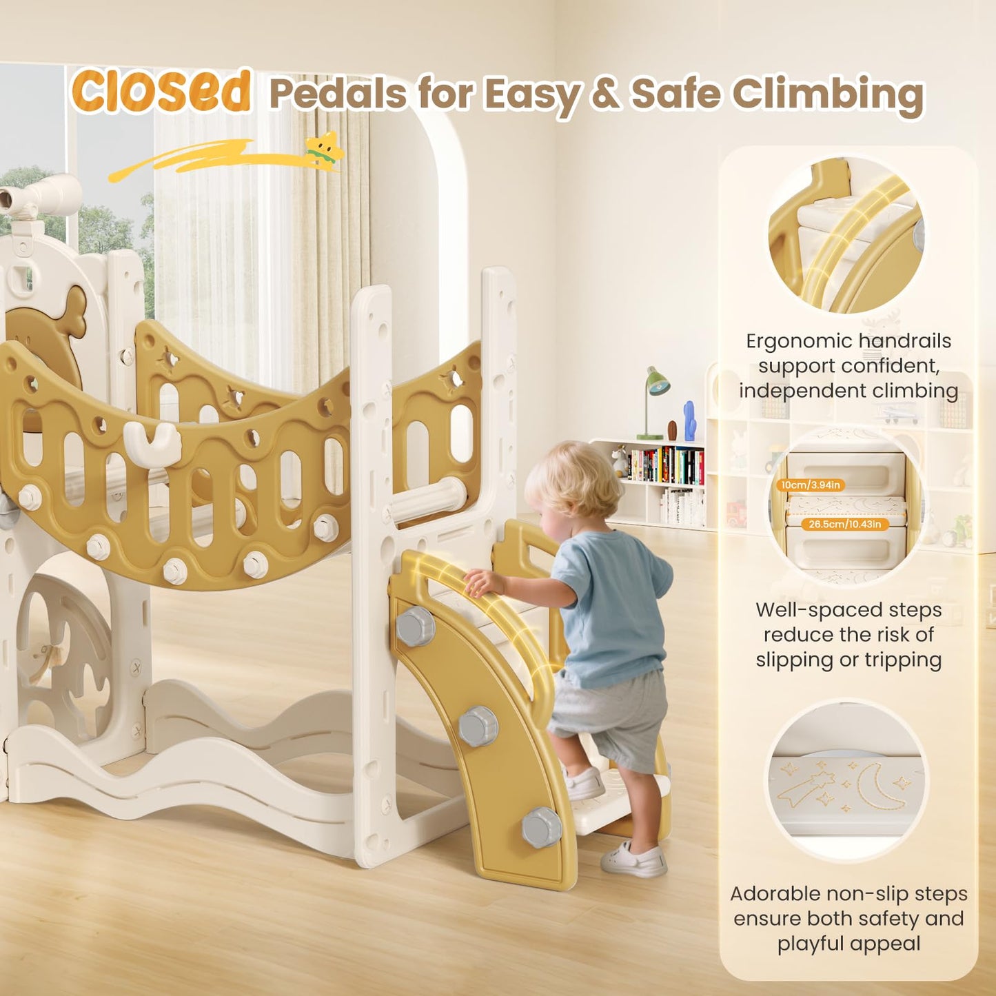 - Sicheres Spieldesign: Bei jedem Element des Sets steht die Sicherheit im Vordergrund. Die Rutsche verfügt über Anti-Rutsch-Pads, vollständig geschlossene Kletterstufen und stabile Handläufe an Rutsche und Treppe sorgen für eine sichere Spielumgebung für Kleinkinder.