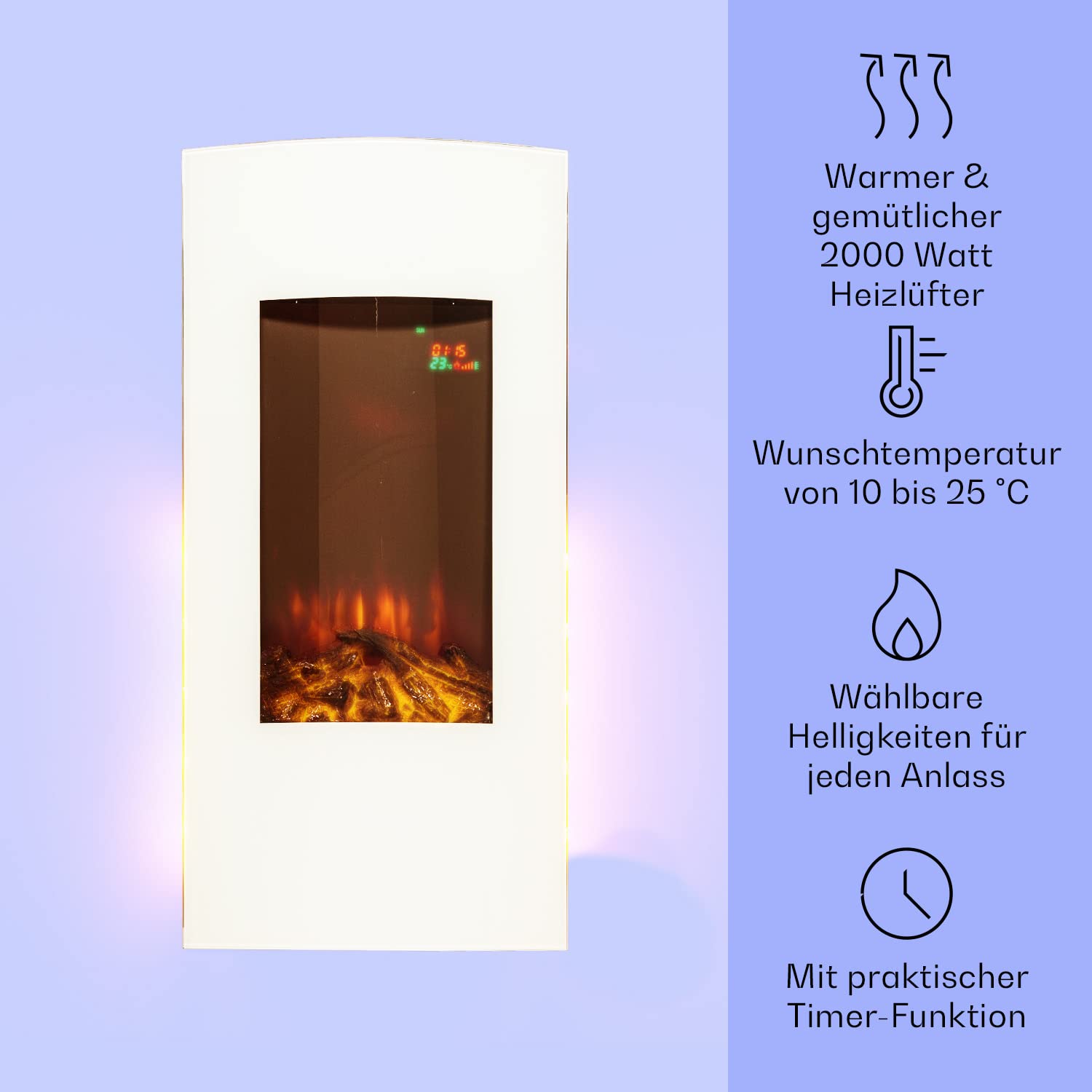 Klarstein Electric Fireplace, Electric Heaters for Living Room and Indoor Spaces, Electric Fireplace with LED Flames, Fireplace for Wall Mounting, Fan Heater with Timer, Adjustable Thermostat, Heating