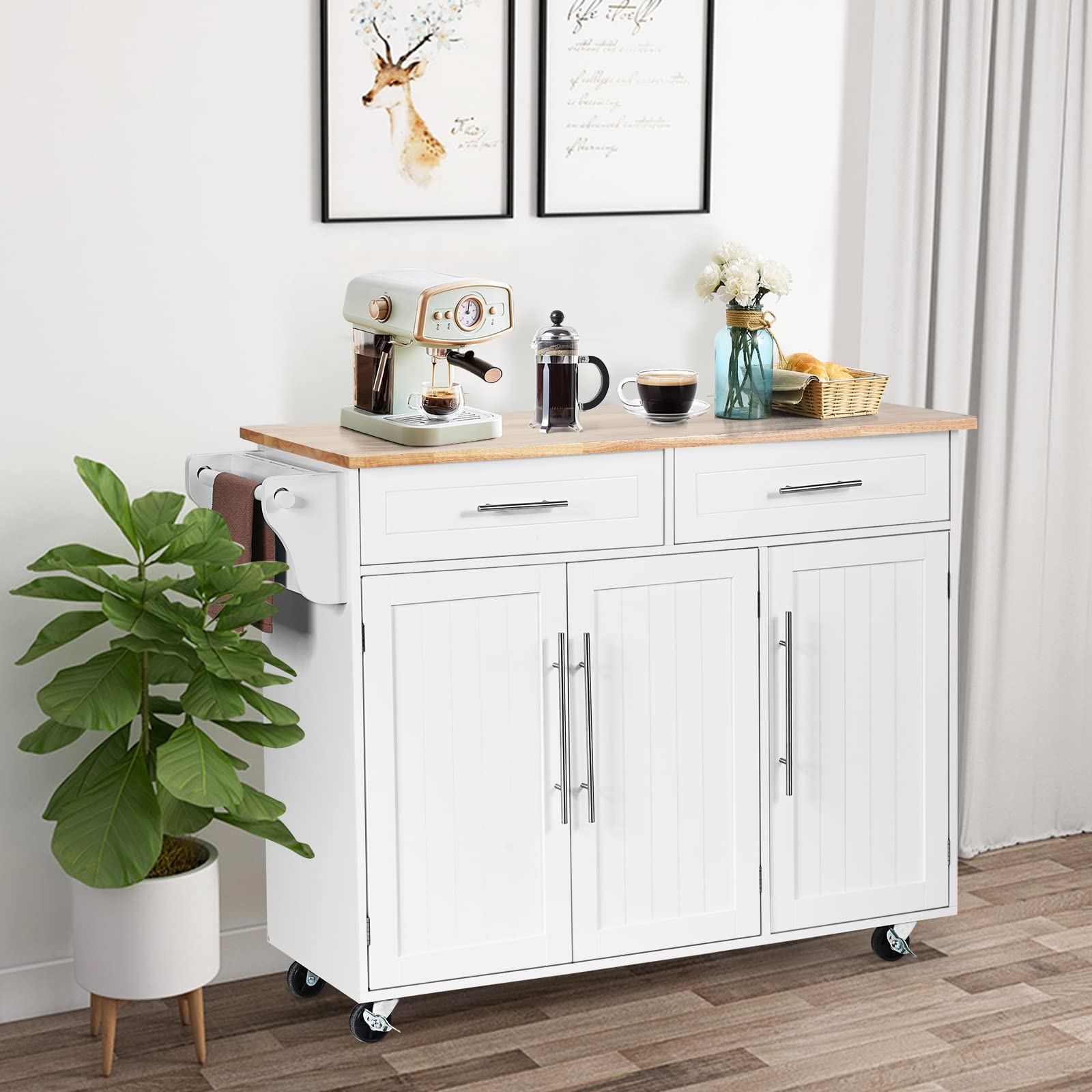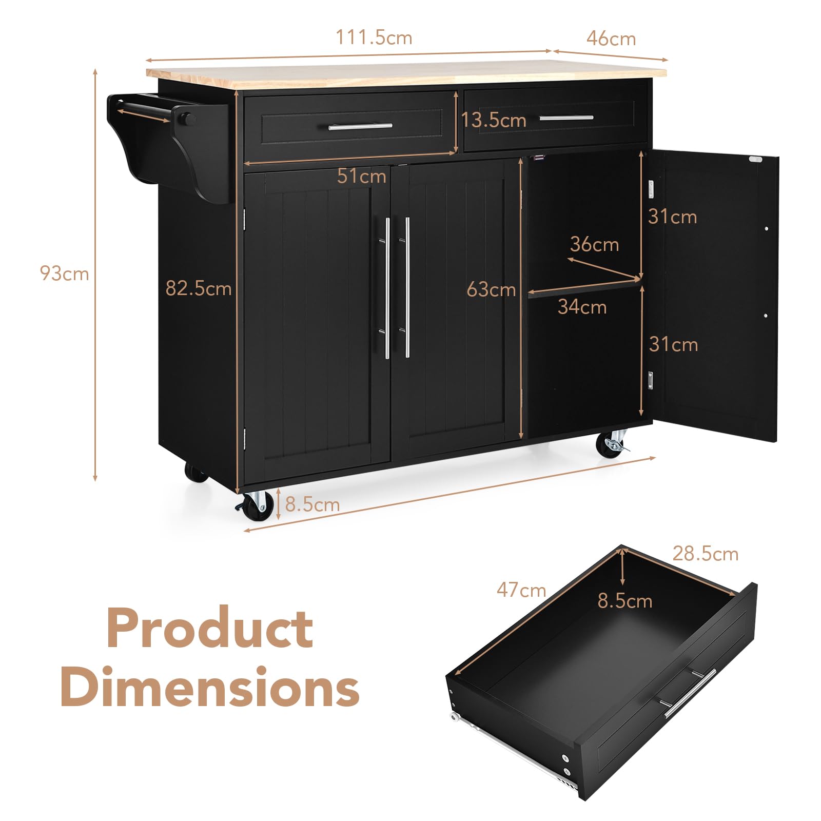 - Practical design: the towel holder and the knife shelf on the side offer space for cloths or fruit knives and also serve as a handle to move the cabinet.