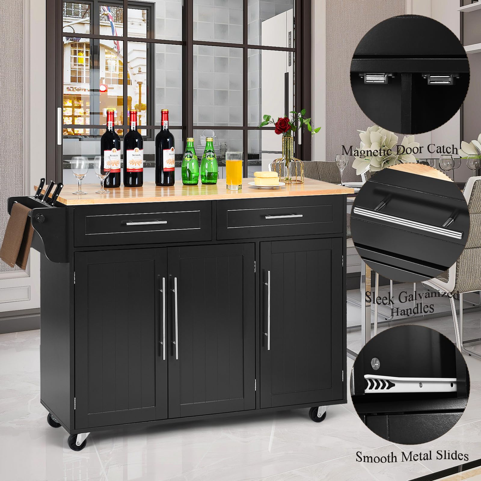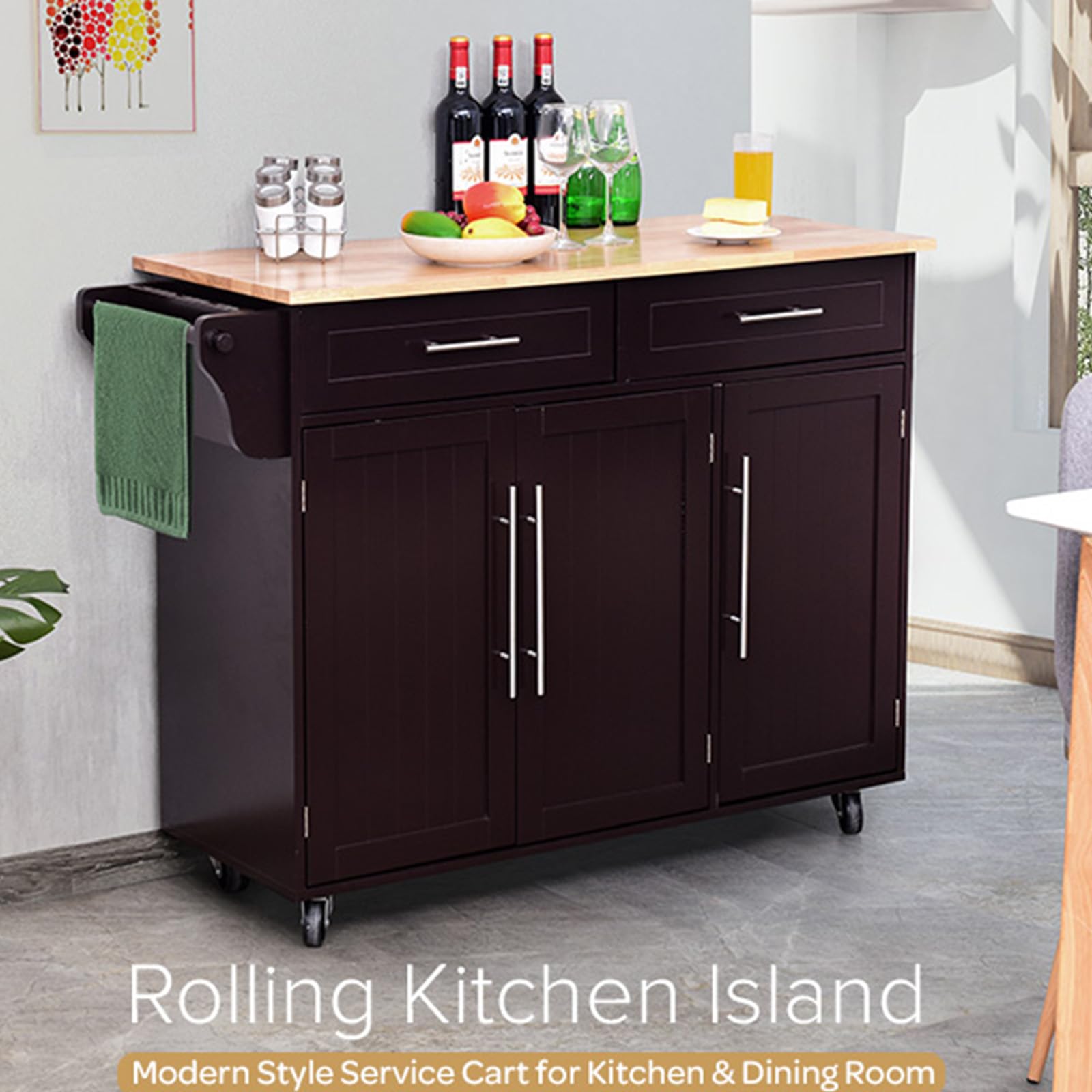 KOMFOTTEU Kitchen Trolley on Wheels, Wooden Serving Trolley with Worktop, Kitchen Island with Drawers, Towel Holder & Adjustable Shelves, Kitchen Cabinet Side Trolley Mobile 122 x 46 x 92 cm (Black)
