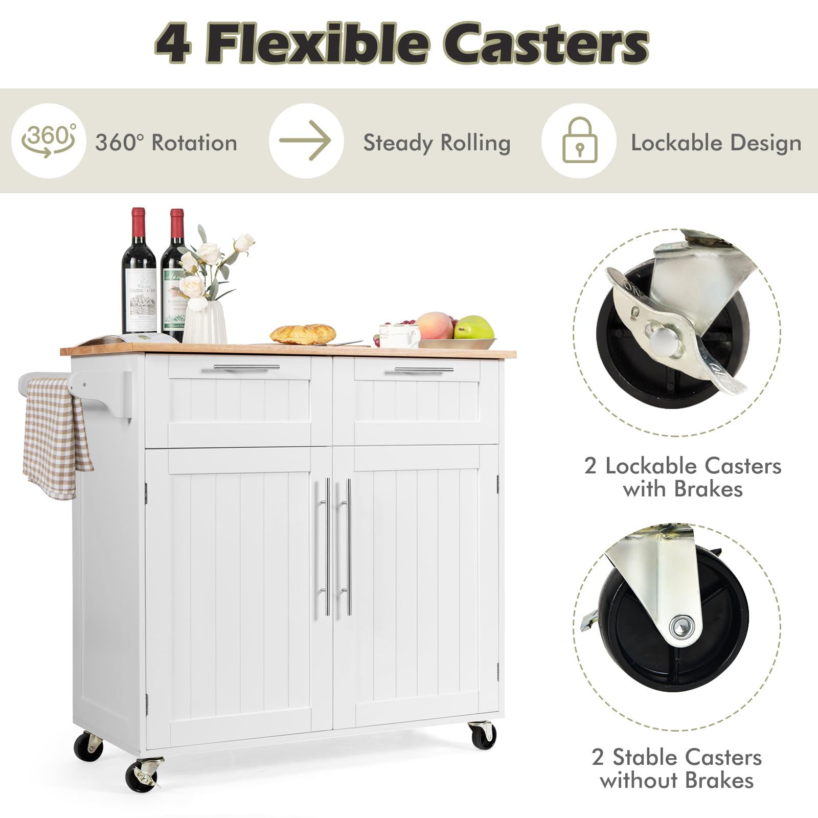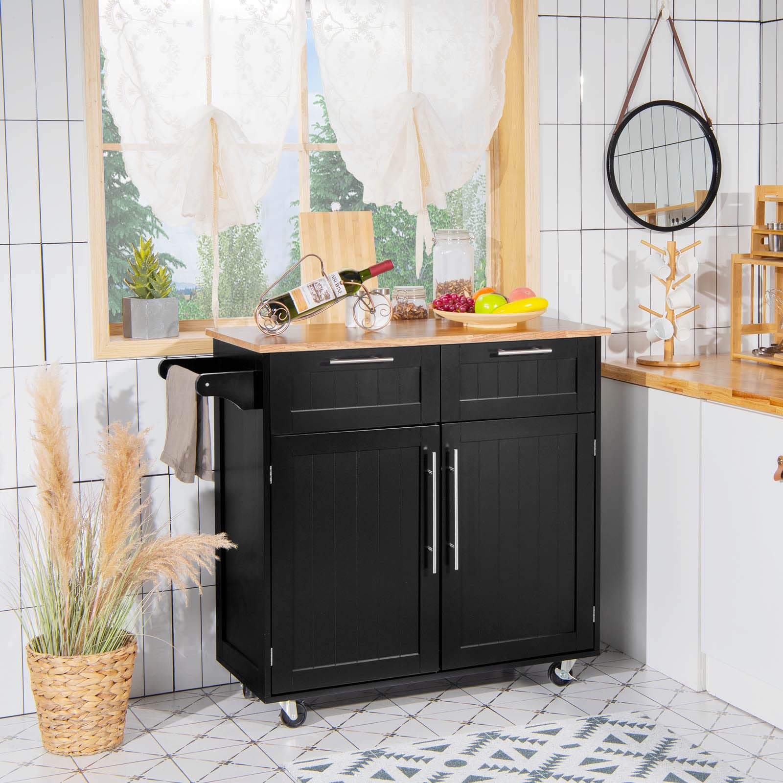 KOMFOTTEU Kitchen Trolley with Worktop, Kitchen Island with Wheels, Serving Trolley with 2 Drawers and Doors, Large Wooden Trolley 94 x 45.5 x 94.5 cm (Black)