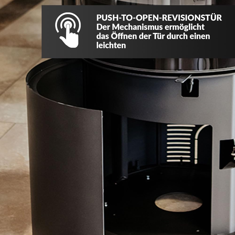 - User Convenience The oven is equipped with a removable cast iron grate and an ashtray that make it easy to keep clean. Thanks to the clean glass system (air baffle), soot accumulation is reduced. The stove has an elegant and comfortable push handle.
