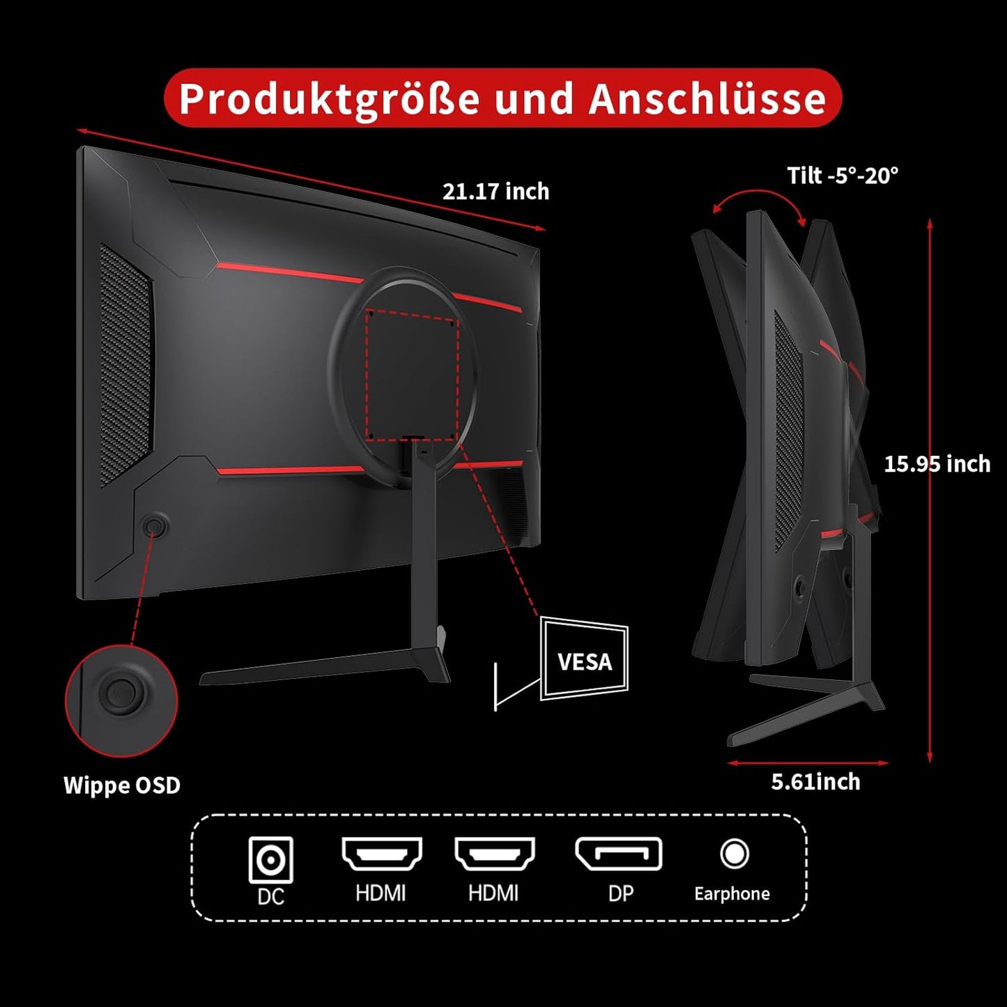 - Ergonomisches und elegantes Design: Unterstützt VESA-Montage 100*100mm, -5°-20°(±3°) Neigungswinkeleinstellung, Sie können die beste Position des monitor curved frei wählen.