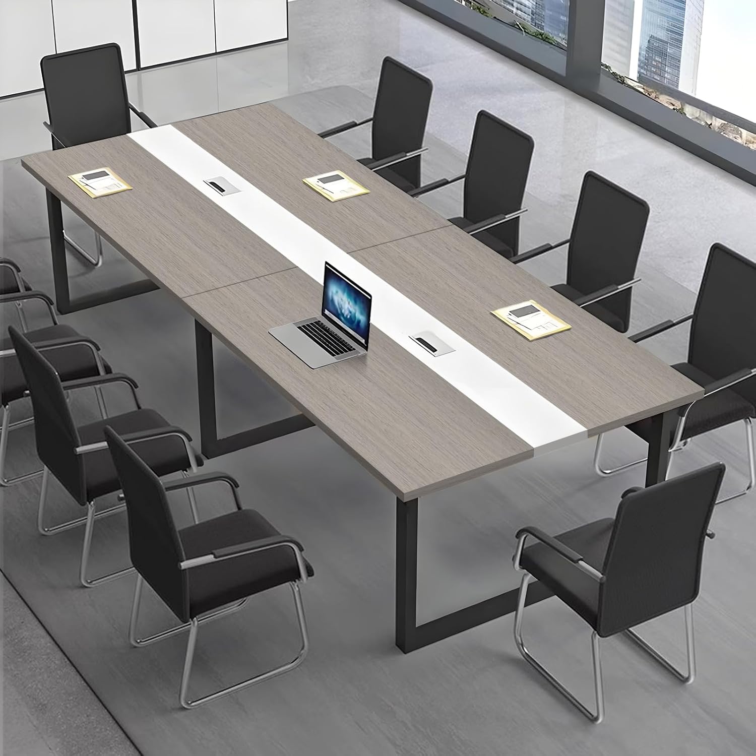 Large Conference Table, Modern Meeting Table with Cable Channel and Black Metal Frame for 8-12 People, Rectangular Seminar Table for Office, Conference Room