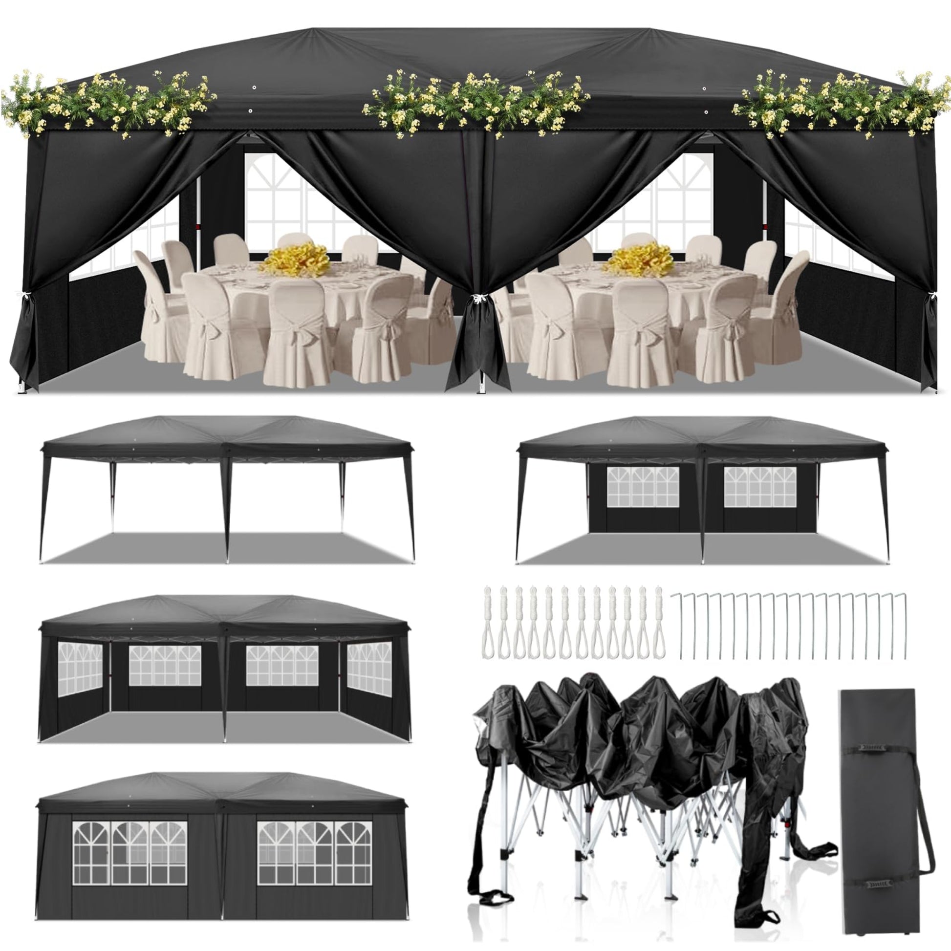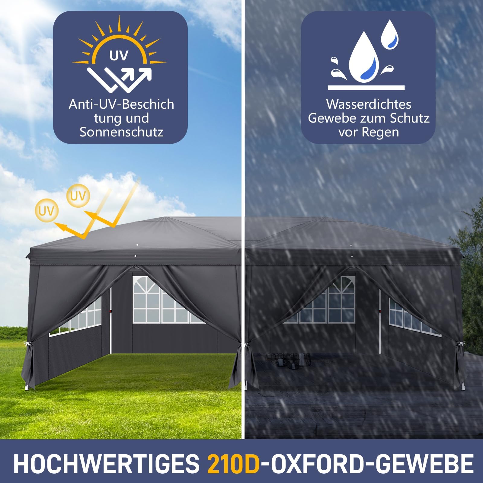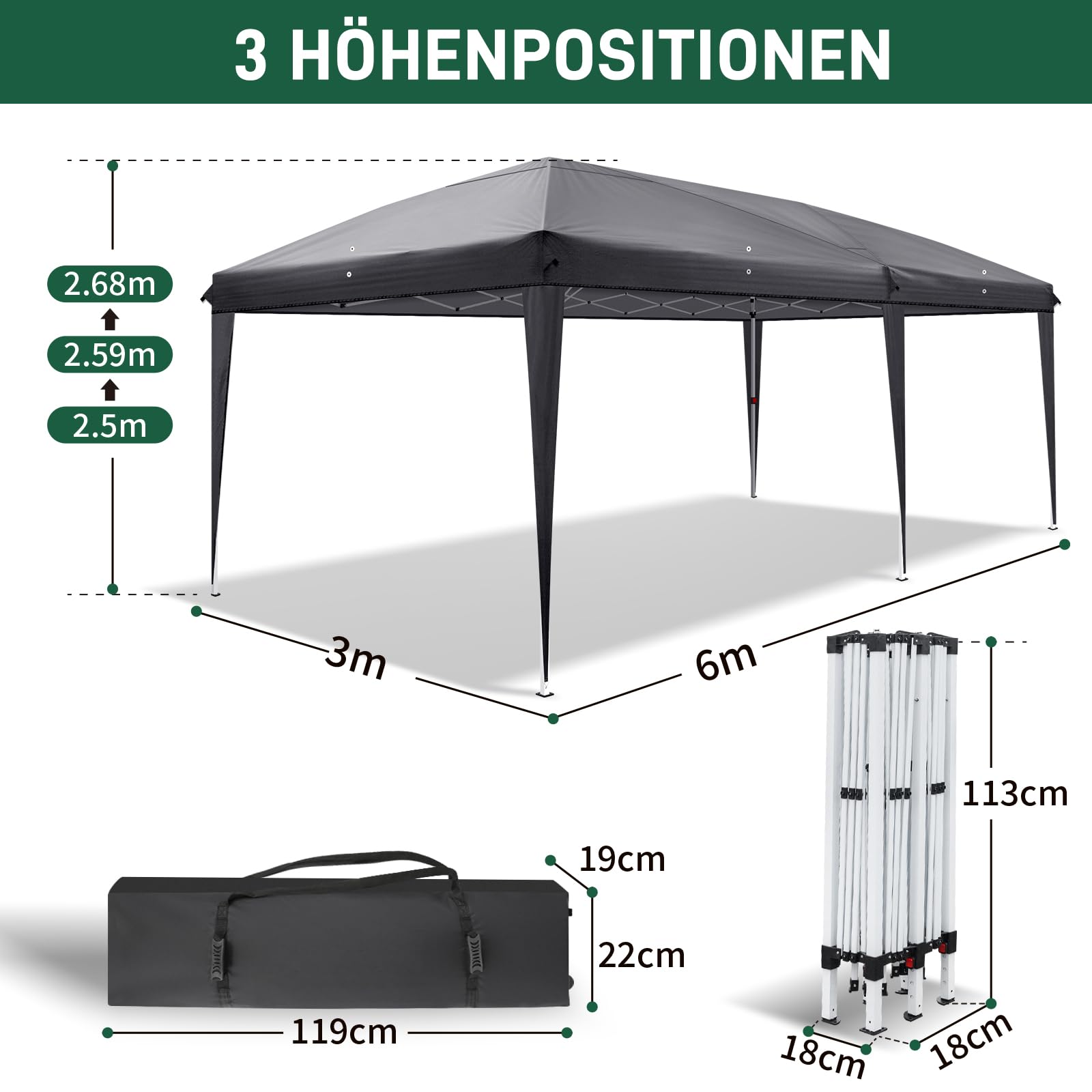 LEADZM Gazebo, Folding Gazebo, 3 x 6 m, Pop-Up, Waterproof, Winterproof, Height Adjustable, UV Protection 50+, Garden Tent, Party Tent, Steel Frame, with 6 Side Panels, for Garden, Party, Camping,