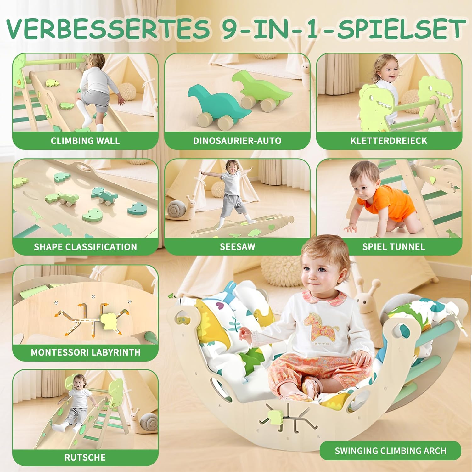 - 9-in-1 Montessori climbing frame set has been specially designed for toddlers aged 1 to 3 years and extends your child's fun. The climbing frame includes nine functions: shape sorting, Montessori maze, seesaw, climbing triangle, climbing arch, swing arch, climbing ramp, slide and play tunnel. Ideal for indoor playgrounds, it provides toddlers with a safe space to discover.